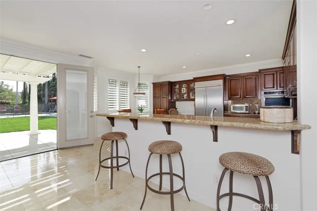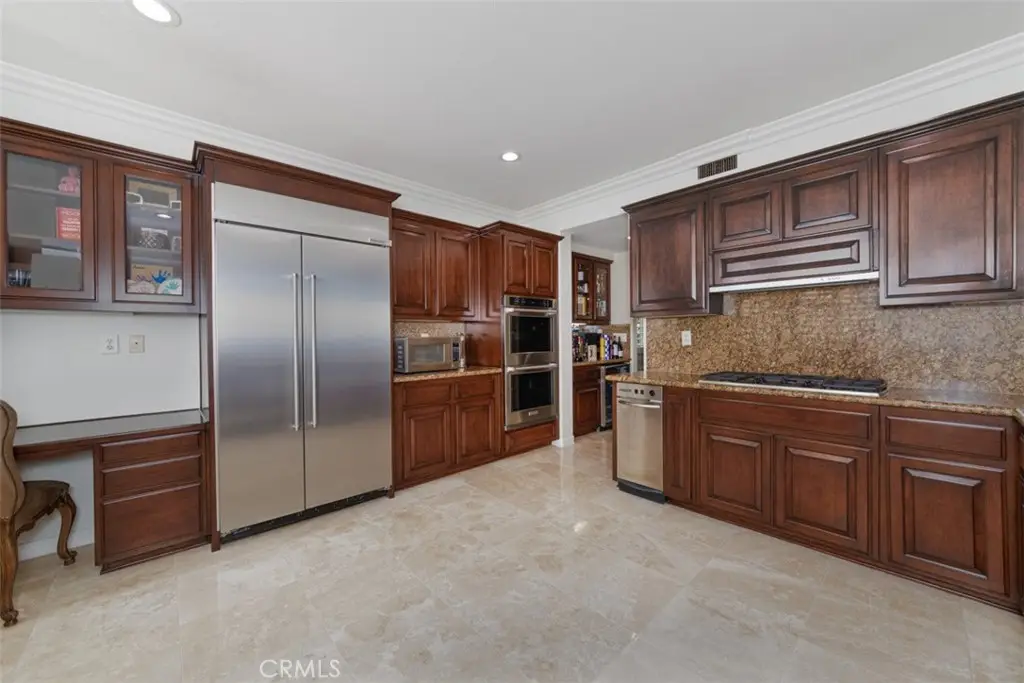 As soon as you enter, you're welcomed by a grand two-story foyer that sets the tone for the home's open and inviting layout. The main level showcases beautiful hardwood and travertine flooring, plantation shutters, crown molding, and wainscoting in the living and dining rooms. The family room features built-in surround sound, complemented by outdoor speakers that extend the entertainment experience to the backyard. The gourmet kitchen offers newer KitchenAid appliances, an oversized walk-in pantry, and a bright breakfast nook. A downstairs en-suite bedroom and a laundry room complete this level.