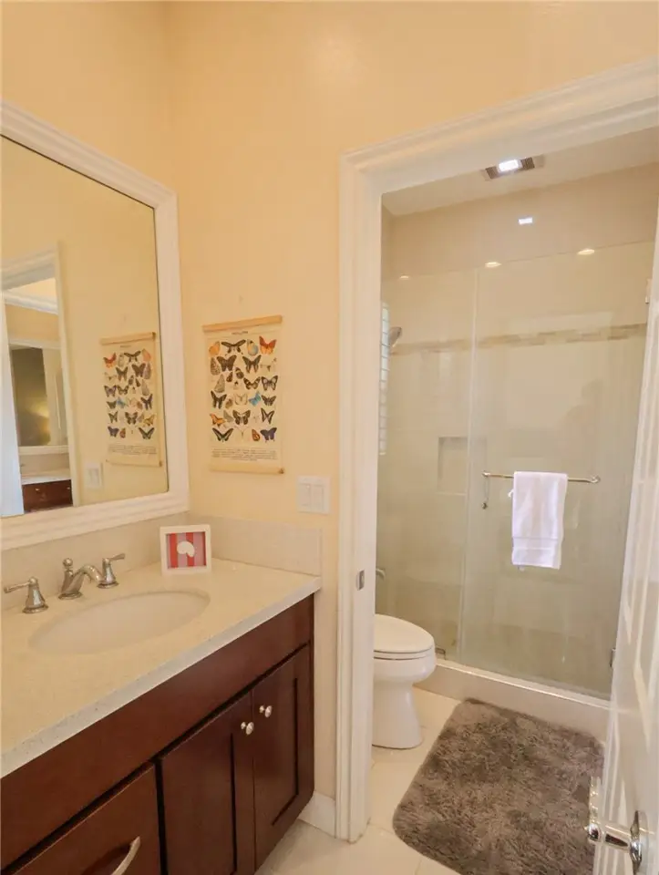This meticulously designed five-bedroom, four-bathroom home offers an exceptional blend of luxury and function. Upon entry, you are greeted by 20-foot ceilings and polished travertine flooring that flows throughout the main level. The floor plan includes formal living and dining rooms, a dual-sided fireplace, and a desirable downstairs bedroom with a full bathroom. The gourmet kitchen is appointed with granite countertops, a massive center island, and a butler's pantry, opening to a spacious family room. A circular stairway leads to the second level, which hosts three full bathrooms and four additional bedrooms, including the expansive master suite. This private retreat features a large walk-in closet, a separate tub and shower with dual sinks, and a private balcony with a gorgeous view. The property is complete with a built-in backyard BBQ, a putting surface for recreation, and a three-car tandem garage for ample parking and storage.