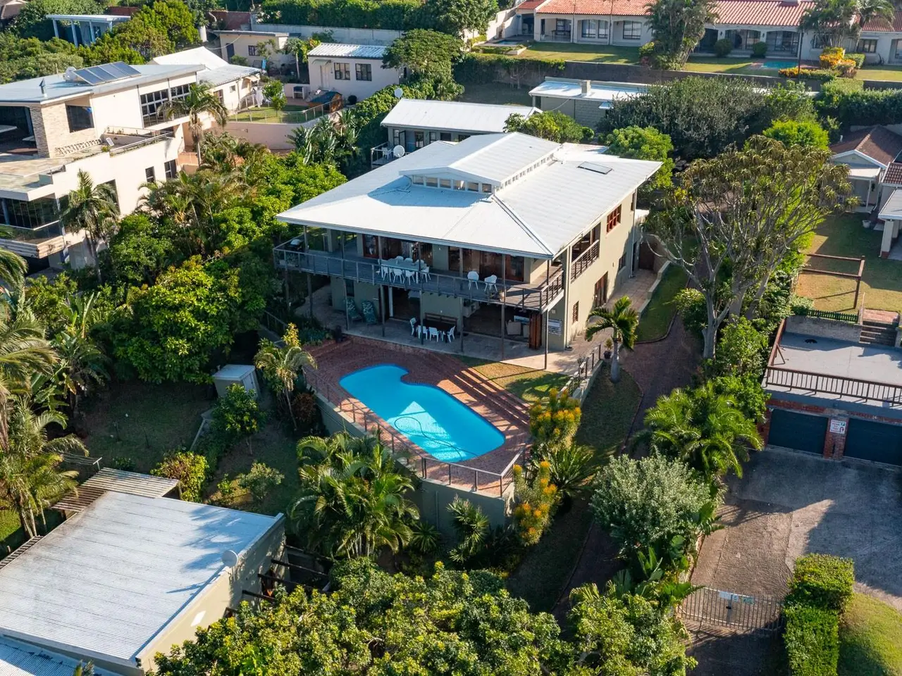 Exclusive to Chas Everitt - Offers from R999,999! Welcome to this exquisite 5-bedroom, all en-suite home nestled in a highly sought-after location, offering breathtaking panoramic views of the beach, ocean, meandering lagoon and lush coastal forest. As you enter the home, you are greeted by an impressive double-volume entrance hall which leads to a spacious open-plan living area, perfect for entertaining guests or spending quality time with loved ones. The living area flows seamlessly to a large balcony, providing an outdoor oasis to relax and take in the stunning views. The kitchen is the heart of this area and offers breathtaking views with ample cupboard space. The dining area is conveniently located adjacent to the kitchen, for complete ease when entertaining. The home boasts five luxurious en-suite bedrooms, each thoughtfully designed with stunning finishes and fittings. The bedrooms offer ample space and privacy, ensuring a restful night's sleep. The upper level of the home features 2 generous bedrooms, both of which enjoy doors leading out to the wrap-around balcony. Downstairs you will find an additional 3 bedrooms, one of which has stacking doors leading out to a patio and the inviting pool just beyond. The generous lower level of the home further comprises an open-plan living area with a generous kitchen and laundry. The lounge features stacking doors offering an excellent transition to the comfortable outdoor entertainment areas. The lower level of the home can be closed off completely and has been a very successful short-term rental property. In addition to the main home, there is a separate 2-bedroom flatlet at the bottom of the property, perfect for accommodating guests or generating rental income. There is also additional accommodation available adjacent to the double garage, providing further income generation or ample space for a home office or gym. A spacious domestic quarters are located at the top of the property with a useful storeroom attached to it. The property is beautifully maintained with a sparkling pool and indigenous gardens, creating a serene and tranquil atmosphere. The home is fully secured with state-of-the-art security features, providing ultimate peace of mind. This luxurious home is ideally located, offering easy access to local amenities and the popular Main Beach and the lagoon. Don't miss out on the opportunity to own this stunning property and start living the luxurious coastal lifestyle you deserve.