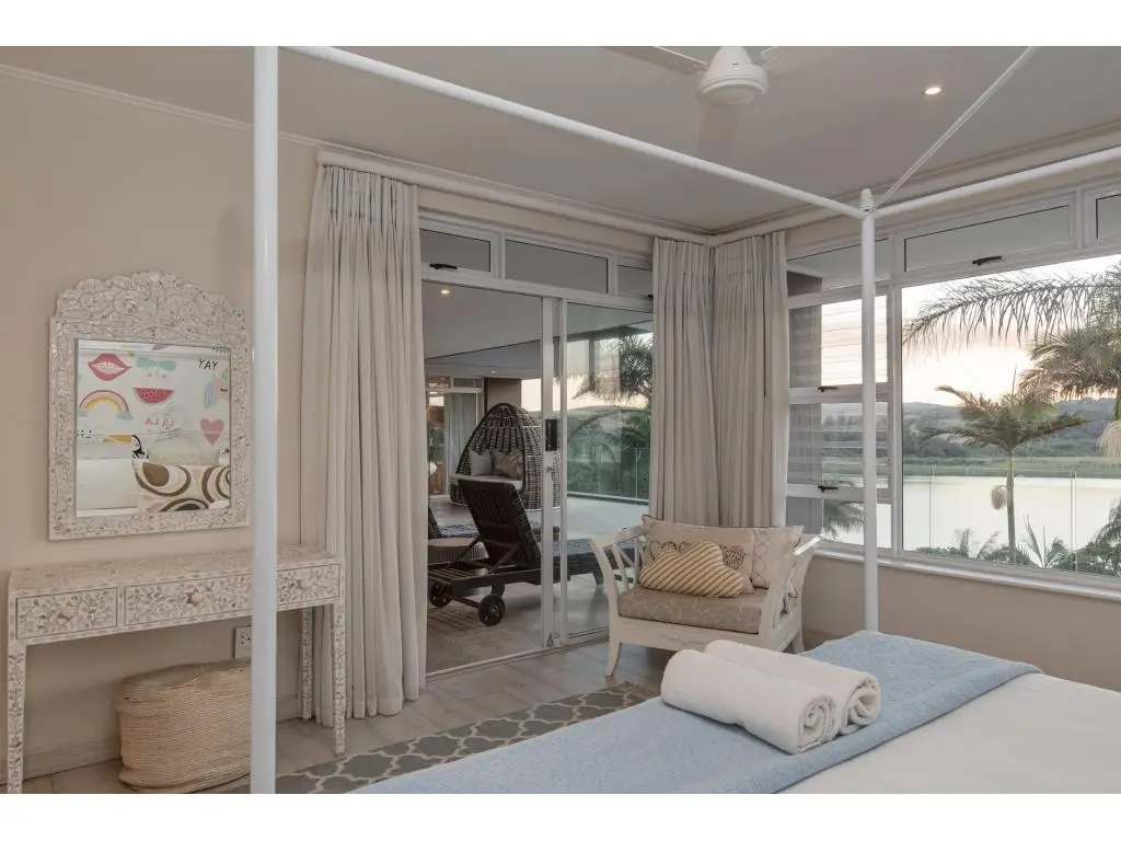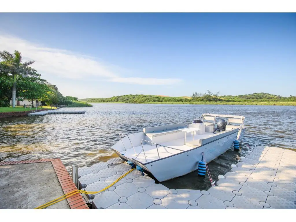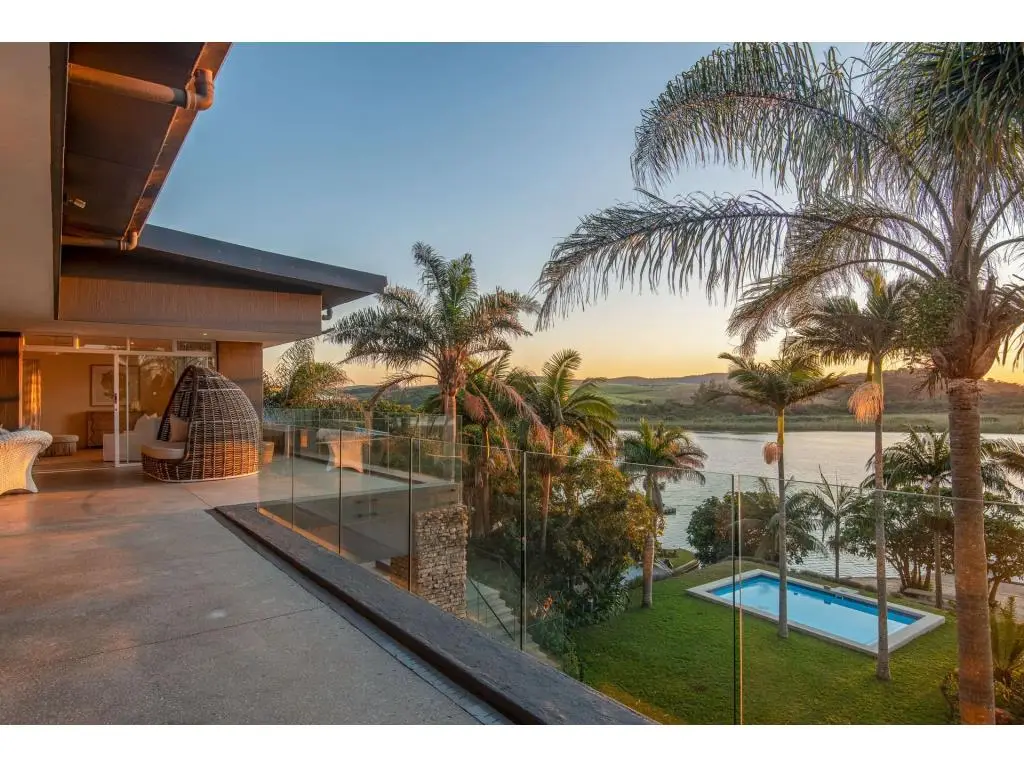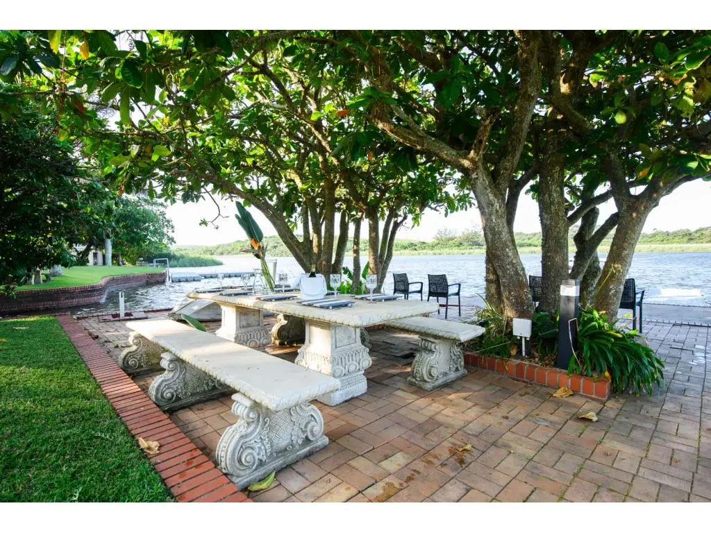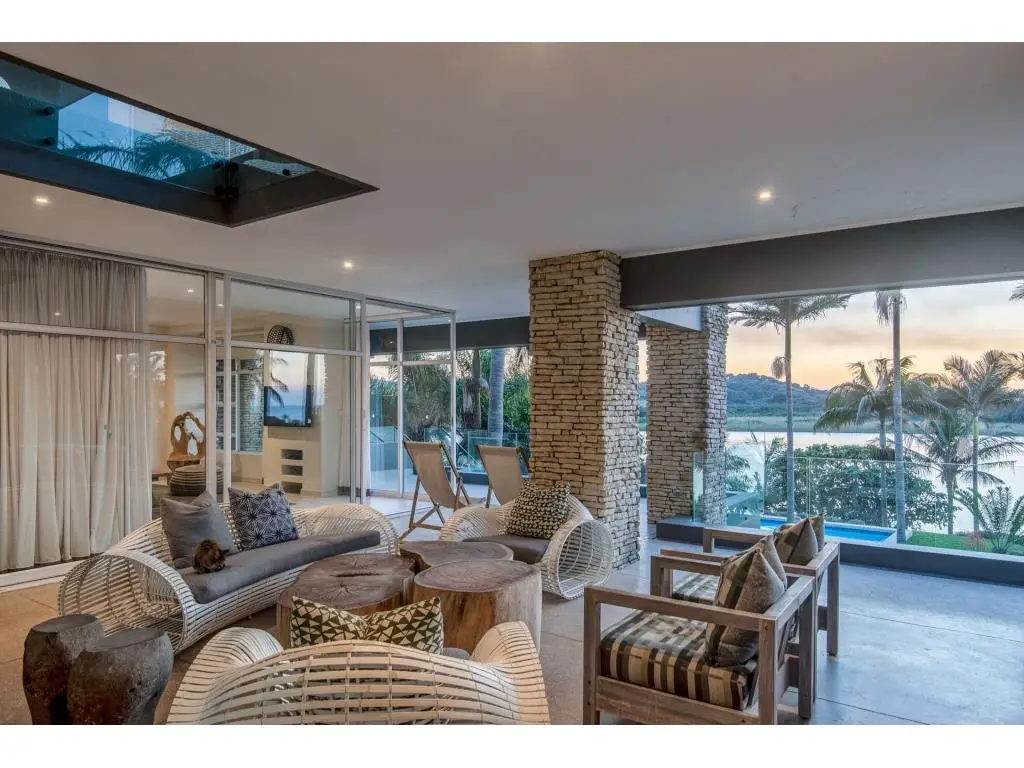 Exclusive to Chas Everitt - Welcome to an extraordinary lagoon-front estate that epitomises luxury and elegance. This once-in-a-lifetime property offers breathtaking views, unparalleled comfort, and exquisite design, perfect for those seeking an exceptional lifestyle. Fit for royalty, the Princess Charlene of Monaco occupied this property for 3 months whilst on an extended visit to South Africa. Grand Entrance As you enter the home, a magnificent, grand entrance hall greets you, featuring a broad staircase that elegantly divides the house into its upper and lower levels. Ascend the staircase to find the luxurious sleeping quarters, or descend to the expansive living areas designed for entertainment and relaxation. Upper Level The upper level houses four beautifully appointed bedrooms. The main bedroom is a sanctuary of indulgence, boasting an en-suite bathroom complete with a freestanding bathtub, double basins, double alfresco showers, and a private toilet. One additional bedroom enjoys a full en-suite bathroom, whilst the remaining two bedrooms share a spacious full bathroom, ensuring comfort and privacy for all residents. All of the bedrooms offer doors leading out to a generous covered balcony which enjoys sweeping lagoon, ocean and coastal forest views. Middle Level The middle level is dedicated to seamless living and entertainment. It features a sophisticated dining area, a cosy TV room for intimate gatherings, and a lively games room for family fun. The front of the home showcases a covered balcony, offering stunning views of the lagoon, while the back of the home includes a protected entertainment area which features a built-in pizza oven and is perfect for year-round enjoyment. The gourmet kitchen is a chef's dream, equipped with a gas hob, electric oven, and extractor. A massive scullery provides ample space for all appliances and additional storage, making meal preparation and clean-up a breeze. Lower Level The lower level is a versatile self-contained flatlet, ideal for guests or extended family. It features a kitchenette, dining area, lounge, en-suite bedroom, and a bunk room with three adult-sized bunk beds. The flatlet also includes a games room and a bathroom with a toilet, basin, and shower. A protected patio overlooks the meticulously maintained gardens and pool area, creating a serene retreat. Outdoor Paradise Step outside to discover an idyllic alfresco dining area at the bottom of the lawn, perfectly positioned to take in the tranquil lagoon views. The property's gardens and pool area are impeccably maintained, offering a lush, private oasis and there is a private jetty on the lagoon for mooring any lagoon-going craft. Additional Features This magnificent property is complete with three garages, a generous carport, ample uncovered parking, a full solar and inverter system, domestic quarters, a comprehensive alarm system, and CCTV for added security. The house is being sold fully furnished and equipped, including two boats and a jet ski, providing the ultimate in luxury living and recreation. Don't miss this rare opportunity to own a truly exceptional lagoon-front estate, where every detail has been meticulously crafted to offer the finest in luxury living.