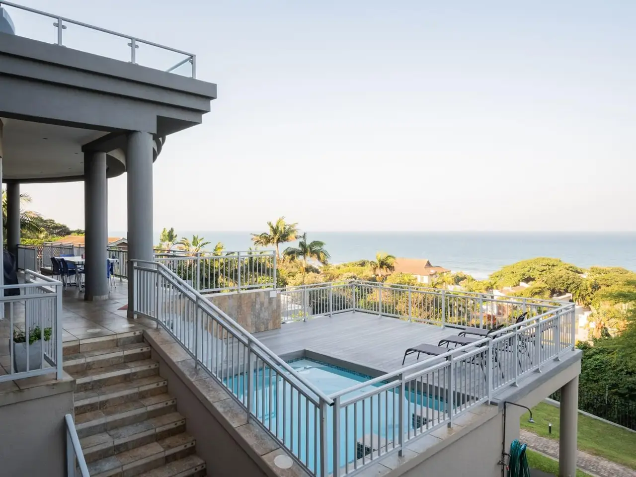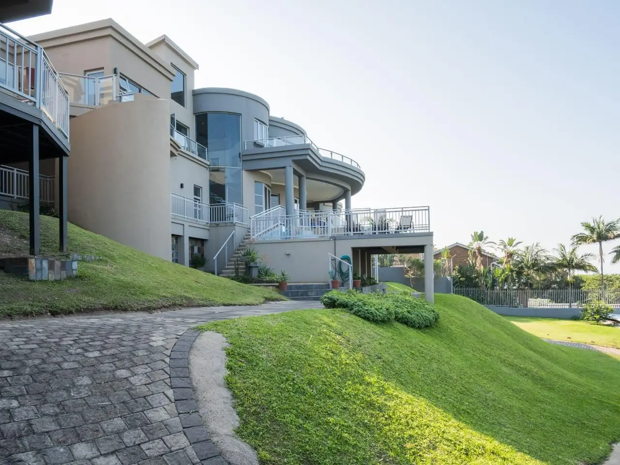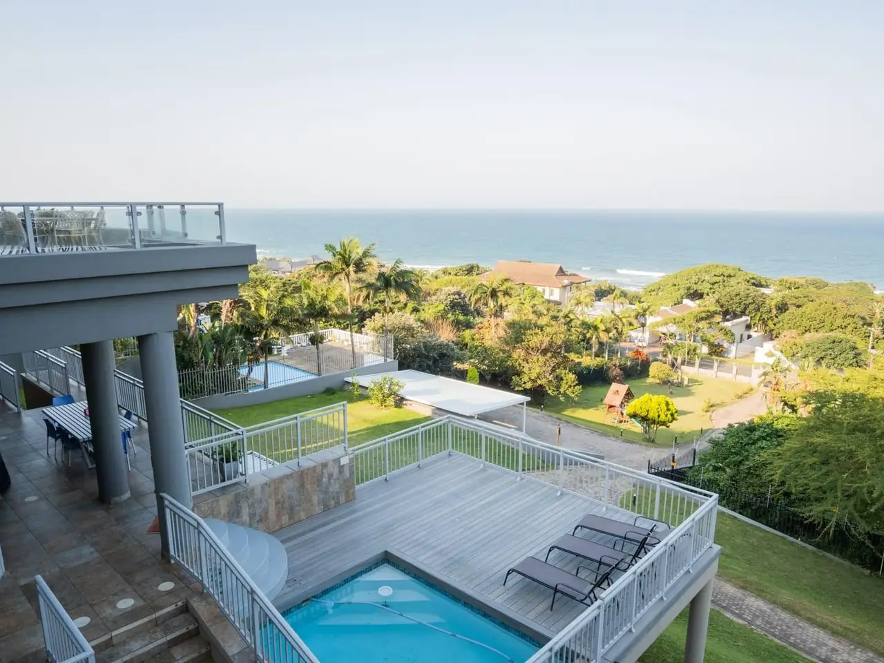 A Simply Breathtaking, One-of-a-Kind Zinkwazi Beach Property! Exclusive to Chas Everitt - An iconic Zinkwazi home, located across the road from the beach, with excellent elevation which ensures views from all 3 storeys of this expansive, 10-bedroom home! The upper level of this commodious home comprises the main kitchen area which also consists of a generous scullery and a walk-in cold room. There is a dining area, spacious lounge and a built-in bar, all of which enjoy uninterrupted ocean views. Stacking doors lead out to a lovely balcony, from which you can enjoy jaw-dropping, 180 degree ocean views. 5 bedrooms are located on this level, including the master suite, which also offers an ocean-facing balcony, an enormous en-suite bathroom and a walk-in wardrobe that can also be used as a strong room. 4 other bedrooms are located on this level, 3 of which enjoy en-suite bathrooms, whilst a "family unit" consisting of 2 bedrooms, shares an interleading, full, en-suite bathroom. An impressive, glass and steel staircase leads from the upper living area to the attractive entranceway of the ground floor. Centrally located, this area flows to the various areas on this level, including an office; the conference room; a massive laundry; 3 separate, en-suite bedrooms and a 2 bedroom, 2 bathroom flatlet which also features a neat kitchenette and a grand living area which also offers stacking doors leading out to a beautiful patio. The inviting pool area is located on this level and offers ample space for loungers and the enticing pool also enjoys gorgeous ocean views! Down a staircase, you will find the gym, which is a spacious room which could serve a multitude of purposes, should a gym not be required. The unique features of this home seem endless, and include; a complete solar solution which can power the entire property; conference room; gym; jacuzzi; air conditioning in all bedrooms; convenient access from either Nkwazi or Glen Drive; a dedicated laundry room; electric fencing; a full alarm system; 2 en-suite domestic rooms; multiple storage rooms; full solar installation; 40,000L water storage; composite decking and aluminium balustrades. This home has been run as a very popular holiday rental property, but would also be ideal for larger families