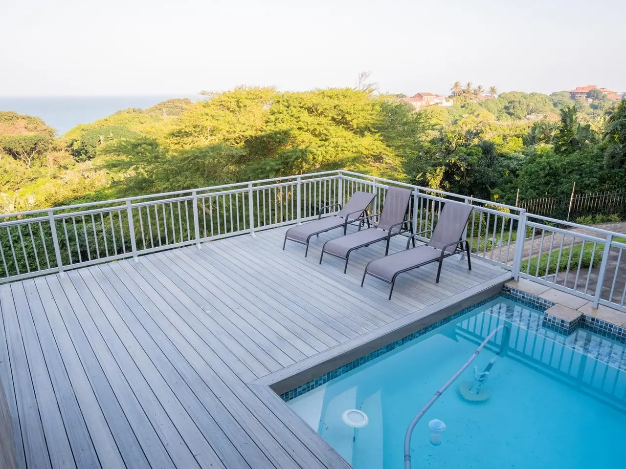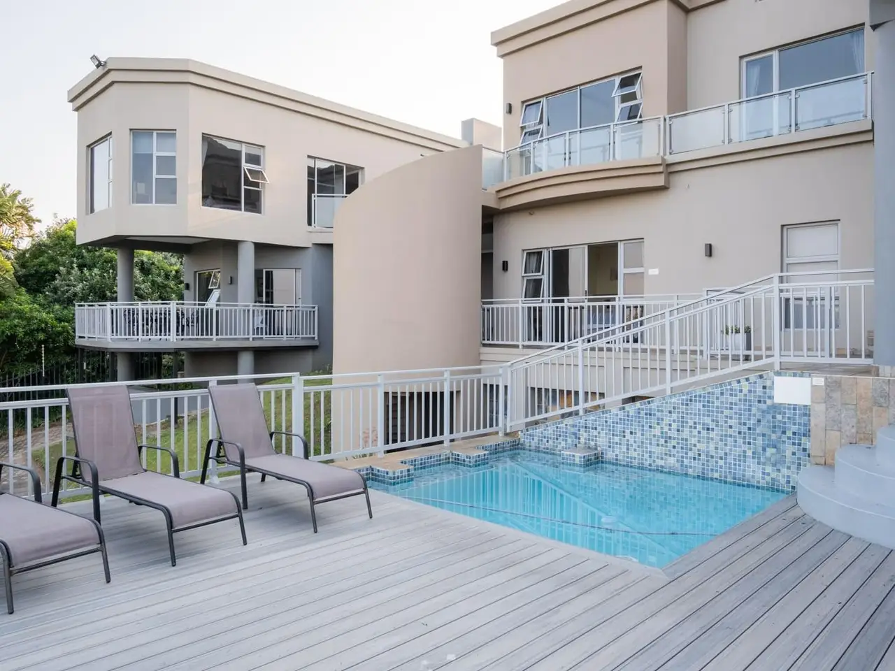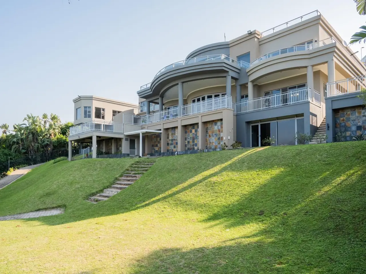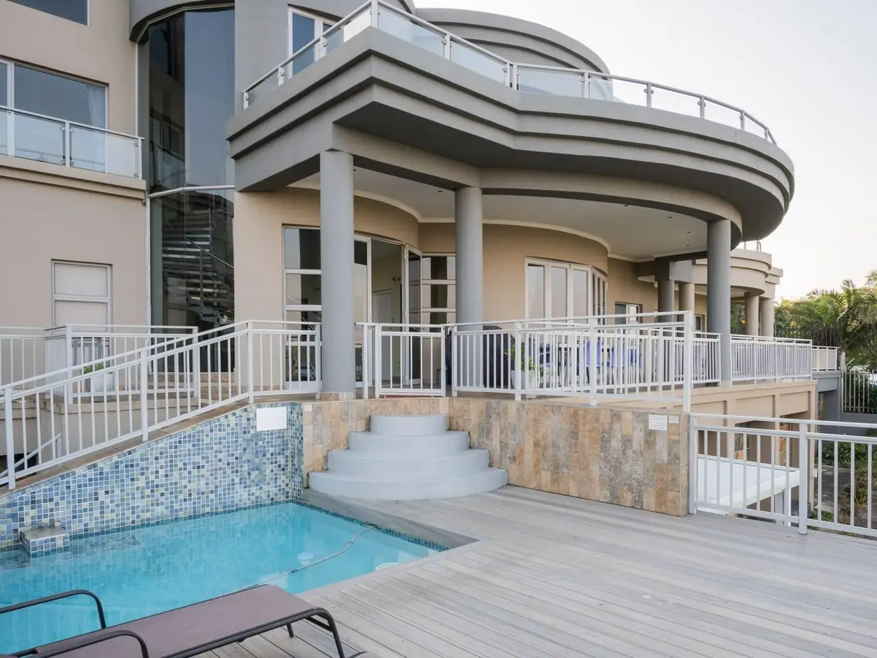 A Simply Breathtaking, One-of-a-Kind Zinkwazi Beach Property! Exclusive to Chas Everitt - An iconic Zinkwazi home, located across the road from the beach, with excellent elevation which ensures views from all 3 storeys of this expansive, 10-bedroom home! The upper level of this commodious home comprises the main kitchen area which also consists of a generous scullery and a walk-in cold room. There is a dining area, spacious lounge and a built-in bar, all of which enjoy uninterrupted ocean views. Stacking doors lead out to a lovely balcony, from which you can enjoy jaw-dropping, 180 degree ocean views. 5 bedrooms are located on this level, including the master suite, which also offers an ocean-facing balcony, an enormous en-suite bathroom and a walk-in wardrobe that can also be used as a strong room. 4 other bedrooms are located on this level, 3 of which enjoy en-suite bathrooms, whilst a "family unit" consisting of 2 bedrooms, shares an interleading, full, en-suite bathroom. An impressive, glass and steel staircase leads from the upper living area to the attractive entranceway of the ground floor. Centrally located, this area flows to the various areas on this level, including an office; the conference room; a massive laundry; 3 separate, en-suite bedrooms and a 2 bedroom, 2 bathroom flatlet which also features a neat kitchenette and a grand living area which also offers stacking doors leading out to a beautiful patio. The inviting pool area is located on this level and offers ample space for loungers and the enticing pool also enjoys gorgeous ocean views! Down a staircase, you will find the gym, which is a spacious room which could serve a multitude of purposes, should a gym not be required. The unique features of this home seem endless, and include; a complete solar solution which can power the entire property; conference room; gym; jacuzzi; air conditioning in all bedrooms; convenient access from either Nkwazi or Glen Drive; a dedicated laundry room; electric fencing; a full alarm system; 2 en-suite domestic rooms; multiple storage rooms; full solar installation; 40,000L water storage; composite decking and aluminium balustrades. This home has been run as a very popular holiday rental property, but would also be ideal for larger families