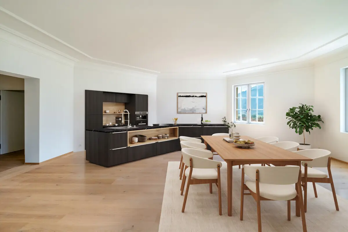 Opportunities to live in a historic castle upgraded to contemporary living standards are exceedingly few and far between. This tower apartment combines centuries-old architecture with modern fixtures and fittings and an impressive sense of scale. Spanning three floors and extending to approx. 324 sqm, the residence unfolds into unrestricted living areas with soaring ceilings, exposed beams and meticulously restored period elements that make this a living experience in a class of its own. The undeniable highlight is the magnificent tower room. With sweeping, 360-degree views over vineyards, landscaped castle grounds and the mountain panoramas of the Grisons, it lends the property a truly exceptional quality that is hard to rival. The kitchen concept will be realised by Boffi – a name synonymous with design excellence of the highest order. The dining area blends harmoniously into the architectural concept. One floor above is the living area, which impresses with its spaciousness and panoramic views. Three elegantly finished bathrooms and four bedrooms complement the spacious layout. The extensive castle park, with its garden pavilion, is available for communal use and affords a serene outdoor retreat, framed by vineyards, mature trees and ancient walls. A stylishly appointed wine-cellar with a dedicated section completes the prospect. The synthesis of heritage architecture, contemporary amenities and high quality, bespoke craftsmanship makes this apartment a true rarity. Its proximity to ski resorts and the surrounding natural landscape further adds to the overall appeal of this distinguished home in the heart of the Grisons mountains. The property - 6.5-room tower apartment - Approx. 324 sqm living space - Premium materials and finishes - Contemporary standard of living comfort equivalent to newbuild - Historic tower room with 360-degree views - Idyllic castle park and garden pavilion for shared use of the residents - Wine-cellar with dedicated section - 2–3 garage spaces Discover our additional properties for sale – a spacious garden apartment with high-end features and an exclusive penthouse loft with a unique atmosphere.