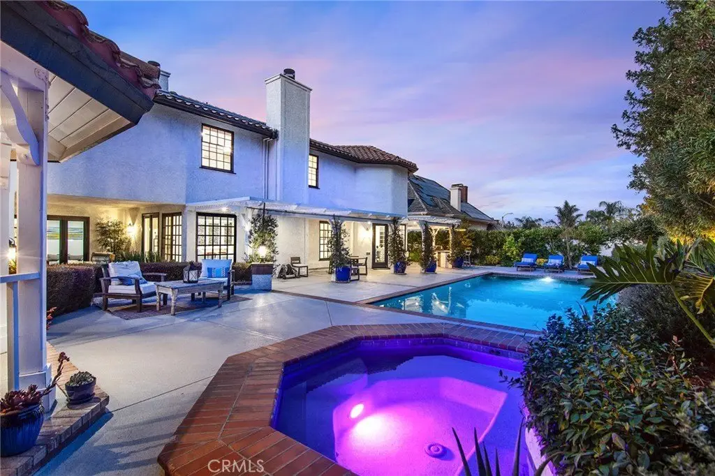 采用 PebbleTec 饰面的波光粼粼的泳池和按摩浴缸
