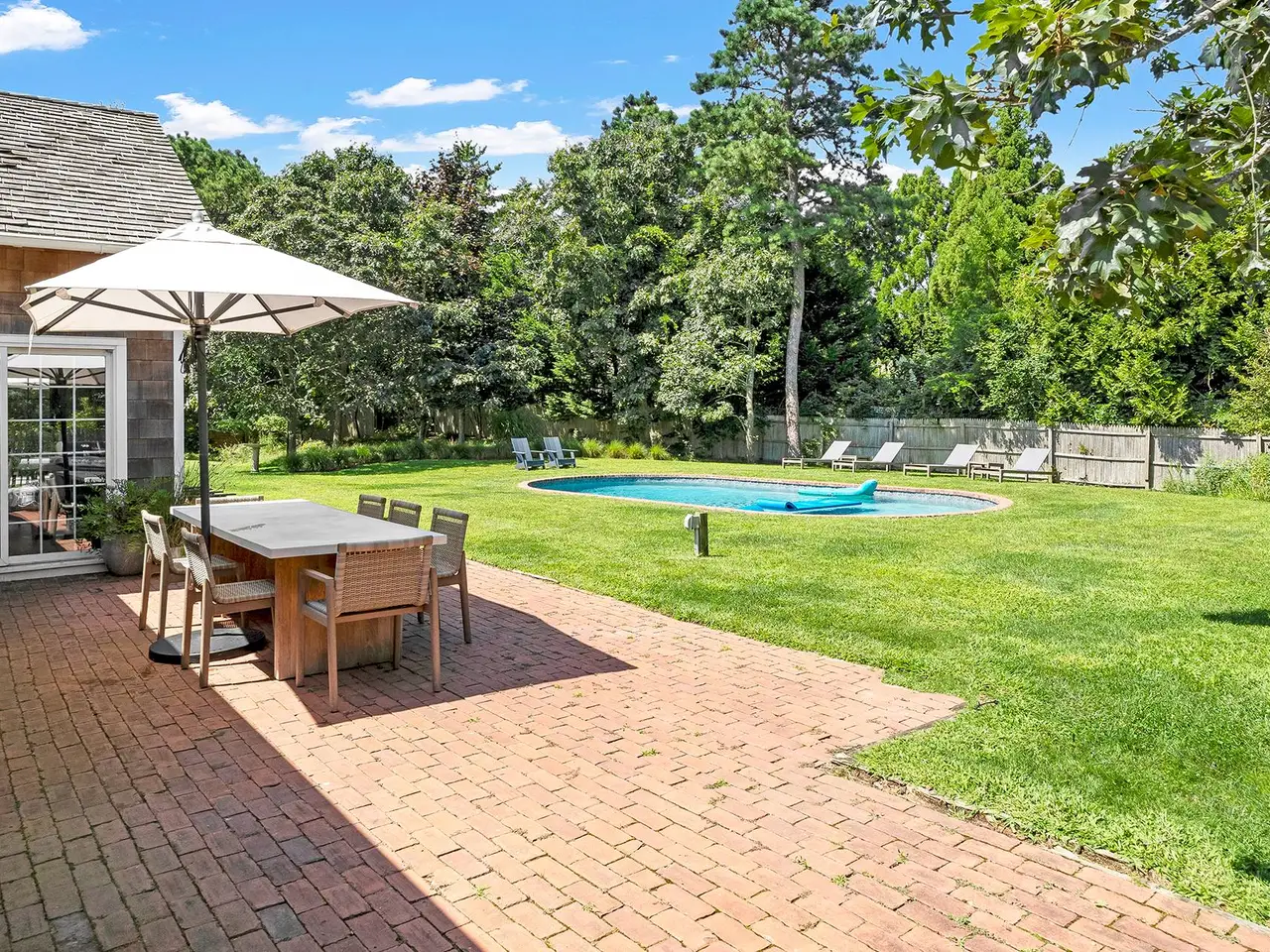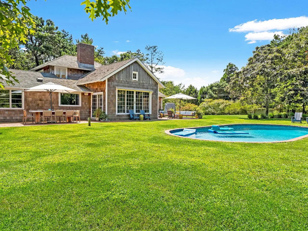 Rental Registry #23-1242 Located in Beach Hampton, Amagansett Dunes on a spacious 0.74+- acre parcel, this very special traditional cedar residence features 4 bedrooms and 3.5 bathrooms across 2,500+- sf of living space. Thoroughly renovated in 2022 with a professional kitchen, stunning marble bathrooms, and new hardwood flooring, the heart of the home is an expansive central living/dining room with a soaring vaulted, exposed-beam ceiling and brick fireplace. Fully open to the sparkling new kitchen, it is flooded with light from a wall of paned windows and sliding doors that lead to the back grounds and pool. A primary ensuite with an original refinished wood-burning masonry fireplace, 3 spacious guest bedrooms, a denTV room, and a dedicated laundry room with a utility sink complete the interior. A large brick patio perfect for dining, lounging, or entertaining overlooks the pool which backs up to mature plantings. With a private Atlantic Ocean beach entrance only one block away, this South of the Highway location also includes beach rights. Beach Hampton is a uniquely magical community of homes set amidst the natural beauty of the dunes and the vastness of the Atlantic Ocean. Great holiday get away, two weeks $30k.