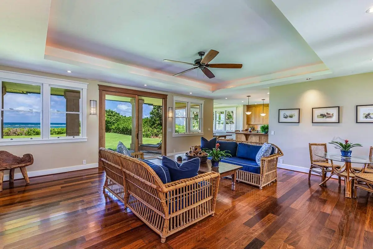 Hale Aliomanu is a private oceanfront estate located on Aliomanu Bay on the Northeast side of Kauai. As you drive in the gate, you enter your own personal retreat of swaying palm trees, the soothing sound of the ocean, lush tropical landscaping and the tranquility of Aliomanu. Enjoy unobstructed ocean views from most all of the rooms. Watch the sun come up from the comfort of your bed or stargaze from your lanai. Walk out your front door and stroll across the lush lawn to one of the most private and year-round swimmer-friendly beaches on the island. This spacious estate features a primary oceanfront residence of well over 3,200 square feet of interior living spaces, five bedrooms and five and half bathrooms. A detached garage/workshop also has a second story suite quarters featuring a 500 square foot studio bedroom and bathroom. The elegance of this estate home is evident everywhere, with Ipe wood floors throughout, split air conditioning system, top of the line kitchen appliances and attention to every detail. This property also has a transient vacation rental license giving the property flexibility in use and income potential. Located on the northeast corridor of the island, you are just a short trip away from the beaches, world class surfing, tennis and golf of Kilauea and Princeville to the North and the shopping and restaurants of Kapaa to the south.
