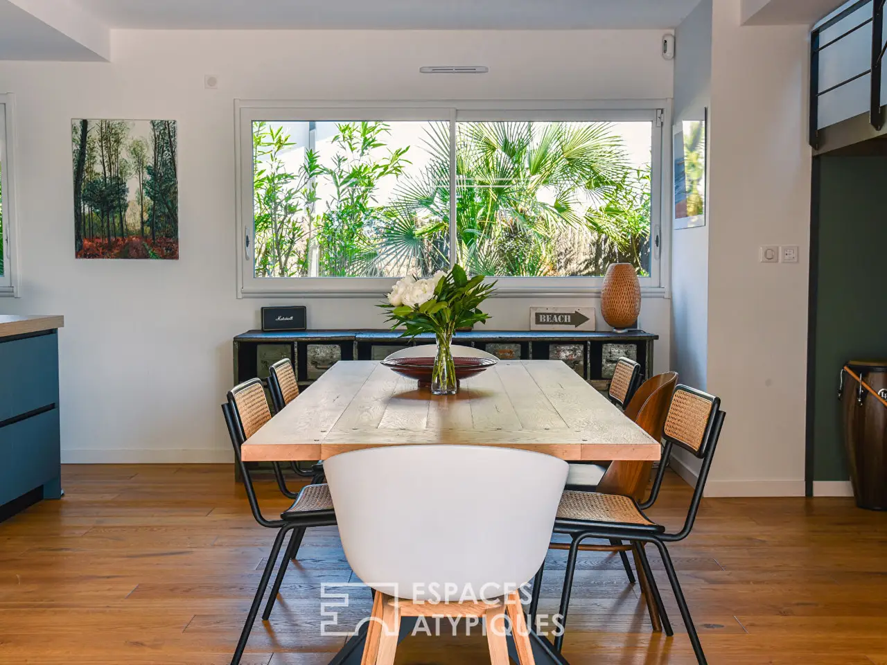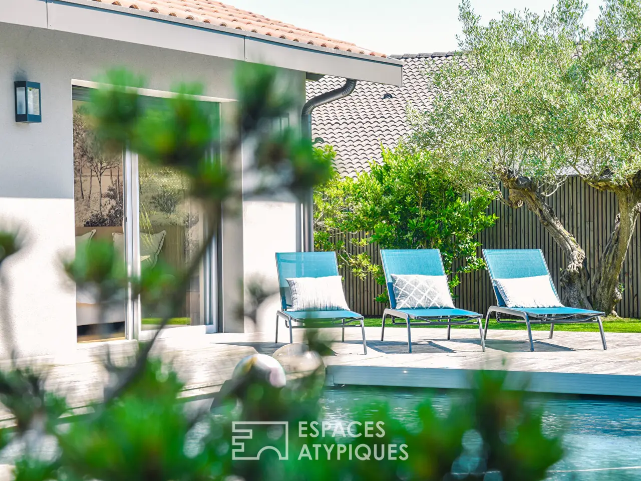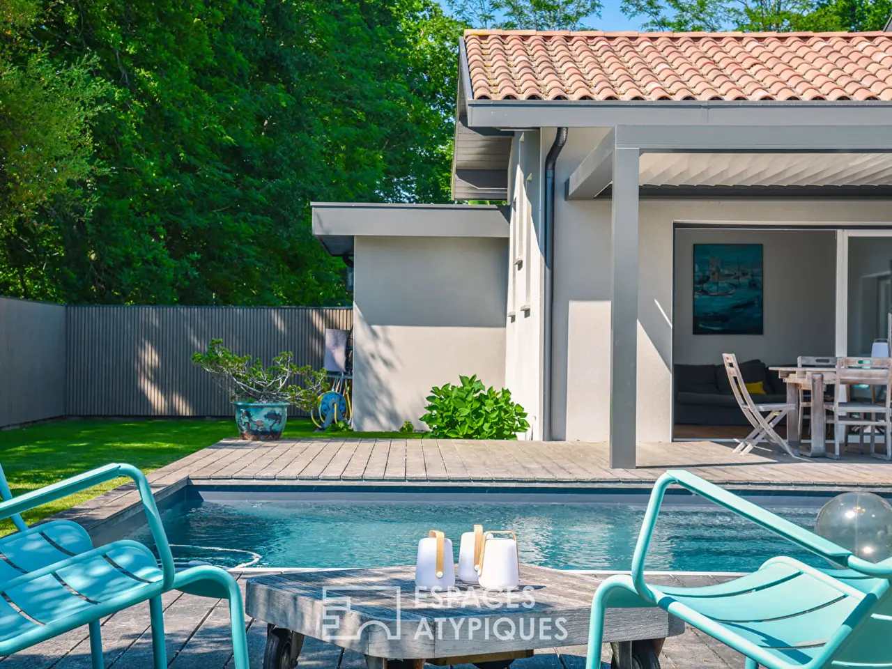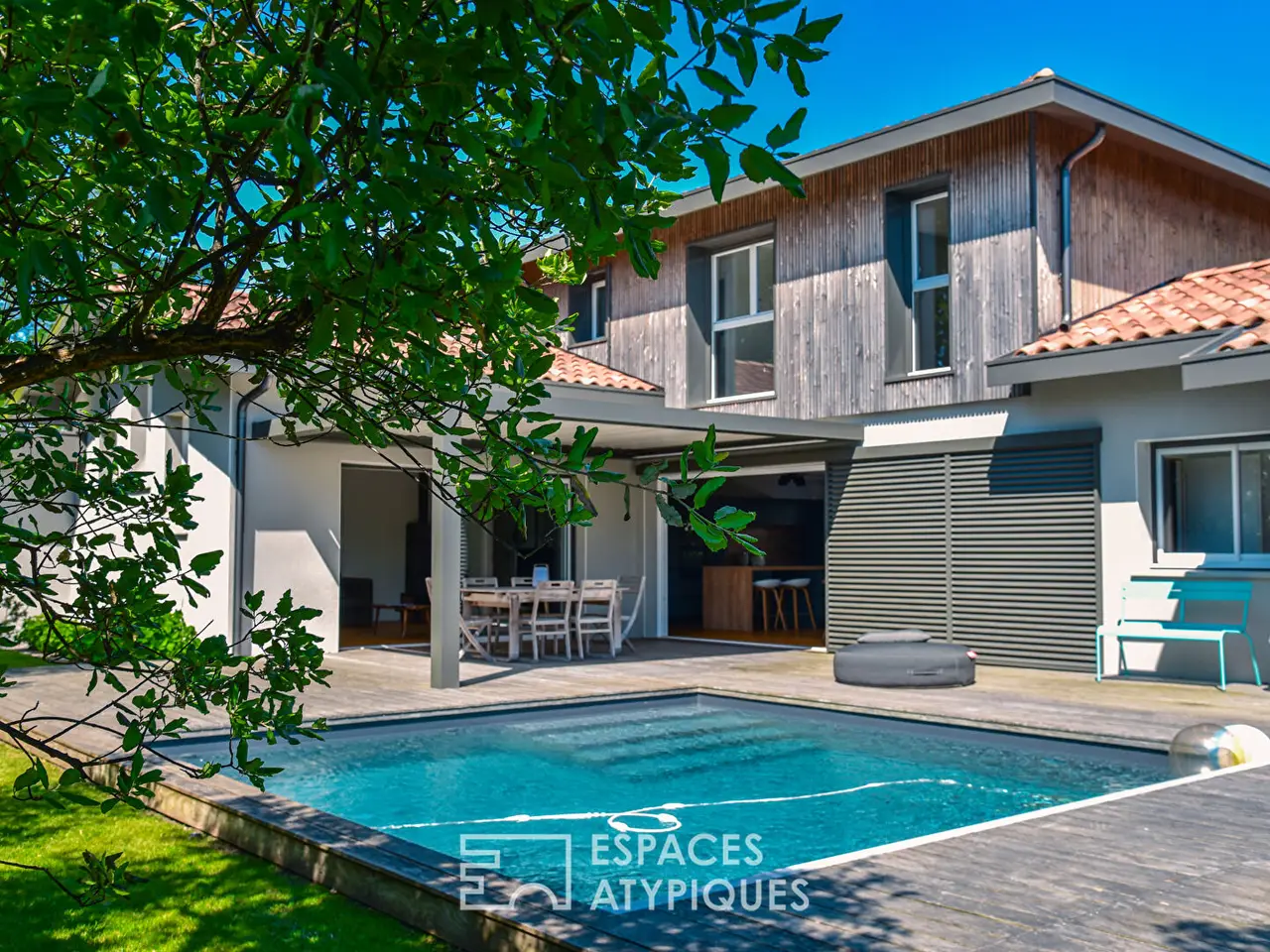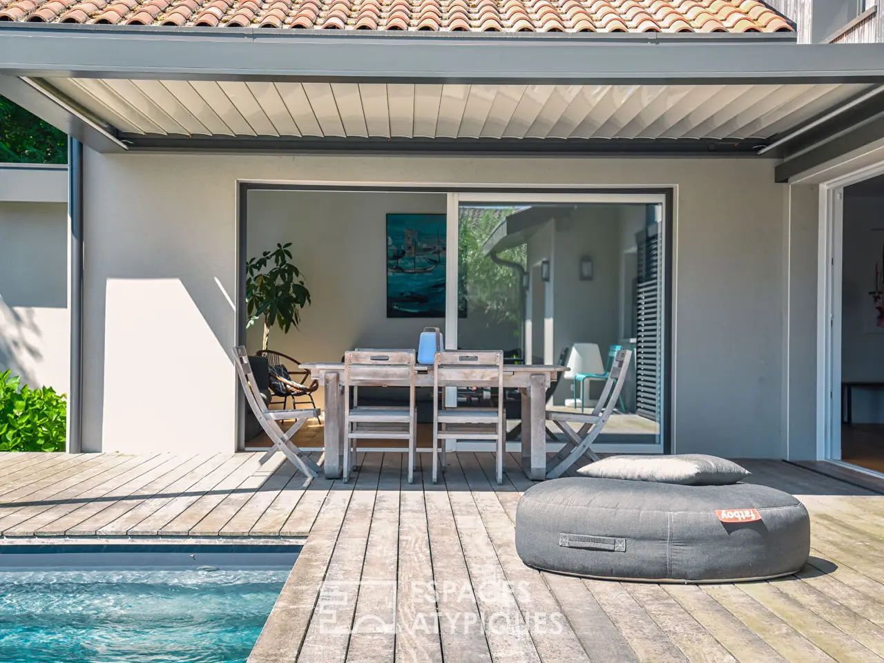 Located in Angresse, this villa designed by an architect combines a high-quality layout with meticulous finishes. Its 180 m² of living space is spread over two levels and offers a functional design for living areas. The entrance sets the tone with custom-made furniture and an oak floor that guides the visit. The living room, with its exposed framework, reveals an impressive ceiling height. Defined by an industrial-style glass partition, its generous volume is shaped by its opening to the outdoors and a modern wood-burning stove. The dining area revolves around a large three-meter sliding bay window, integrated into the wall, creating a seamless transition between indoors and outdoors. This opening enhances the flow of natural light, elevating the living space. The French-made kitchen features high-end fittings: granite countertops and Fenix surfaces. Its welcoming central island opens onto an elegant dining room and a wood-and-metal staircase, a unique masterpiece by a local craftsman. On the night side, a master suite of over 30 m² is located on the ground floor. Its custom-designed dressing room, created by a carpenter, is adorned with white louvered doors and offers generous storage space. From the bed, the view extends to magnificent century-old oaks. The upper floor is dedicated to children and offers two beautiful bedrooms with built-in storage. They share a bathroom with two separate sinks. A relaxation area benefits from optimal sunlight, where the office and library are cleverly arranged. Outdoors, the landscaped garden with Mediterranean species surrounds the house, transforming this urban living space into a little corner of paradise. The exotic wood terrace of over 100 m² completes the uniquely shaped pool. The bioclimatic pergola allows you to enjoy this calm and peaceful environment throughout the day. Just a few minutes’ walk from shops and schools, this resolutely modern villa offers contemporary comfort and undeniable charm for year-round living or as a second home. REF. 9031EALD Additional information: 5 rooms 3 bedrooms 1 bathroom 1 shower room Land area: 783 m² Property tax: €1,887 Energy performance diagnostics DPE: 84 kWhEP/m²/year A 450 GES: 2 kgCO₂eq/m²/year A 80 Agency fees Fees are VAT-inclusive and payable by the seller Mediator Consumer Franchise Mediation www.mediation-franchise.com 29 Boulevard de Courcelles, 75008 Paris Information on the risks to which this property is exposed is available on the Georisques website: www.georisques.gouv.fr