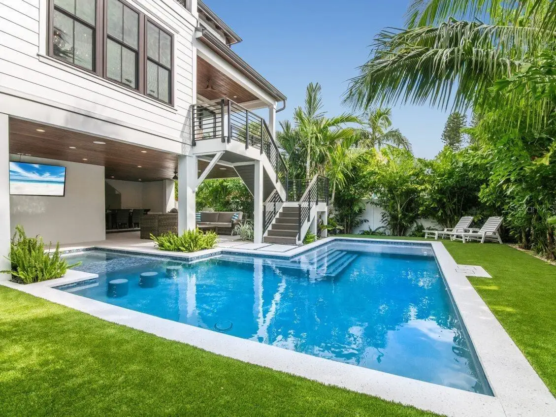 Welcome to Luxe Island Escape, an exceptional 4-bedroom, 4.5-bath coastal retreat nestled in the tranquil heart of Anna Maria Island. This captivating residence is offered fully turnkey furnished - ready for you and your family to immediately embrace the island lifestyle. Designed with thoughtful design and coastal sophistication, the home is surrounded by lush tropical landscaping and features a private heated pool, spa, and an expansive rooftop deck offering sweeping views of both the Gulf of Mexico and Tampa Bay. Inside, a bright, open-concept floor plan awaits, enhanced by soaring ceilings and custom contemporary finishes throughout. The main living level showcases a designer kitchen outfitted with sleek stainless-steel appliances, a striking island, and abundant space for entertaining. The dining area and great room flow seamlessly onto a covered deck, welcoming in the sea breeze and natural light. Also on the main floor are two tranquil guest suites with private baths, offering comfort and privacy for visiting family and friends. Upstairs, the serene primary suite opens to a private deck - an ideal retreat for peaceful mornings and quiet evenings and an extra surprise space for an office or sitting area. M sure you ascend to the rooftop deck for panoramic island views and breathtaking sunsets. Ideally located just a 2-minute walk from the sparkling waters of Tampa Bay and only 5 minutes from the pristine shores of Anna Maria Island's iconic Bean Point, this home offers the ultimate blend of tranquility, beauty, and fun. Currently operating as a busy vacation rental property, Luxe Island Escape presents a rare opportunity for full-time living or a luxurious coastal escape vacation rental. Don't miss your chance - book your private showing today.