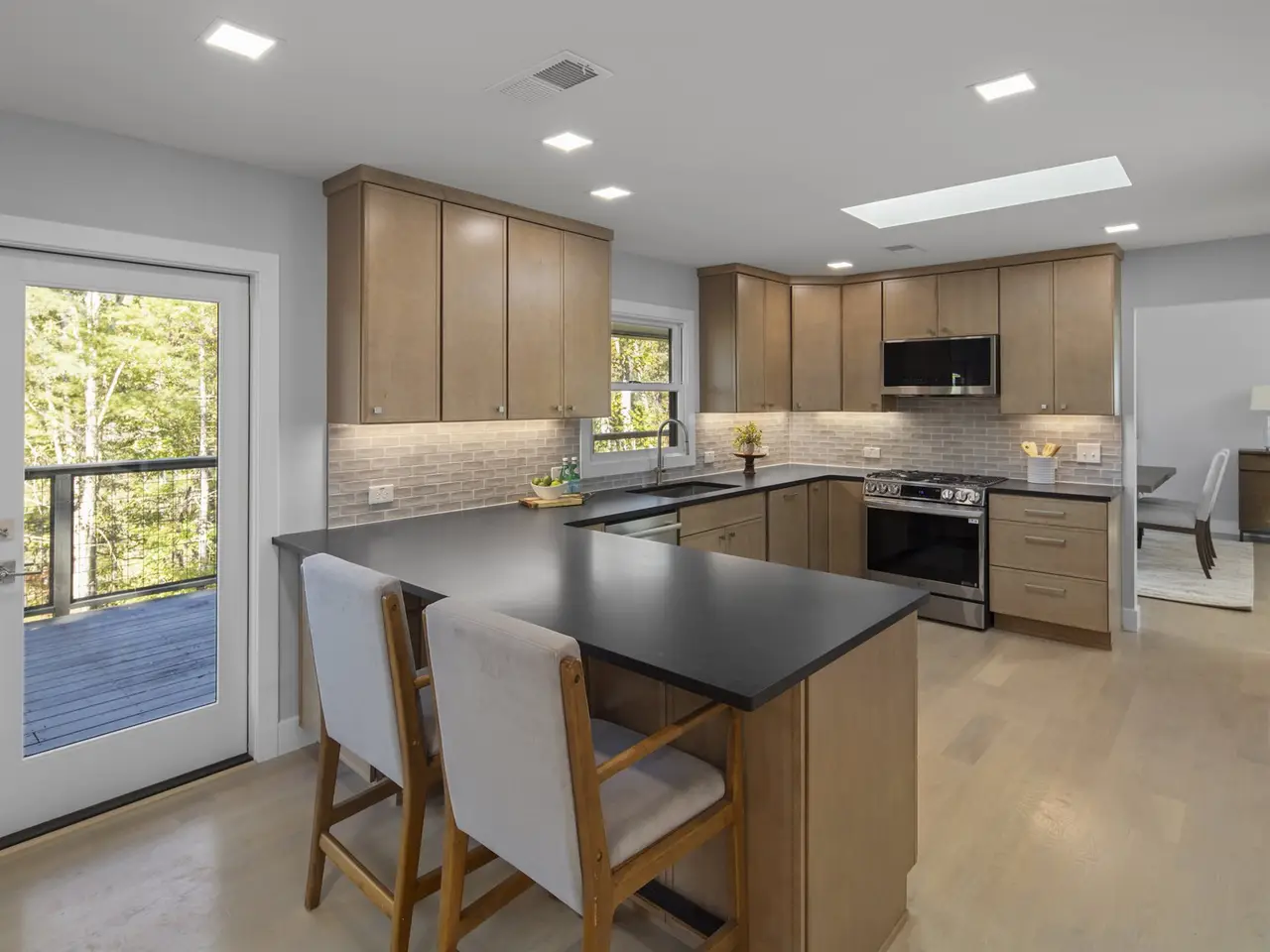 Modern luxury awaits in this meticulously renovated home nestled in peaceful Kimberly Woods. Originally built in the 1960s, this North Asheville gem has been completely reimagined to offer the sophistication and comfort of today's finest homes - at a value you won't find anywhere else in the area. Behind a sleek five-panel mid-century door, a sun-washed foyer with soaring ceilings and skylights hint at the contemporary style awaiting further inside. To your right, a formal sitting and dining room offers an elegant setting for gatherings. The sleek kitchen is a showstopper, featuring brand-new cabinetry, Corian countertops, stainless steel appliances, and a charming breakfast nook that's perfect for morning coffee or casual meals. Rounding out the main level, a comfortable living room centers around an original brick, wood-burning fireplace, creating the perfect place to unwind with a good book. Retreat to the terrace level and discover a true sense of privacy and calm. Here, the primary suite impresses with a sophisticated ensuite, joined by two inviting guest rooms and a versatile den ideal for movie nights or creative pursuits. Enjoy the outdoors with a versatile outdoor living space, featuring dual-level decks with mountain views, a stone patio perfect for a fire pit, and a gently contoured yard enveloped by mature trees. Just minutes from downtown Asheville, this home skillfully balances quiet neighborhood charm with easy access to renowned restaurants and shopping.