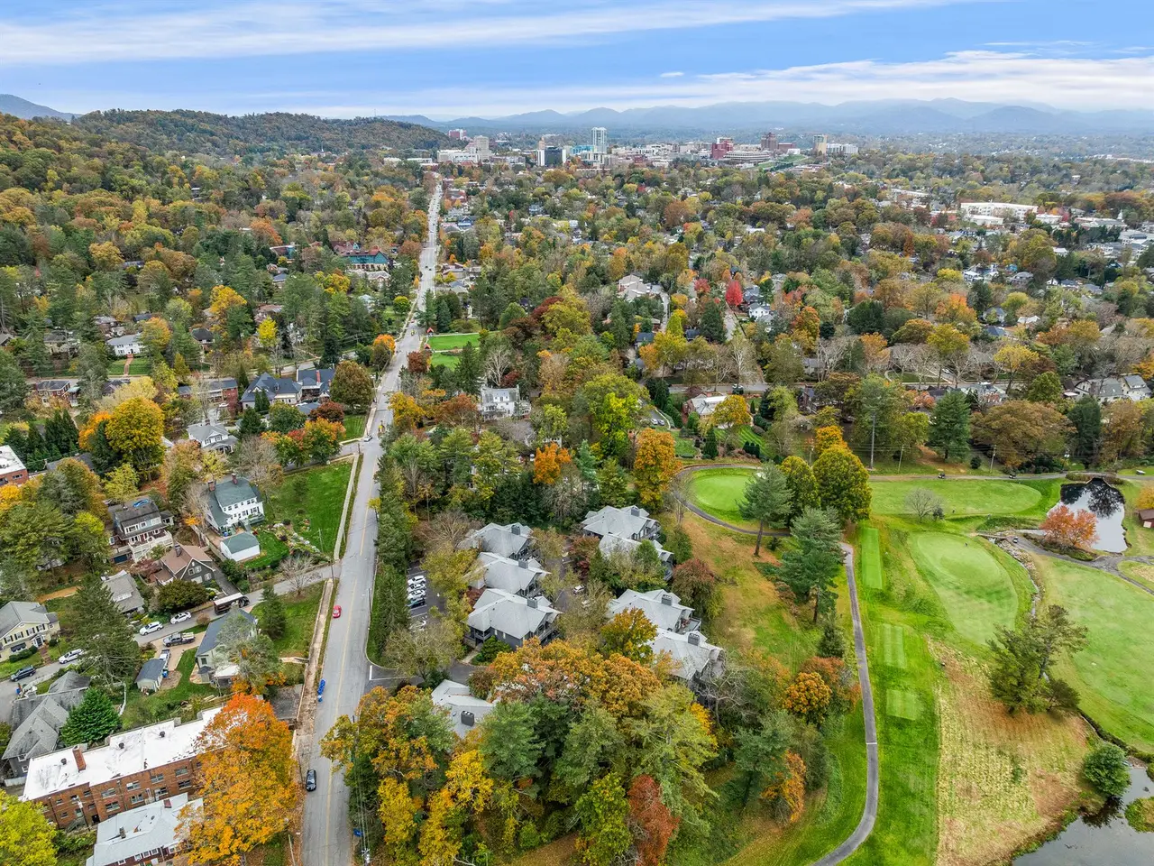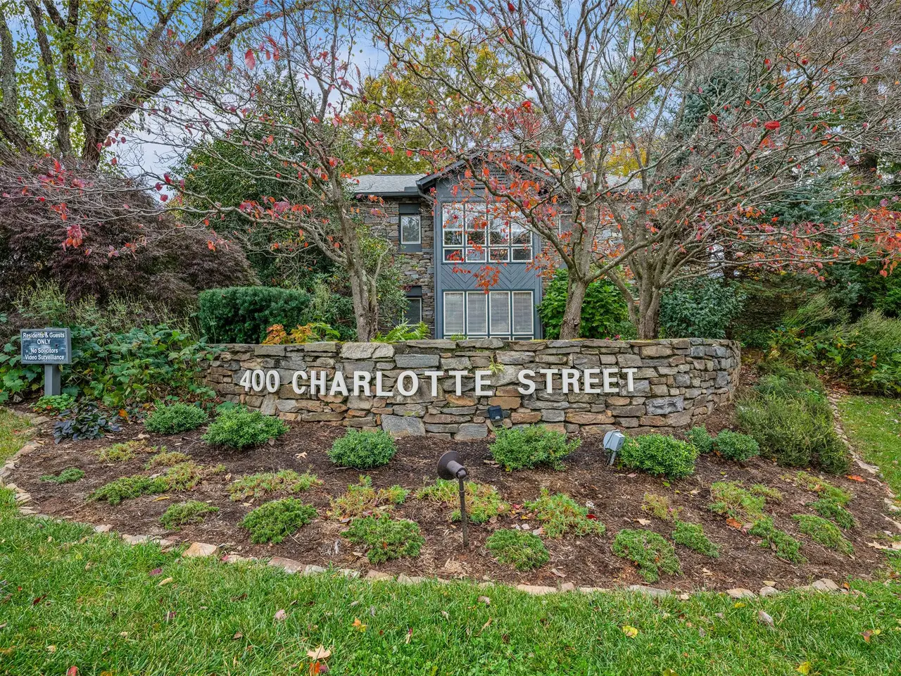 RARE Offering - Includes a Detached, Separately Deeded Garage! Discover the best of Asheville living in this rarely available condominium at 400 Charlotte Street, offering sweeping views of the Grove Park Inn golf course, its tranquil water feature, and the majestic southwestern mountains beyond. Perfectly positioned on the golf course side of a quiet, private 20-unit community - just one mile from downtown Asheville - this no-step, zero-grade entry home blends comfort, convenience, and potential in one of the city's most coveted locations. A RARE detached, separately deeded garage conveys with the property - providing exceptional value, extra storage, EV Drip Charger and the convenience of private parking, a true luxury in this desirable community. Step inside to a spacious, light-filled floor plan featuring 3 bedrooms and 3 full baths, including two generous primary suites. The first primary suite offers a cozy sitting area, two walk-in closets, and an elegant en suite bath with separate tub and shower. The open-concept living and dining areas center around a stunning stone, wood-burning fireplace and flow effortlessly onto a large covered porch - the perfect spot for morning coffee or evening sunsets overlooking the mountains and golf course. Freshly waiting for your personal touch or modern updates, this home offers incredible potential in a truly unbeatable location. Charlotte Street Condominiums is a pet-friendly community offering a peaceful, park-like setting just moments from Asheville's vibrant downtown shops, restaurants, and cultural attractions. (No short-term rentals permitted.) Opportunities like this are few and far between - don't miss your chance to make this mountain-view retreat your new home in Asheville!