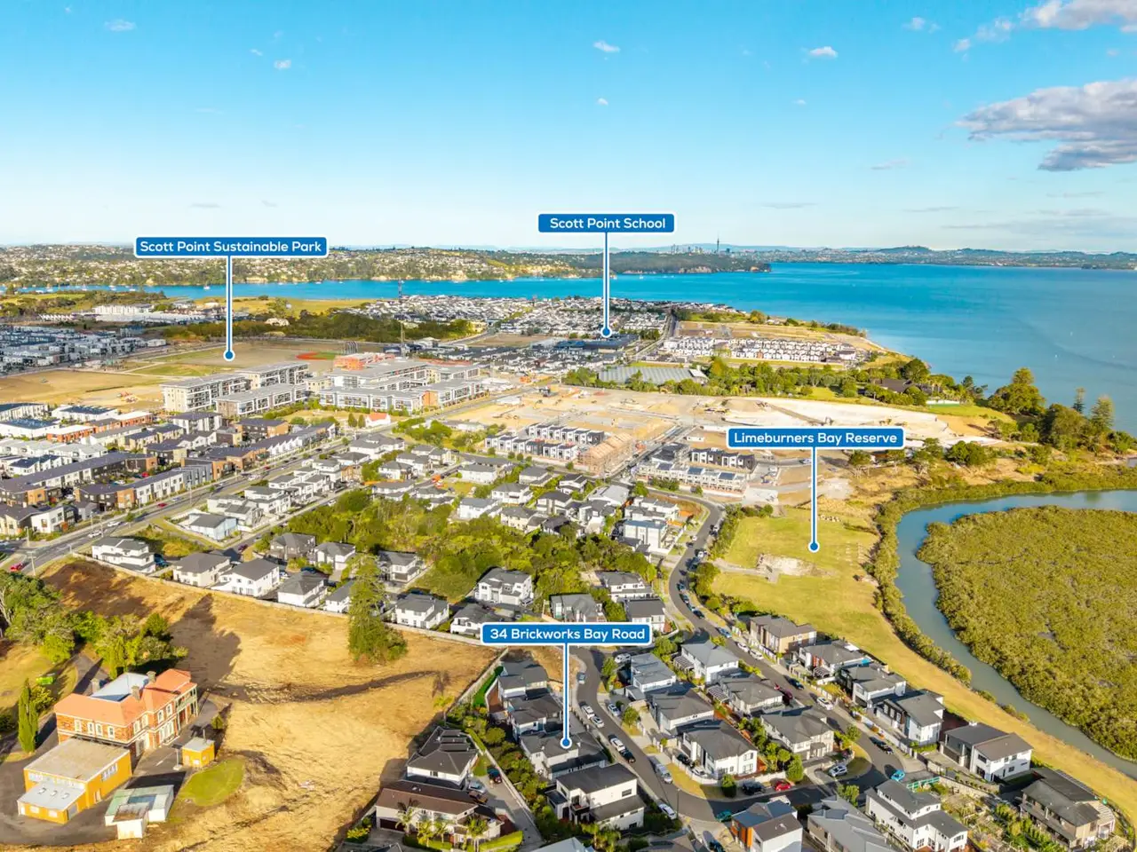 Nestled in the sought-after Lime Burners Bay, 34 Brickworks Bay Road offers an exceptional lifestyle in one of the first subdivisions in the Scott Point precinct. Known for its larger land sizes and high-value homes, this exclusive neighbourhood provides a sense of prestige and privacy. Sitting on a generous 500m² section with a 314m² floor area, this impressive home is designed to accommodate modern family living at its finest. Step inside to discover five spacious double bedrooms, including three with ensuites, ensuring comfort and convenience for the whole family. The home boasts four versatile family rooms, expansive open plan dining area, and well-appointed living spaces – perfect for entertaining. The modern kitchen is complemented by a separate laundry, adding to the home's practicality. Double internal garaging, plus three off-street parking spaces, provide ample room for vehicles with a secured automated gate. The property’s weatherboard and masonry block/brick exterior, shingle roof, and aluminium joinery ensure low maintenance and durability. Enjoy stunning harbour and sea views from the elevated section, enhancing the home's sense of space and connection with nature. Positioned close to Hobsonville’s vibrant amenities, including cafes, schools, and transport links, this home offers both convenience and luxury. Don't miss your chance to secure a premium property in one of Northwest's most desirable locations – act now and make this exclusive home yours!