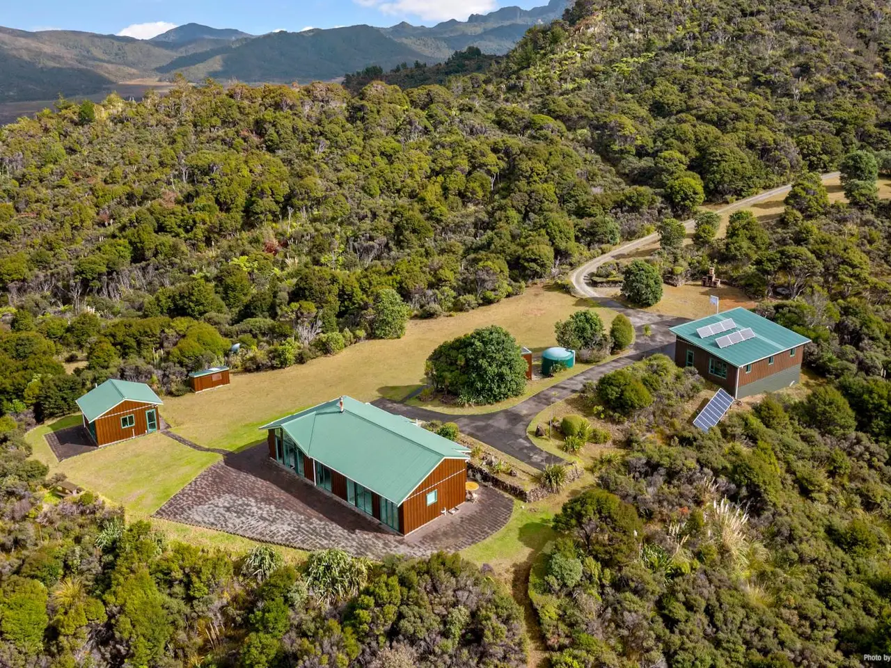 This exceptional property is the perfect retreat where privacy, location, sun, and magnificent views converge in perfect harmony. Panoramic vistas stretch from the Mercury Islands in the south, over the vast expanse of the Pacific Ocean around to the north with views over Awana beach and beyond. As you enter through arguably the most famous gates on the Barrier, a meticulously landscaped entrance sets the tone for the grandeur that awaits. Explore the scenic 30.10 hectare site (74.39 acres) which has been lovingly cared for over 19 years. Throughout the property there are drivable paths and tracks leading to 5 additional building sites, each offering equally stunning views. With potential for subdivision of up to 4 sites the possibilities are endless. Enjoy two modern accommodation options. The luxurious main house has 2 bedrooms and showcases the views through floor to ceiling windows and doors that open out to a spacious patio. Surrounded by natural beauty and elevated, you will feel on top of the world with the absolutely breathtaking view spread out before you. The views are enjoyed from every room including the lounge and separate dining room as well as the master suite and bathroom. For some indulgence open the bathroom bifolds and soak in the spa bath while gazing out over beautiful Kaitoke beach. There is also an impeccably maintained self-contained flat providing an ideal haven for guests or extended family. Enjoy knowing that your sanctuary is equipped for self-sufficient living. Embrace a sustainable lifestyle with a new solar inverter and solar panels ensuring ample power supply, complemented by 2 x 15,000L + 20,000L water tanks and a separate generator shed. Additionally the 3 bay garage accommodates the Pajero 4WD, John Deer tractor, mower & Gator transporter which are all included in the sale. Don't miss your chance to own this landmark property located only 30 mins from Auckland and 6.5kms from Claris airport. Tender: Closes on Tuesday 4 June 2024 at 4:00PM (unless sold prior)