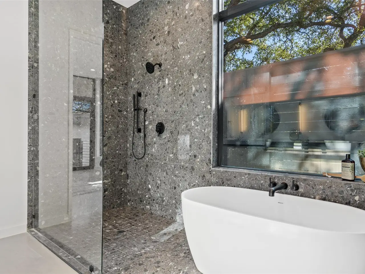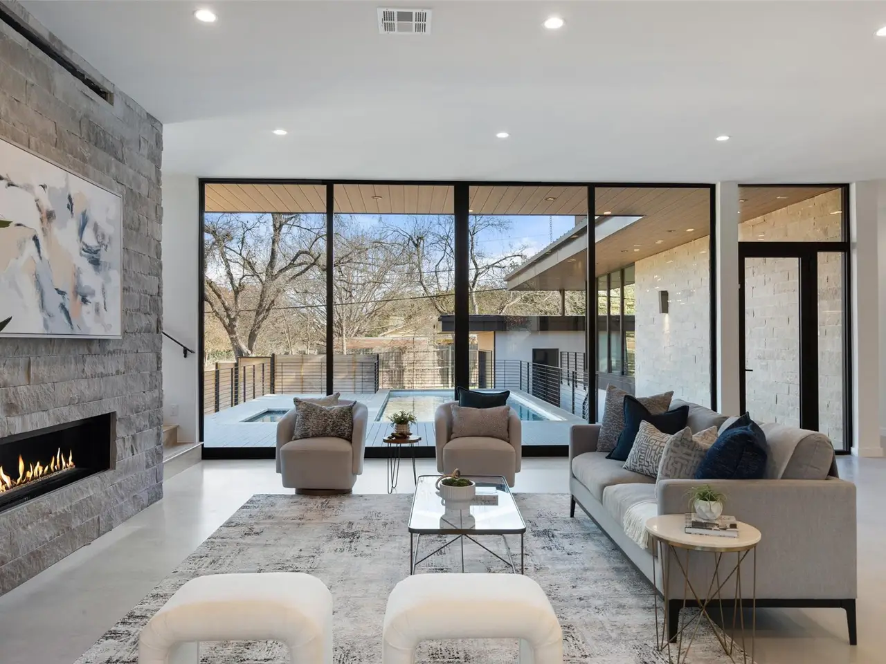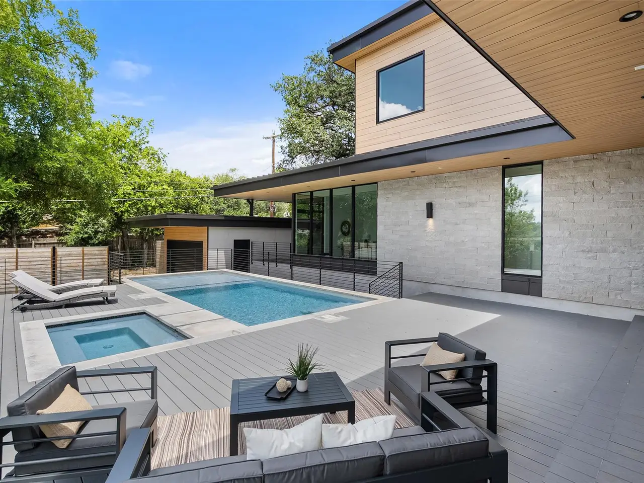 Discover a stunning modern masterpiece in the heart of Barton Hills. Located on a corner lot, this meticulously designed home boasts four spacious bedrooms, a dedicated office, and expansive living spaces tailored for relaxation and entertaining. Built in 2022 by Delve Residential (formerly Heartwood Real Estate Group), this stunning home seamlessly blends luxury and functionality. The exterior showcases a mix of high-end materials, including metal, stucco, and limestone, offering a modern yet timeless aesthetic. Inside, you'll find an impeccable combination of concrete and European Oak wood flooring that extends throughout the home, complemented by sleek granite and Caesarstone countertops. The gourmet kitchen is a chef's dream, equipped with top-of-the-line Sub-Zero, Wolf, Cove, and Thermador appliances, ensuring both style and performance. Flooded with natural light from floor-to-ceiling windows, the open floor plan is an entertainer's dream, seamlessly blending indoor and outdoor living with views of pool and private backyard. Upstairs, a massive den offers a versatile retreat, perfect for a media room, playroom, or secondary living space. Every detail, from the detached two-car garage to the carefully curated finishes, has been crafted with modern living in mind. Located minutes from Downtown, Barton Springs, Zilker Park, and Austin's annual ACL Festival, this home epitomizes luxury living in one of the city's most vibrant neighborhoods.