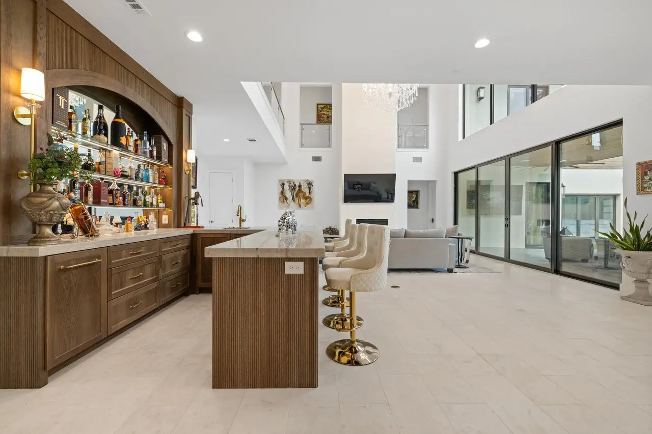 • Custom bar area with wood finishes and stone countertops