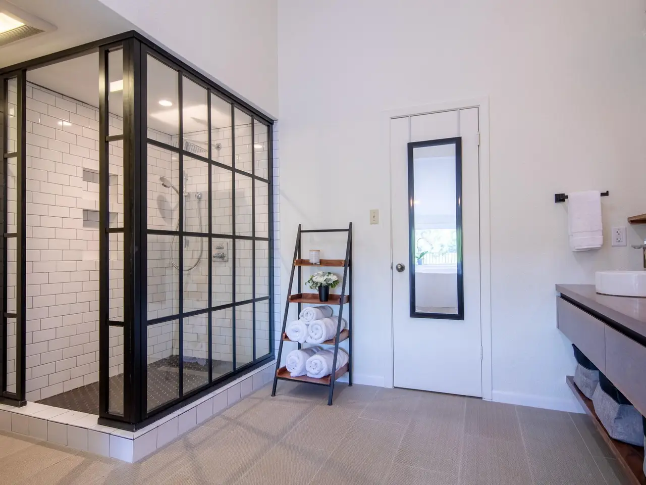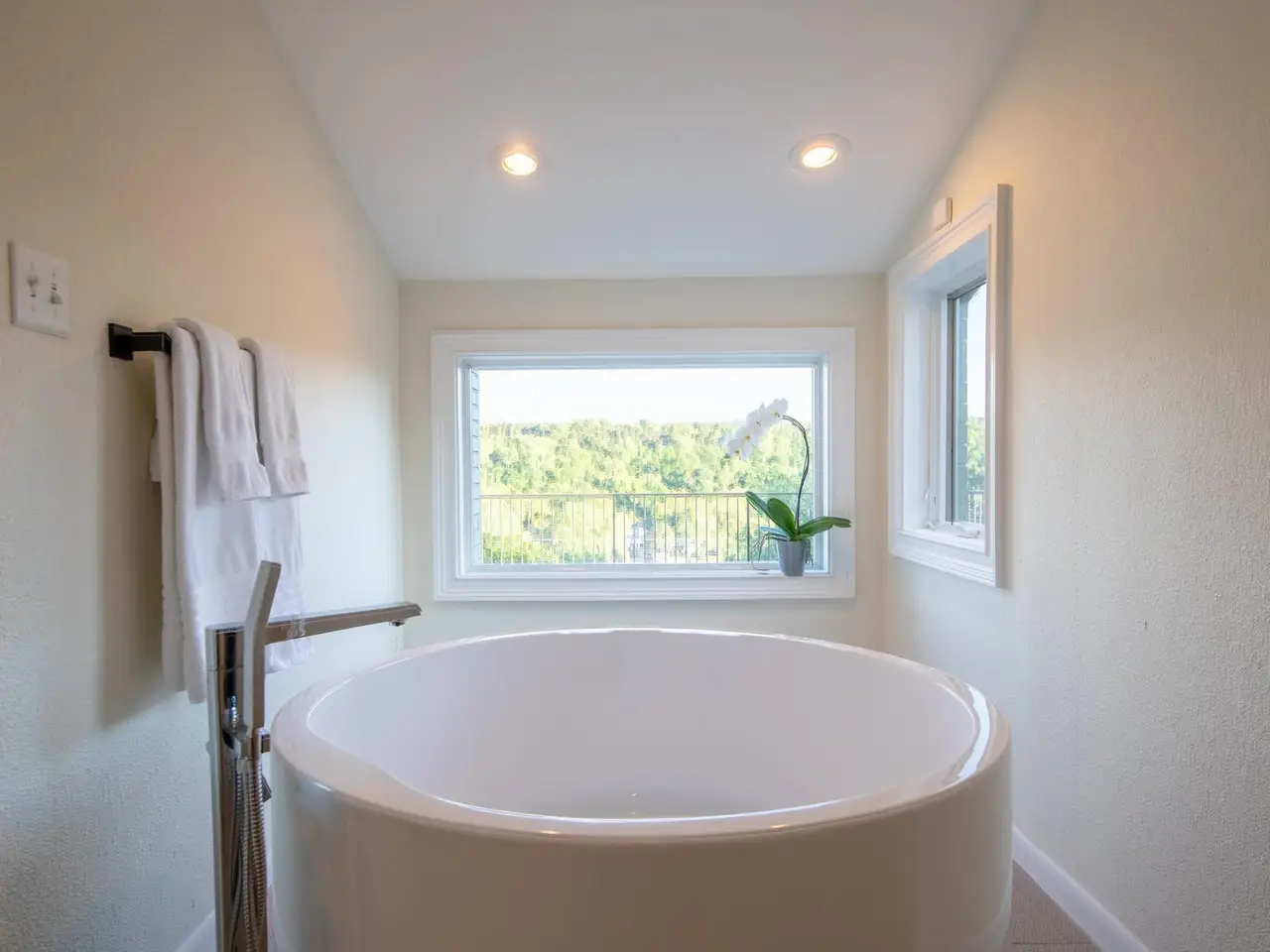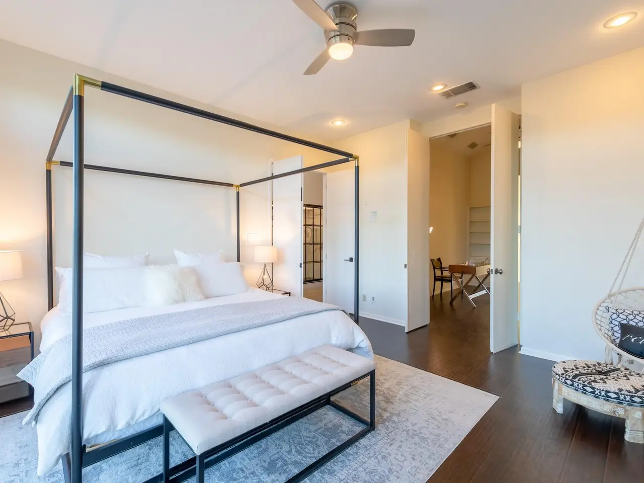 Luxe primary suite with lake views