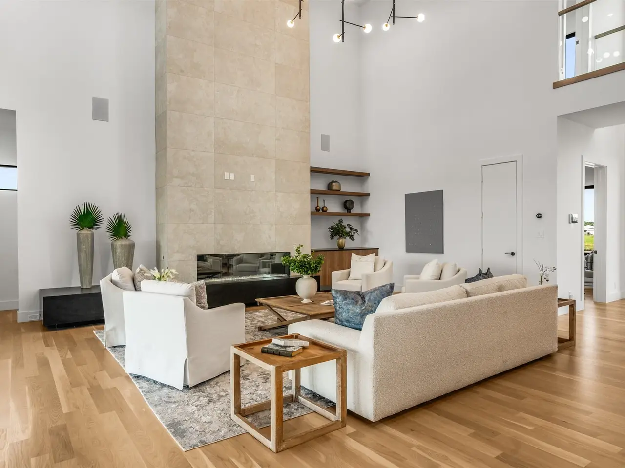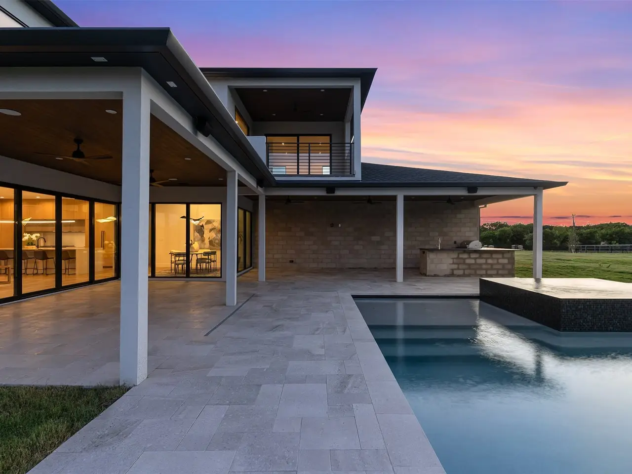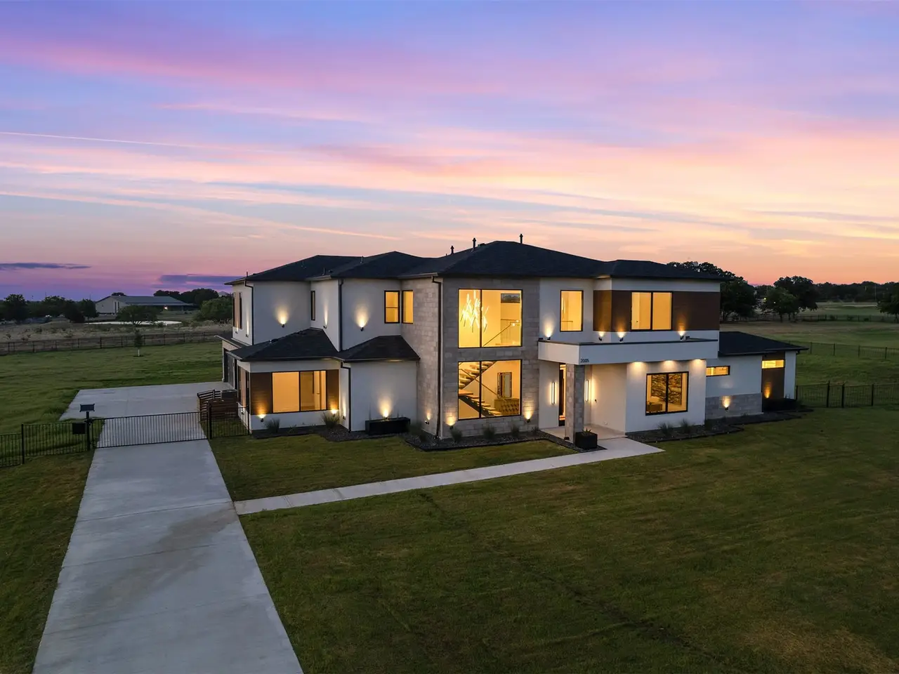 Modern Luxury on 2 Acres! Trifecta Estates - Built by Fourteen Construction Experience cutting-edge modern living on a sprawling 2-acre lot in the heart of Bartonville. This newly built showpiece by Fourteen Construction masterfully blends bold architectural design with luxurious amenities, all set within the prestigious Trifecta Estates. An impressive pivot door sets the tone for what's inside - where clean lines, a floating staircase, and flawless Level 5 smooth wall finishes create an unforgettable first impression. Natural light pours through expansive walls of glass, framing stunning views of the resort-style backyard from the open-concept living, kitchen, and dining areas. At the heart of the outdoor oasis is a large sparkling pool, flanked by two expansive covered patios, perfect for entertaining or relaxing in style. The outdoor kitchen is fully equipped and ready for your next gathering. Inside, enjoy elevated features like a linear fireplace, LED-lit master closet, and zero-maintenance exterior siding. Thoughtfully engineered for comfort and performance, the home includes spray foam insulation, two tankless water heaters, a heavy-duty foundation with piers, and full Ethernet cabling. Pre-wired for security cameras and integrated audio both inside and out. Rounding out this modern marvel is a 4-car garage, high-end designer lighting throughout, and timeless attention to detail in every room.