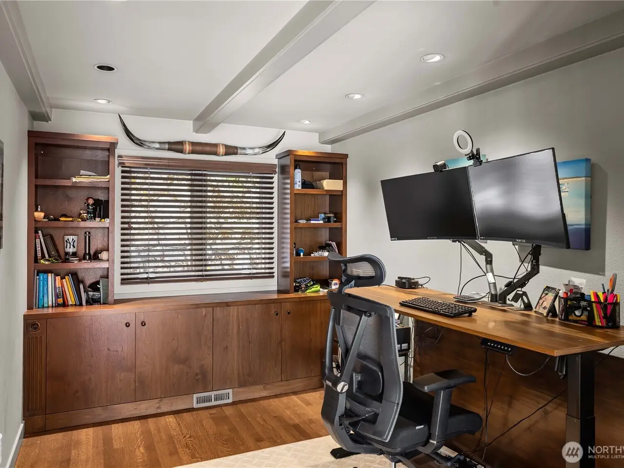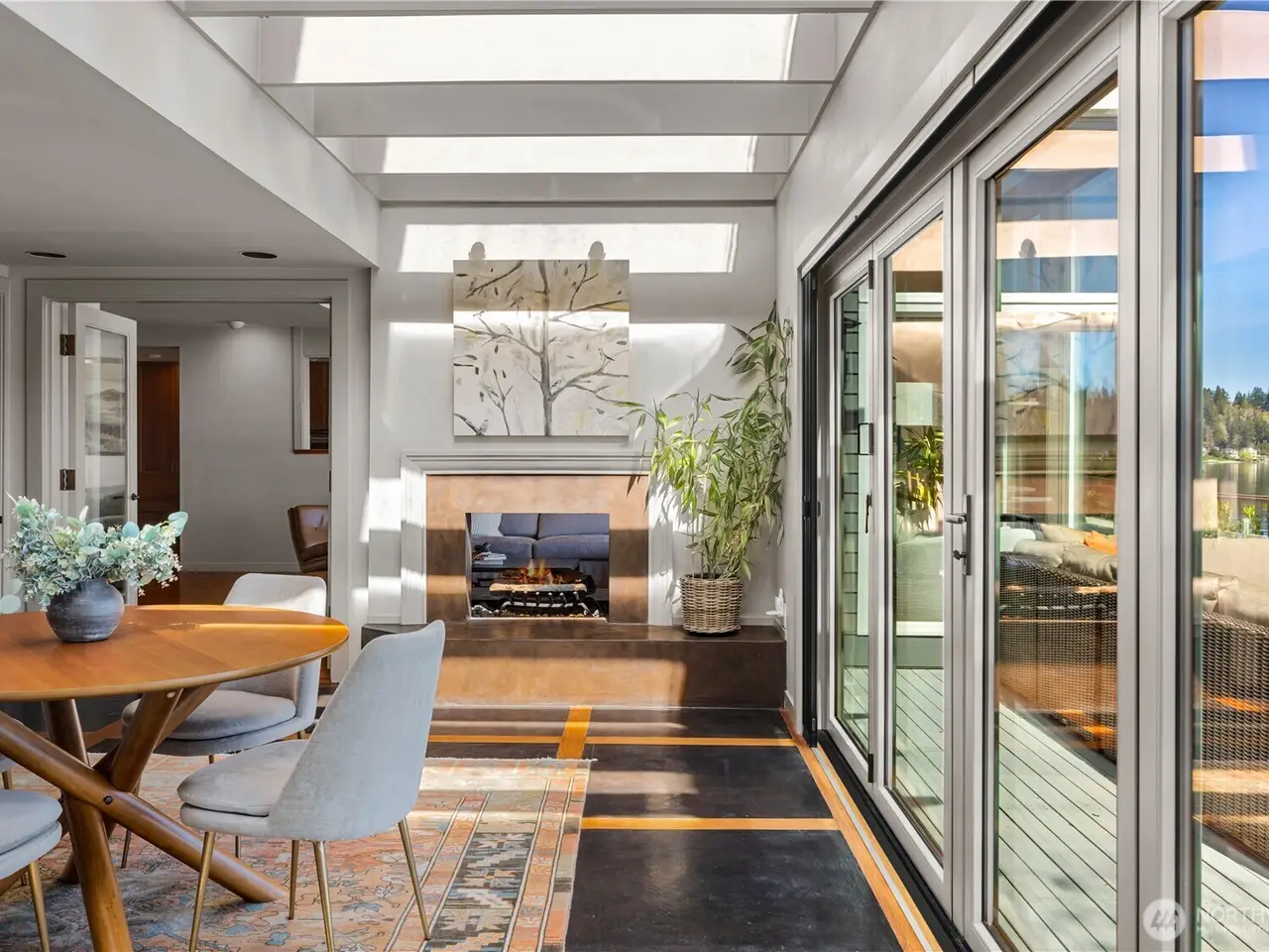 Tucked on a quiet lakeside lane with 90 feet of private Lake Sammamish shoreline, this NW contemporary retreat is a study in light, style, and serenity. Two-story windows and skylights fill the home with natural light, from the great room to the airy sunroom where lake breezes drift through the open NanaWall. Swim off the expansive dock, cast a line in the cove, or retreat to the cozy theater with wet bar. Evenings invite sunset dinners on the full-width deck, followed by a soak in the secluded hot tub tucked amidst lush landscaping. Upstairs, the serene primary suite offers storm-watching solitude and sweeping views. Extensively updated and thoughtfully designed - with rare 8-car parking - this is active waterfront living, beautifully refined.