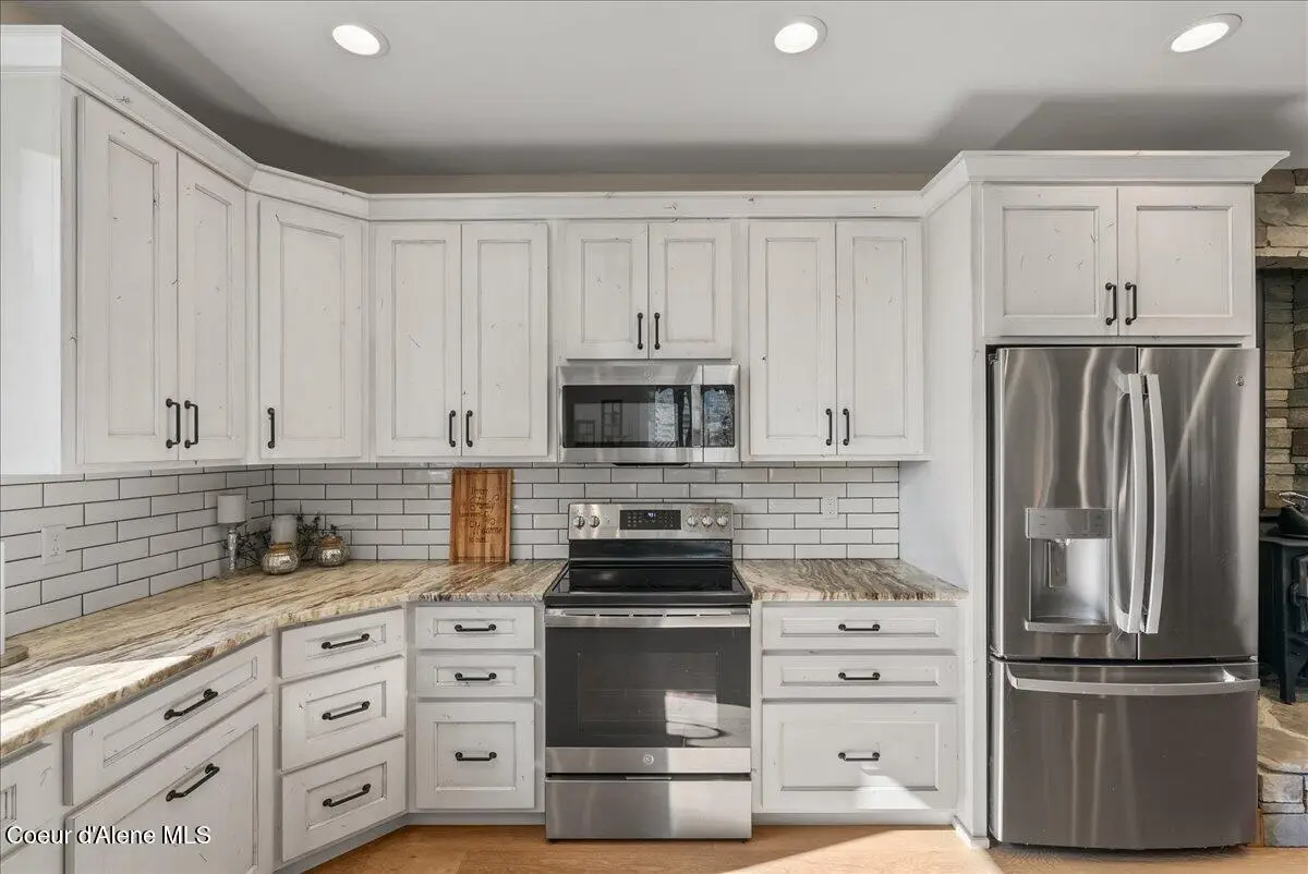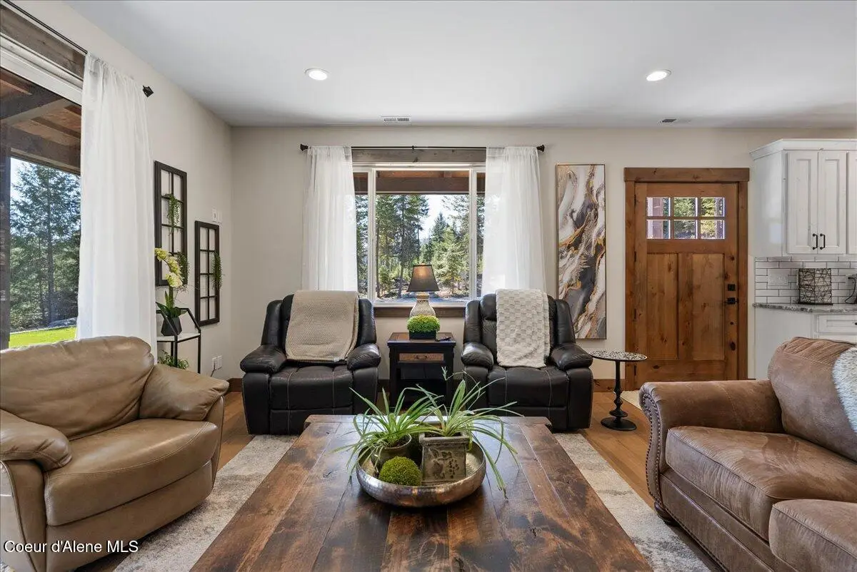 Escape to peace and privacy in this stunning 2,500 sq ft, 4 bed, 2.5 bath multi-level Shop Home on 5.04 acres at the end of a quiet drive. This efficient, rustic-modern home features an open-concept kitchen with granite counters, engineered hardwood floors, and custom wood trim throughout. Includes a spacious finished garage 15'x23' with an attached 32'x40' insulated, finished shop featuring a wood stove, welder outlet, workbenches. High producing private well with filtration system in place. The home is prepped for a future automatic whole-house generator and includes a wood stove in the kitchen for emergency backup heat. Enjoy mountain views and a landscaped yard. Deer and elk frequently pass through, adding to the North Idaho charm. A future pad is already in place for a second shop. Stoneridge Golf Course is just south and minutes away. A scenic drive to CDA - this is the peaceful, functional lifestyle you've been looking for.