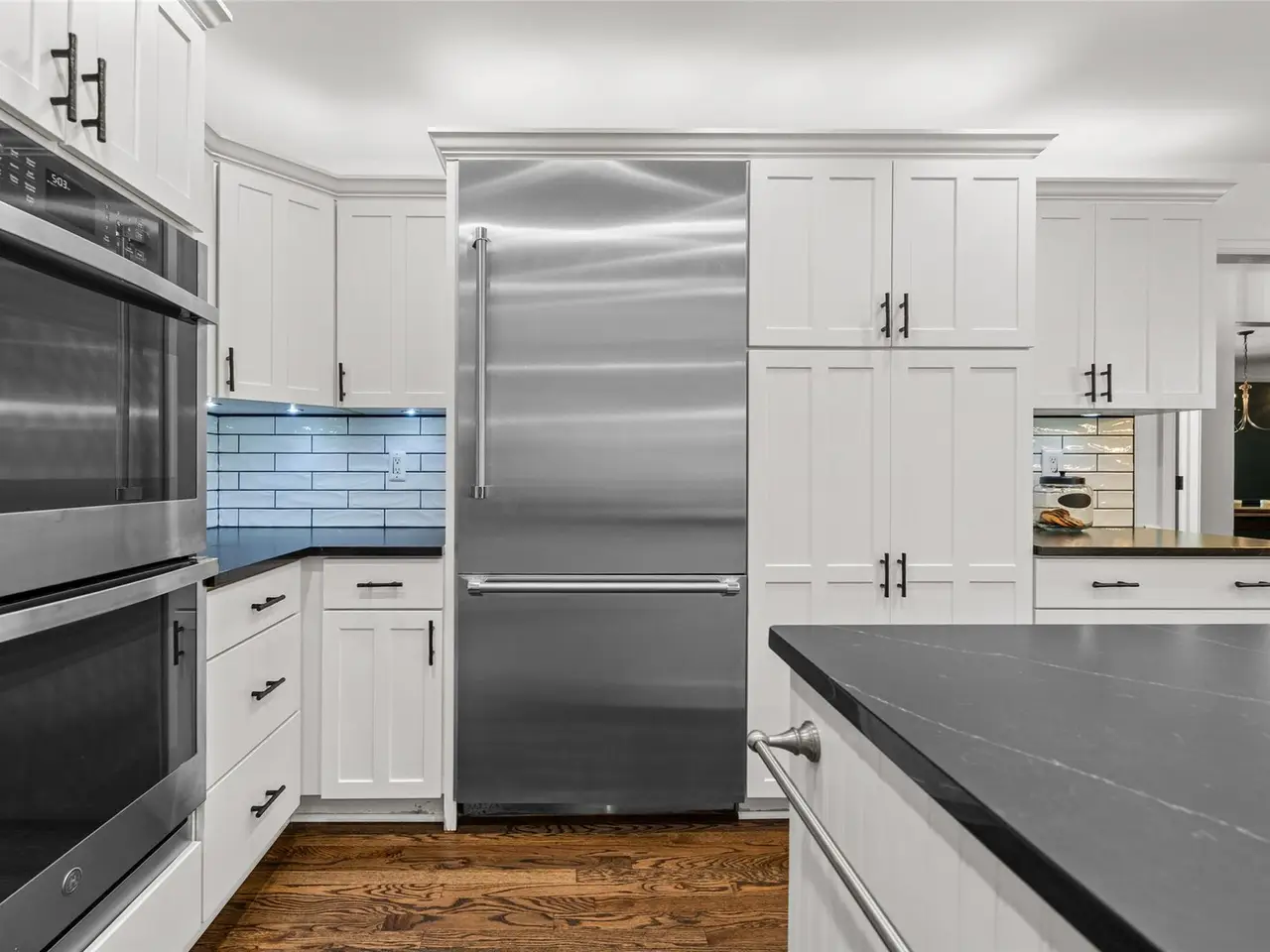 • Custom white kitchen with black sueded quartz counters