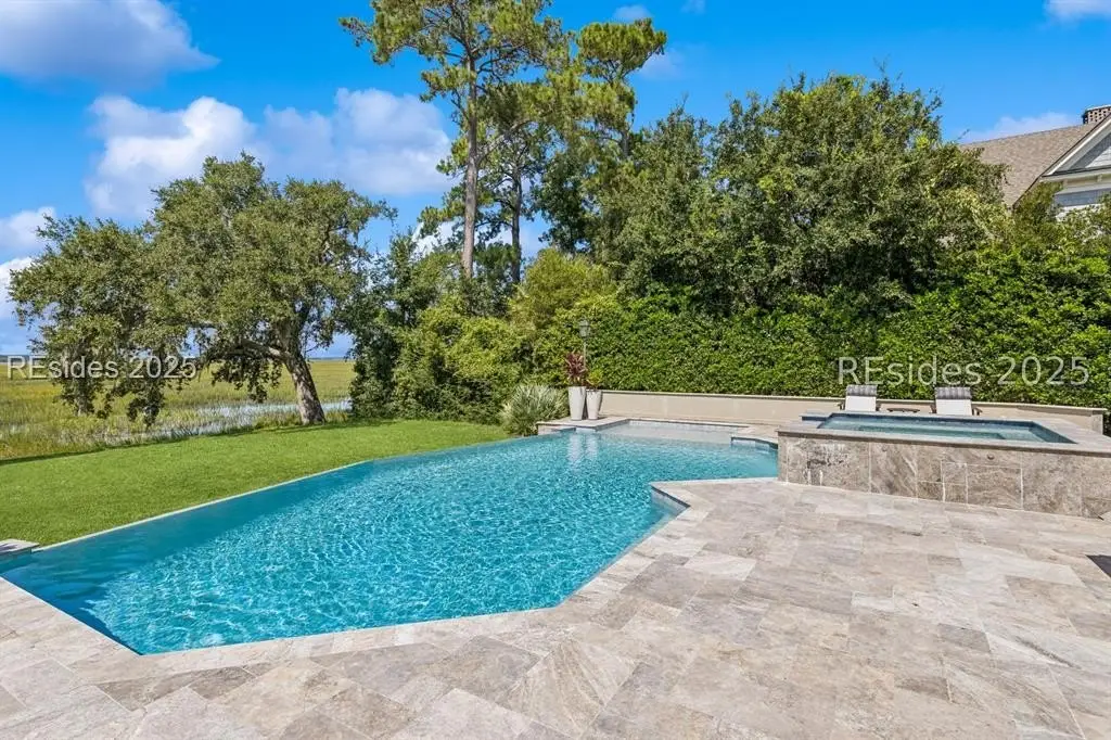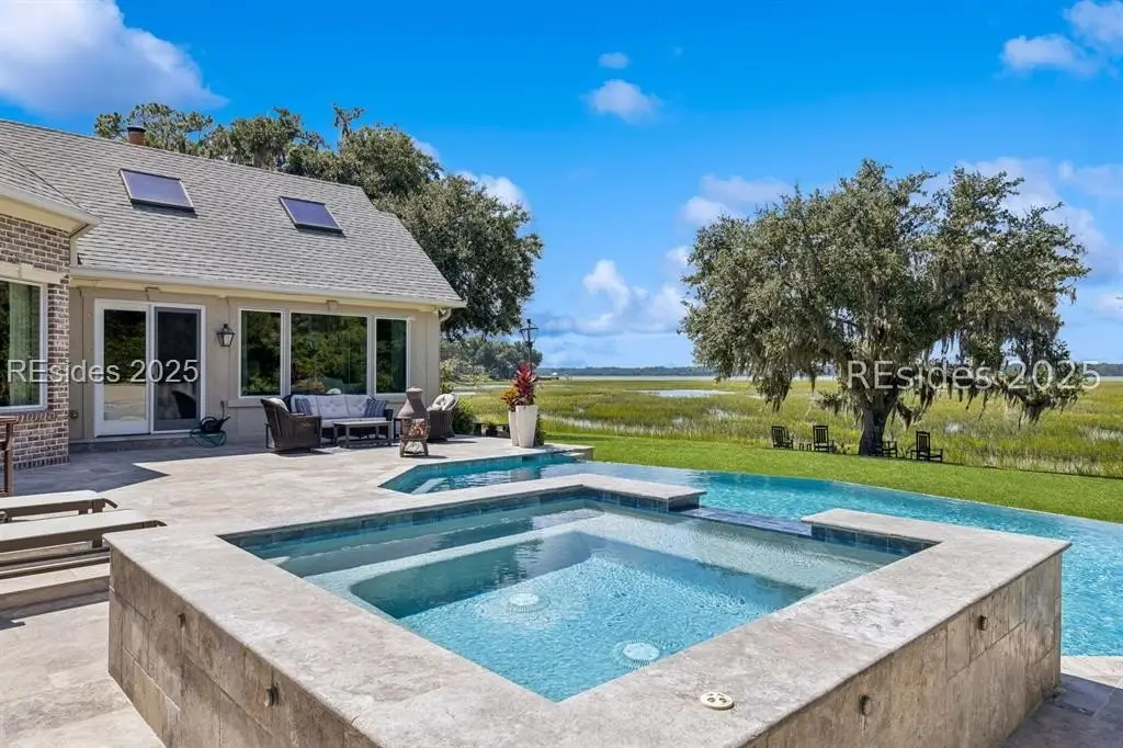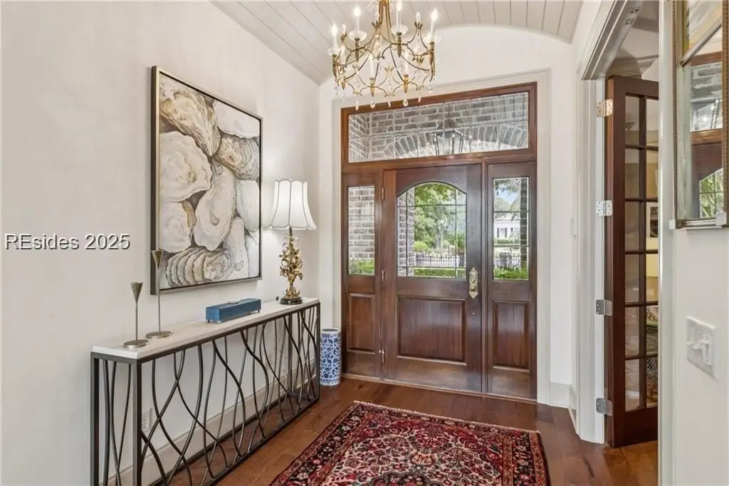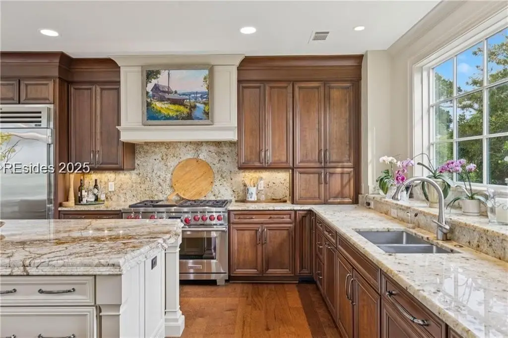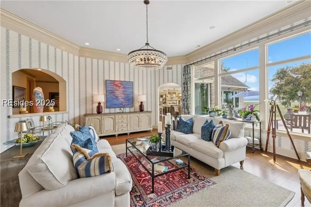 Spectacular marsh-to-river views framed by live oaks in this beautifully updated custom home. Enter through a gated garden into soaring 12’ ceilings, abundant light, and elegant living spaces. The chef's kitchen boasts a Wolf range, 4 ovens, Sub-Zero fridge, wine fridge, 10' island, 2 dishwashers, and more. First-floor primary suite has dual walk-in closets and a private laundry. Bonus room, custom closets, second laundry, new carpet (2023), HVAC (2020), pool heat/cool pump (2024), UV window film, custom built-ins, fire pit, and more. It's an ideal layout for entertaining and hosting family.