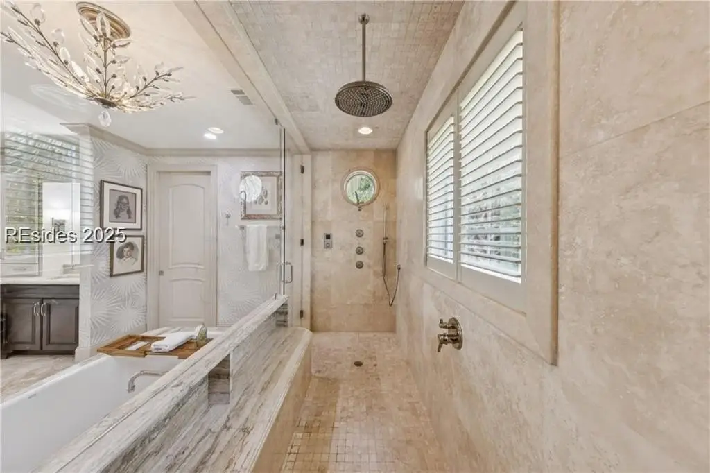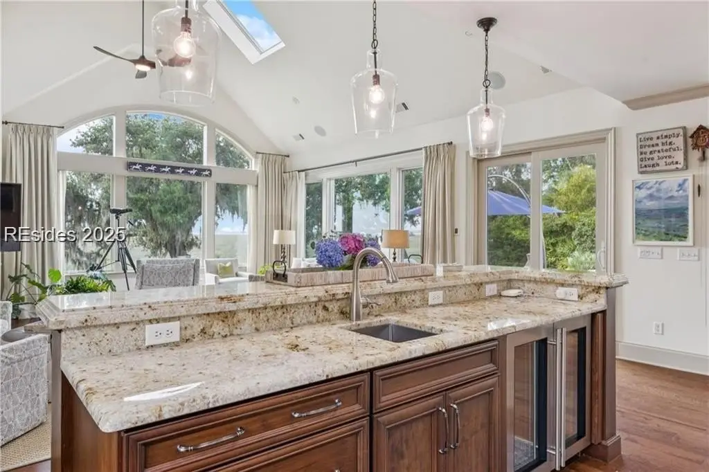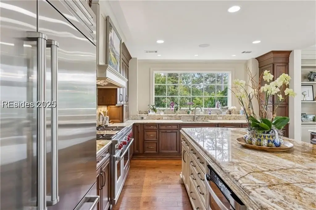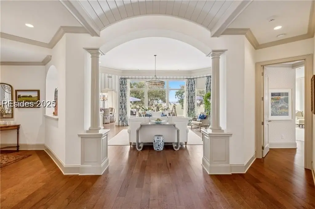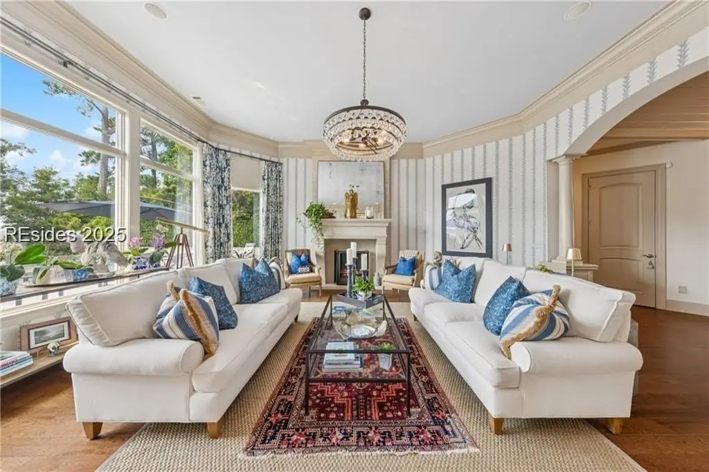 Spectacular marsh-to-river views framed by live oaks in this beautifully updated custom home. Enter through a gated garden into soaring 12’ ceilings, abundant light, and elegant living spaces. The chef's kitchen boasts a Wolf range, 4 ovens, Sub-Zero fridge, wine fridge, 10' island, 2 dishwashers, and more. First-floor primary suite has dual walk-in closets and a private laundry. Bonus room, custom closets, second laundry, new carpet (2023), HVAC (2020), pool heat/cool pump (2024), UV window film, custom built-ins, fire pit, and more. It's an ideal layout for entertaining and hosting family.