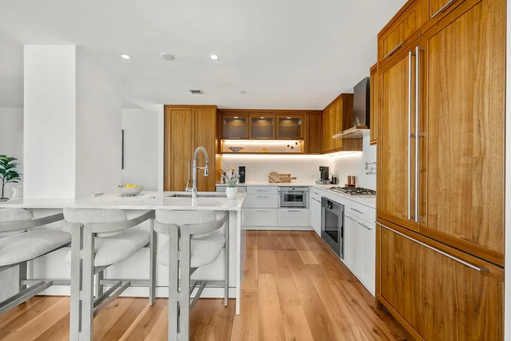 Experience exceptional waterfront living in this rare, single-level luxury Seaport condo. This 3-bed, 2.5-bath home features an open layout, floor-to-ceiling windows, and stunning water views from every room with three sunlit exposures. Enjoy two private balconies, two garage spaces, and a coveted all on one level floor-plan. This incredible full-service building includes valet, 24-hour concierge, resident lounge, an outdoor terrace with water views and grills, fitness center, and golf simulator. Steps to Seaport's top shopping and dining, including in building restaurants Nautilus, Woods Hill Table, and The Block at Woods Hill.