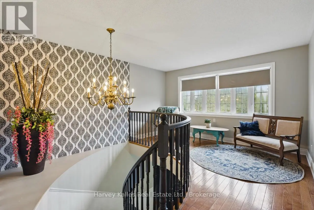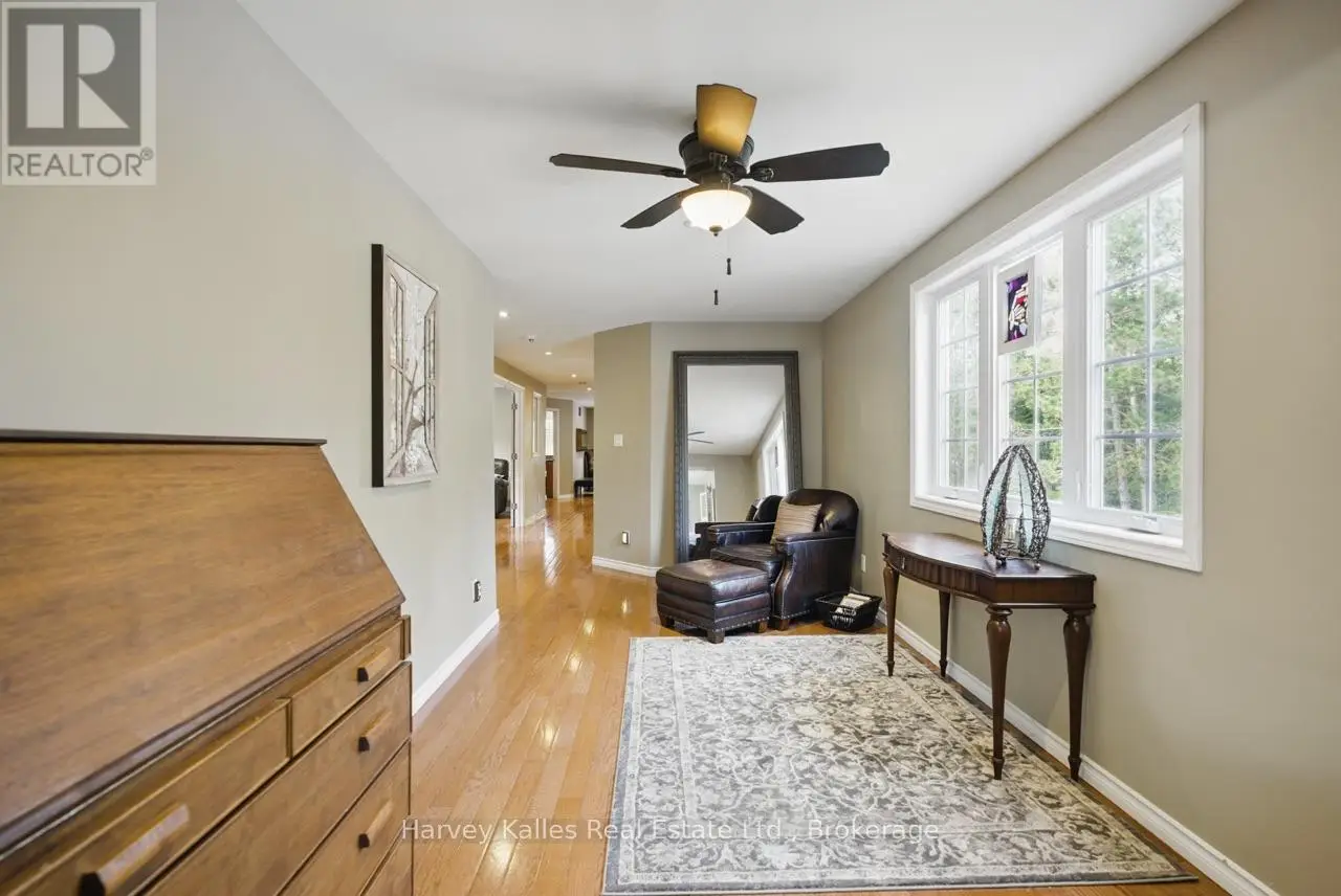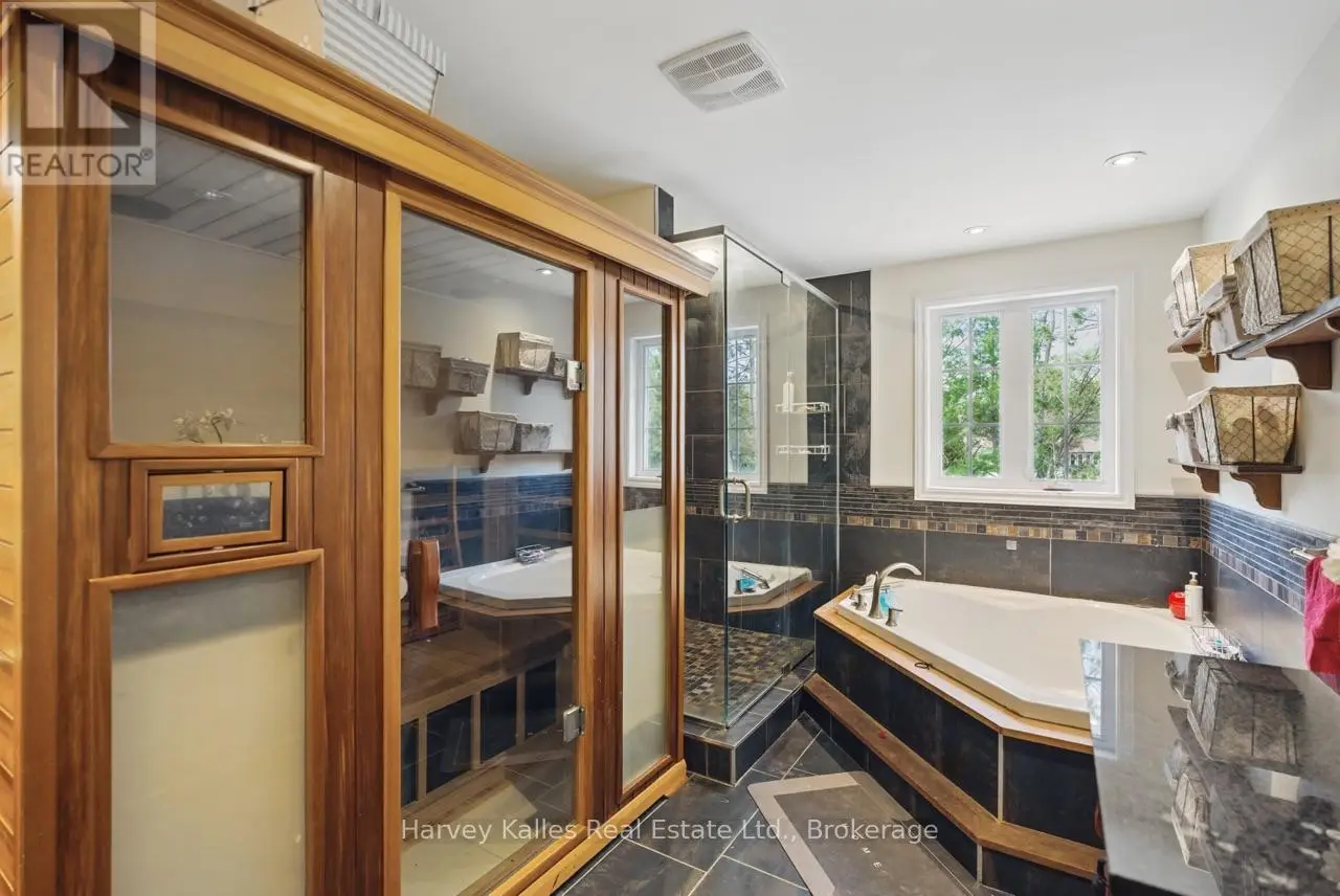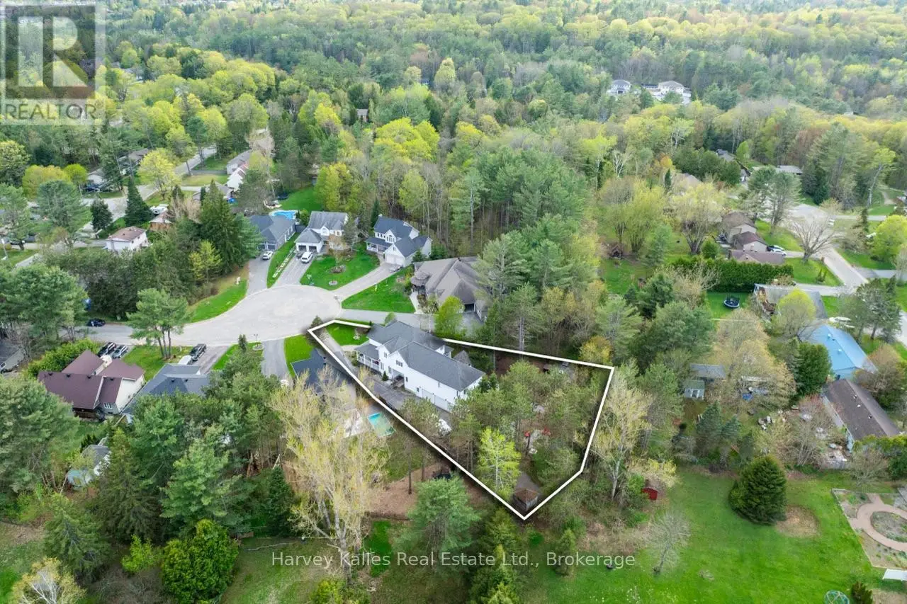 Extraordinary, postcard perfect curb appeal at this sophisticated and stunning 4-6 bedroom, 5 bathroom, 2 storey home, serving up exciting and sleek architectural details, with an invigorating layout, comfortable for just a couple, yet with a family-friendly spirit. Over 5,100 sq. ft. of beautifully flowing living space. Exquisitely positioned, in-town, on full municipal services, within walking distance of amenities, yet exclusively nestled on a quiet and secluded true 'cul-de-sac'. Melane Court is unquestionably one of Bracebridge's finest addresses. Built in 2002 and originally owned by the builder, the home stands proudly with a beautiful wrap-around covered southwest facing porch, with a cleverly tucked away attached 4-car garage along the side with paved drive, ample parking, on a large 1/2 acre lot with fully fenced garden oasis back yard. Inside, a dramatic 2-storey foyer beckons with its curved staircase. The main floor features a solar southerly office/den, hardwood floors, formal living room, dining room, eat-in kitchen, and separate family room. Plus a handy mudroom, powder room, and MF laundry room. Upper level presents 3 sizeable bedrooms plus a loft, one with an ensuite privilege, one fully ensuited, plus the 1,100+ sq. ft. primary wing featuring a private den/T.V. room, walk-in closet, ensuite with soaker tub, sauna, studio, and walk-out to deck. Finished lower level is a flexible space with access from the garage, 3 pc. bath, ample storage, bedroom, gymnasium, and rec. room. Potential to create a nanny's suite with the basement. 10 kW back-up generator, central air, forced air gas heat, multiple fireplaces. Newly resurfaced back deck and large patio area with custom greenhouse, and separate gazebo enliven outdoor living. An executive family home in a neighborhood where very, very rarely is anything offered for sale. This is a truly exemplary offering exuding so much warmth and charm, with features and facets everyone desires. (id:16999)