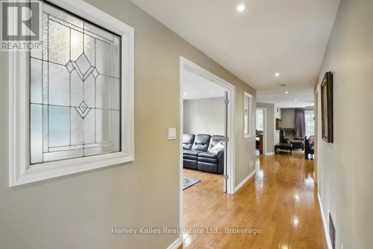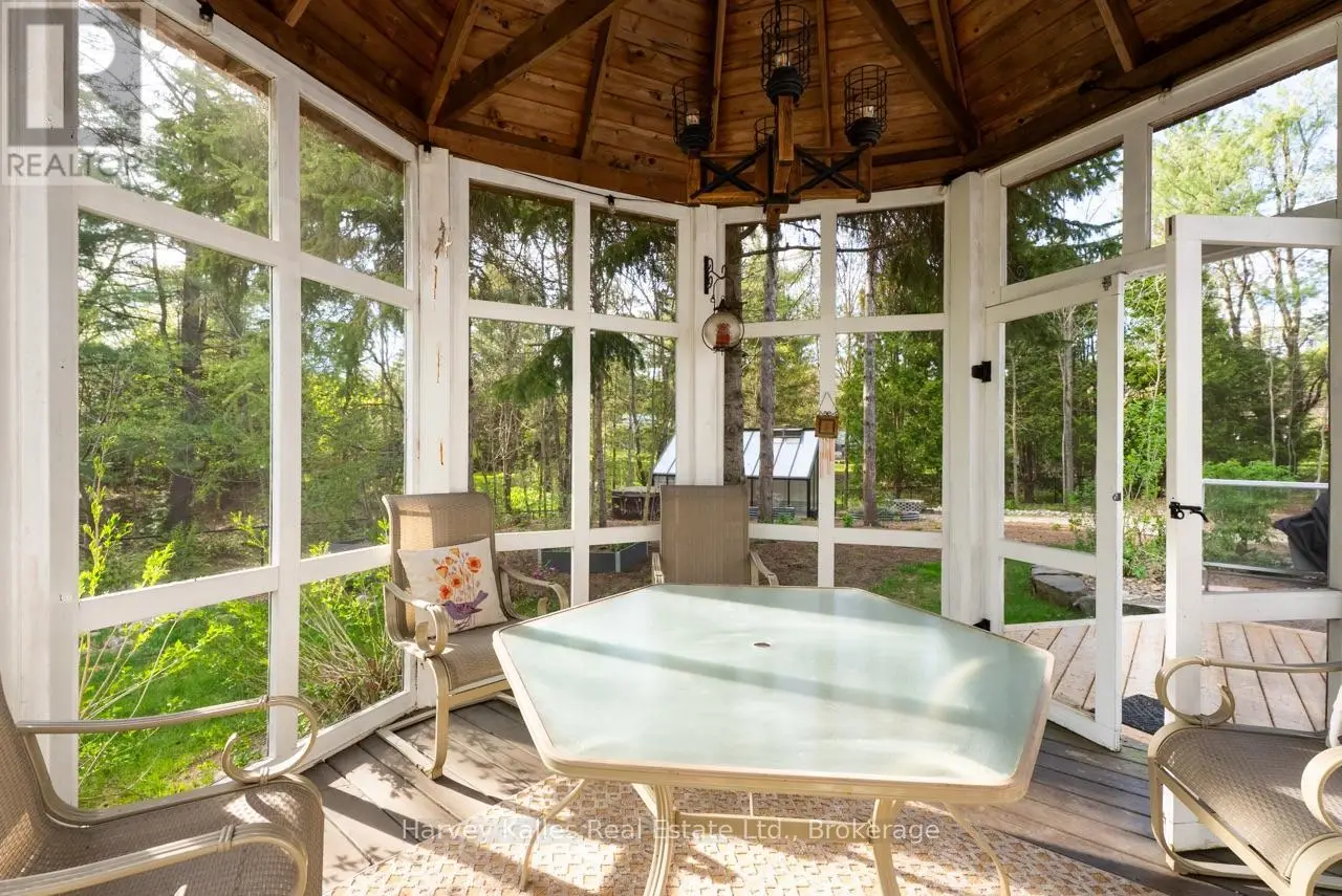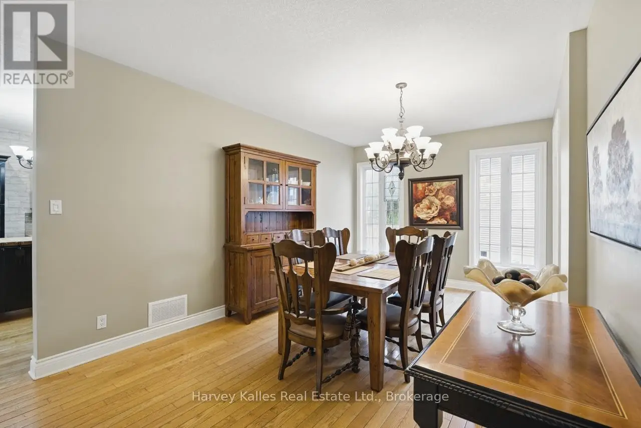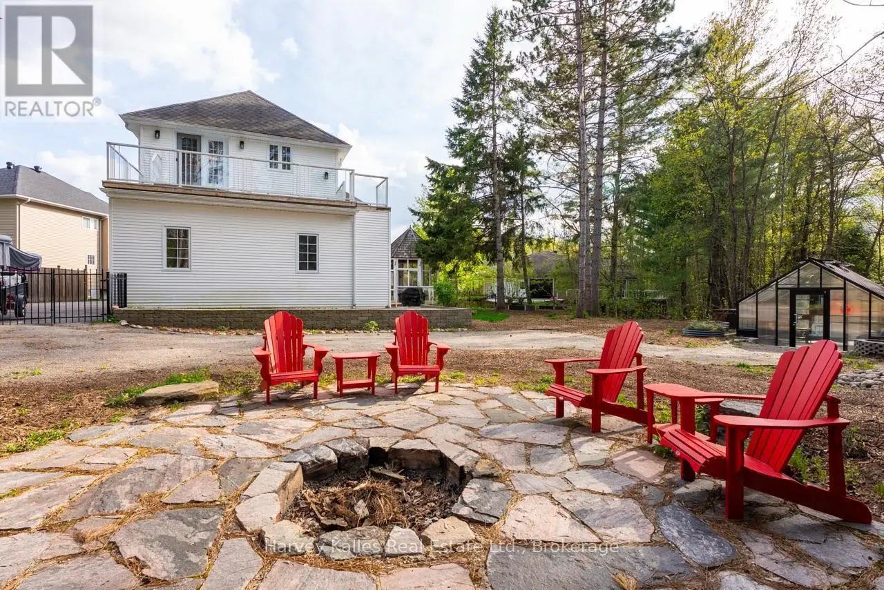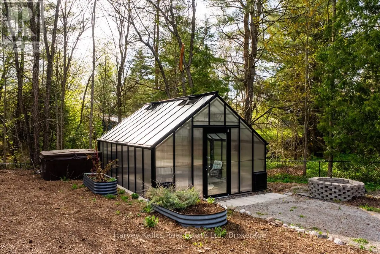 Extraordinary, postcard perfect curb appeal at this sophisticated and stunning 4-6 bedroom, 5 bathroom, 2 storey home, serving up exciting and sleek architectural details, with an invigorating layout, comfortable for just a couple, yet with a family-friendly spirit. Over 5,100 sq. ft. of beautifully flowing living space. Exquisitely positioned, in-town, on full municipal services, within walking distance of amenities, yet exclusively nestled on a quiet and secluded true 'cul-de-sac'. Melane Court is unquestionably one of Bracebridge's finest addresses. Built in 2002 and originally owned by the builder, the home stands proudly with a beautiful wrap-around covered southwest facing porch, with a cleverly tucked away attached 4-car garage along the side with paved drive, ample parking, on a large 1/2 acre lot with fully fenced garden oasis back yard. Inside, a dramatic 2-storey foyer beckons with its curved staircase. The main floor features a solar southerly office/den, hardwood floors, formal living room, dining room, eat-in kitchen, and separate family room. Plus a handy mudroom, powder room, and MF laundry room. Upper level presents 3 sizeable bedrooms plus a loft, one with an ensuite privilege, one fully ensuited, plus the 1,100+ sq. ft. primary wing featuring a private den/T.V. room, walk-in closet, ensuite with soaker tub, sauna, studio, and walk-out to deck. Finished lower level is a flexible space with access from the garage, 3 pc. bath, ample storage, bedroom, gymnasium, and rec. room. Potential to create a nanny's suite with the basement. 10 kW back-up generator, central air, forced air gas heat, multiple fireplaces. Newly resurfaced back deck and large patio area with custom greenhouse, and separate gazebo enliven outdoor living. An executive family home in a neighborhood where very, very rarely is anything offered for sale. This is a truly exemplary offering exuding so much warmth and charm, with features and facets everyone desires. (id:16999)