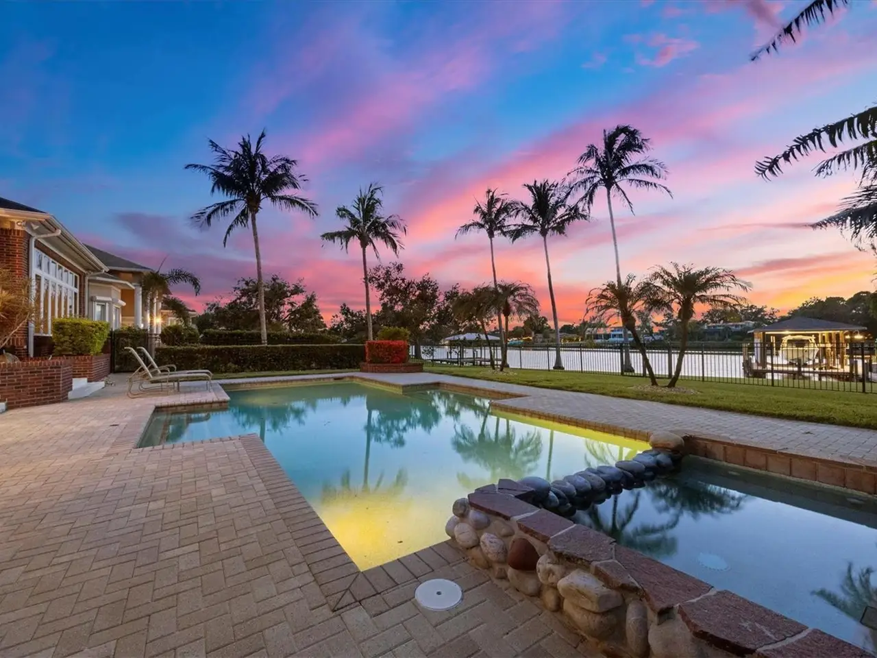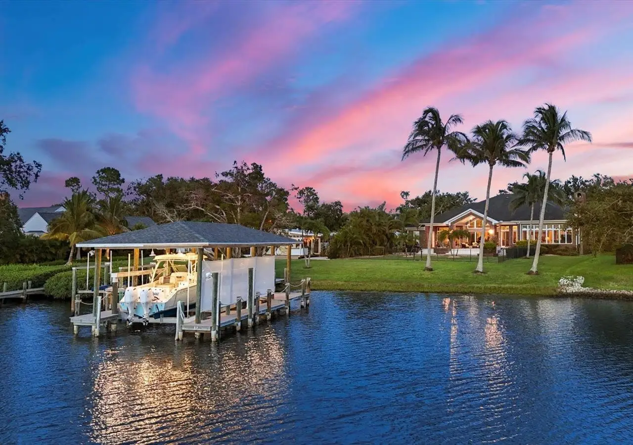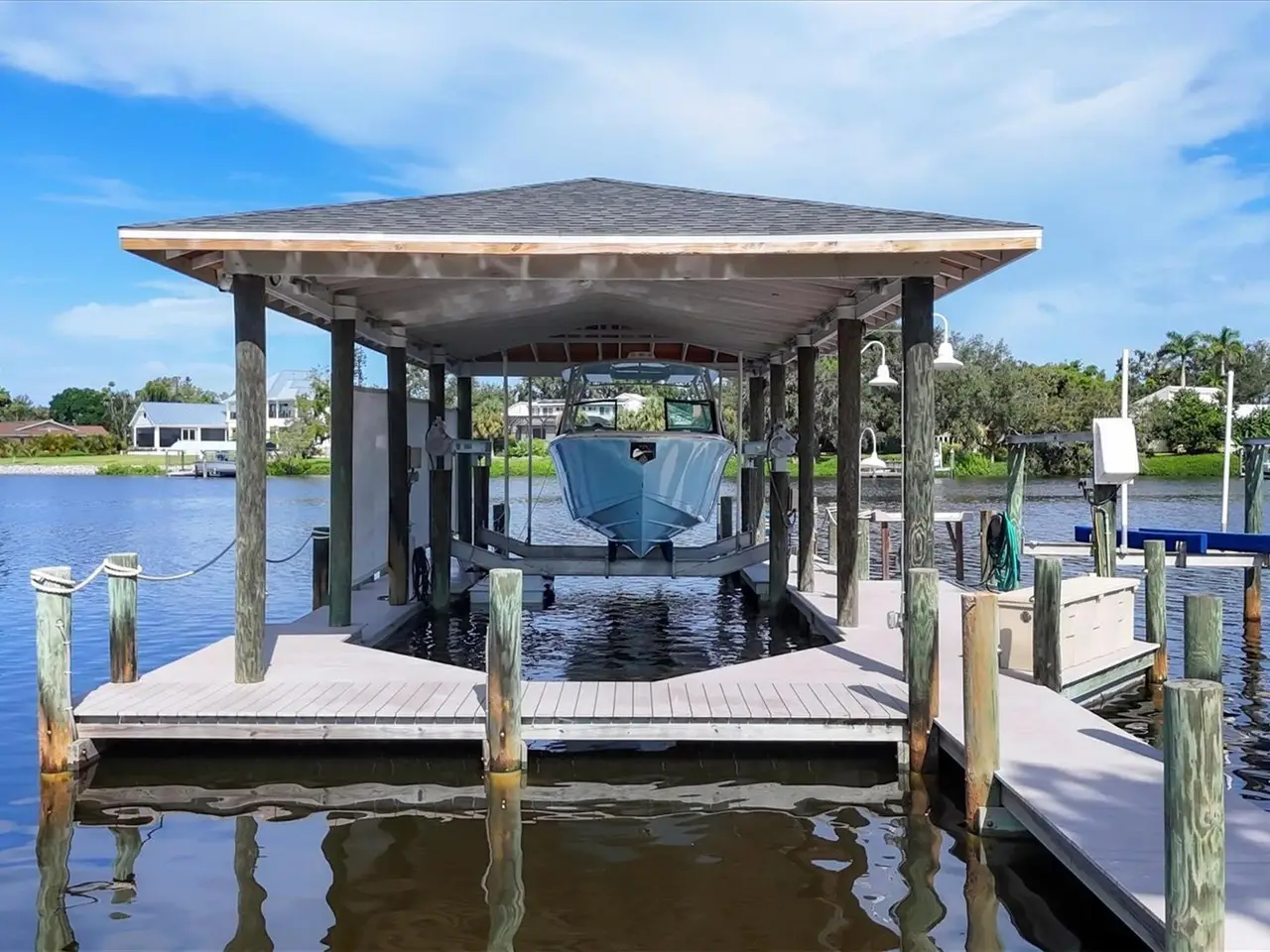 A boater's tropical paradise awaits you in this custom-built home located on Warner's West Bayou in desirable NW Bradenton. Imagine living the FL boating lifestyle where you can be out in your boat fishing or sightseeing in the beautiful Tampa Bay in a matter of minutes. This luxurious estate home features 4025 square feet with 3 bedrooms + den with 2 full baths + 2 half baths plus an oversized saltwater pool on a boatable waterfront lot. This beautiful home sits on an estate sized lot with 100' of water frontage and no HOA. There is a large covered dock that includes two boat lifts, one that is covered and fits a 50-foot yacht, 25,000lb lift, with water & electric & a fish cleaning station. Coming into the home are beautiful mahogany double doors with glass inserts that welcome you and set the scene for elegant living. Upon entering the home, you will love the open floor plan with its high ceilings and beautiful water views. The living and dining rooms are inviting, spacious, and feature wood floors, elegant crown moldings, chair rails and custom built-ins. To enjoy large gatherings and family fun there is an impressive, oversized family room/game room with wood-burning fireplace and large windows that let in the sunshine, pool, and water views. The spacious kitchen which opens to the family room is a chef's dream with wood cabinetry, granite countertops, tile backsplash, newer stainless-steel appliances, a large center island with prep sink, and a built-in desk. Rest and relax in the master bedroom suite overlooking the lovely backyard with sliding doors opening to the pool area and water views. The master bath features travertine floors, a large walk-in shower and large tub made for two. Separated from the master bedroom are two spacious bedrooms and a hall bathroom with tub and walk-in shower. Next is the laundry room that is oversized featuring a newer washer & dryer, laundry sink, plenty of cabinets and a large closet. Out back everyone will love the oversized covered lanai that is a dream come true and keeps you shaded during the day while your family is enjoying the sunshine in the pool and spa. There is a pool bath and an outside shower plus a storage closet for all your boating gear. Watching the sunsets views while sitting on the lanai with your favorite beverage is a lovely way to end the evening. The backyard is fenced for your family and pets to run and play and there is an open beach for kayaking or canoeing. Another great feature is the oversized 40-foot three-car insulated A/C'd garage with large semi-circular driveway with parking area. Plenty of room to park, store your possessions, and work on your cars. All this is conveniently located to Sarasota/Bradenton airport, IMG Academy, restaurants, shopping, and the beautiful AMI Gulf beaches.