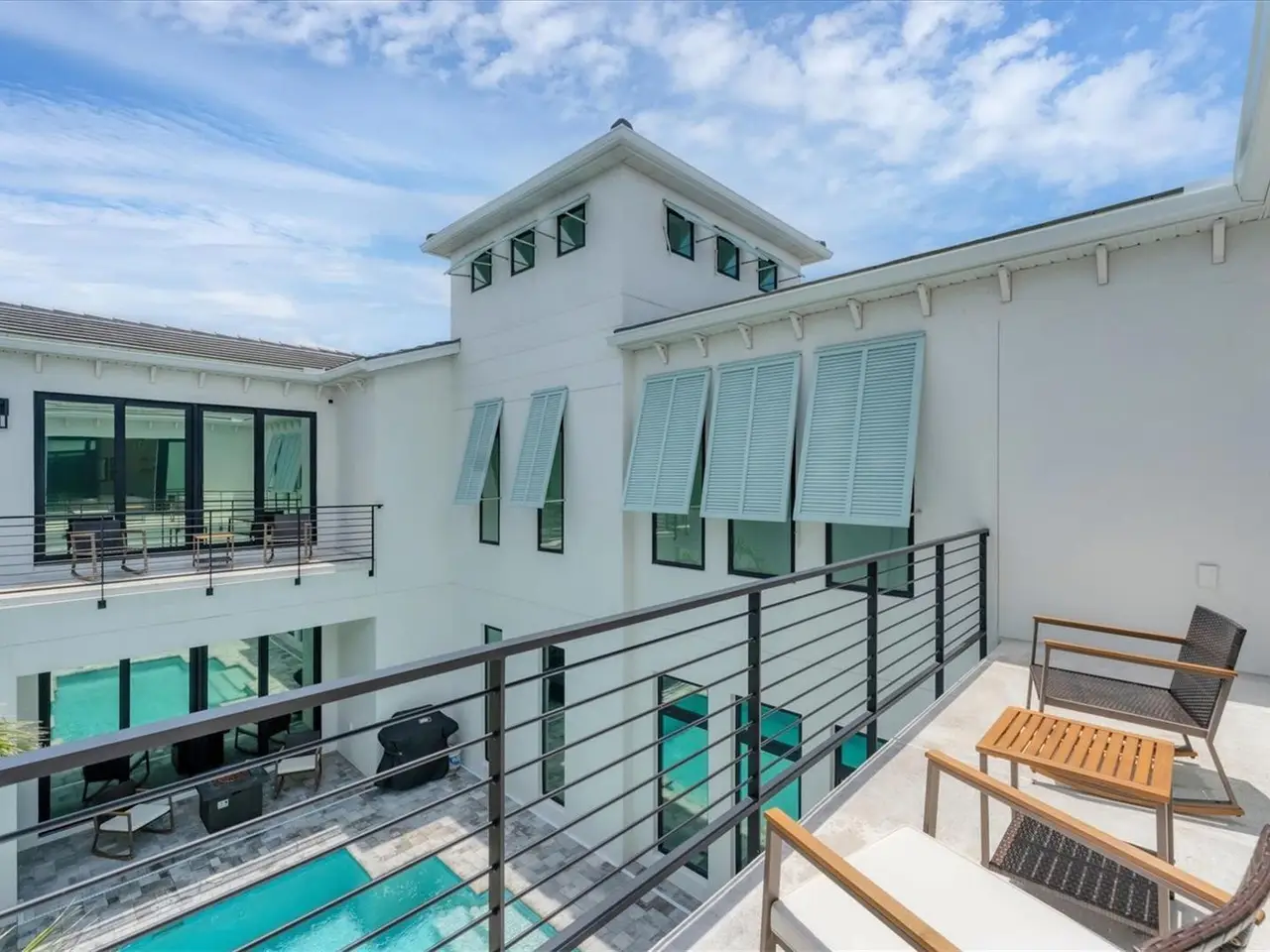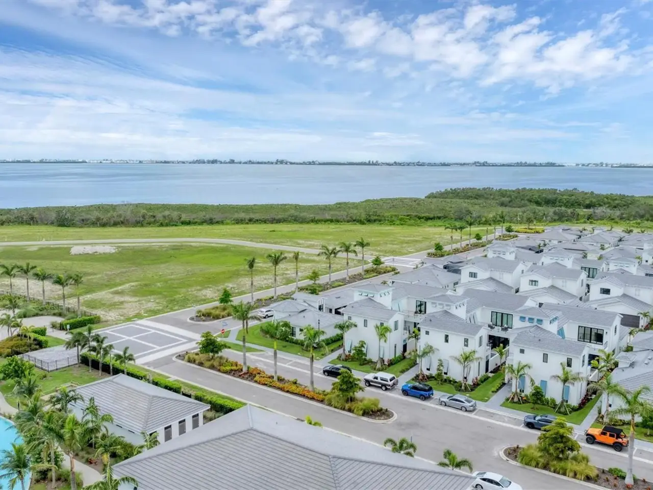 Stunning 2024-built FURNISHED home in premier gated community AQUA LAGOON, located near Sarasota Bay. Set on a premium lot, this two-story residence is steps away from AQUA's signature four-acre blue lagoon and tropical shoreline - bringing serene views and a beach-like setting right to your doorstep. Featuring high ceilings, brand-new luxury vinyl flooring in some main living areas, and an elegant European-inspired interior throughout, the main level features a bright and airy open-concept layout with a formal dining room, oversized living room, flexible den/office space, and a cozy nook beneath the staircase, perfect as a sitting or lounge area. A masterpiece of design, the gourmet kitchen boasts beautiful wood cabinetry and large ceiling beams, creating a warm and welcoming ambiance. The large center island features a gas cooking and seating for four, while Caesarstone quartz surfaces and stainless steel appliances round out this dream cooking space. Upstairs, the primary suite offers a private balcony overlooking the pool and courtyard, an oversized walk-in closet, and a spa-inspired bath with dual vanities, walk-in shower, and freestanding Jacuzzi tub. Two additional guest suites, each with full bath and one with its own balcony, plus a second living room and a well-appointed laundry room complete the upper level. The tranquil outdoor oasis centers around a private courtyard with a salt-chlorinated pool with waterfall feature, and covered lounge area. Additional features include a two-car garage with epoxy flooring and luggage shelving, paver driveway, four-zone A/C, impact-rated windows and doors, gas pool heater connection, and a Sonos sound system with room-by-room volume control. Ideally located near IMG Academy, IMG Golf Club, Anna Maria Island, Cortez Village, SRQ Airport, and a short drive to shopping and dining destinations including UTC and St. Armands Circle. Enjoy the perfect fusion of luxury living and waterfront tranquility in this exceptional home where every day feels like a resort getaway.
