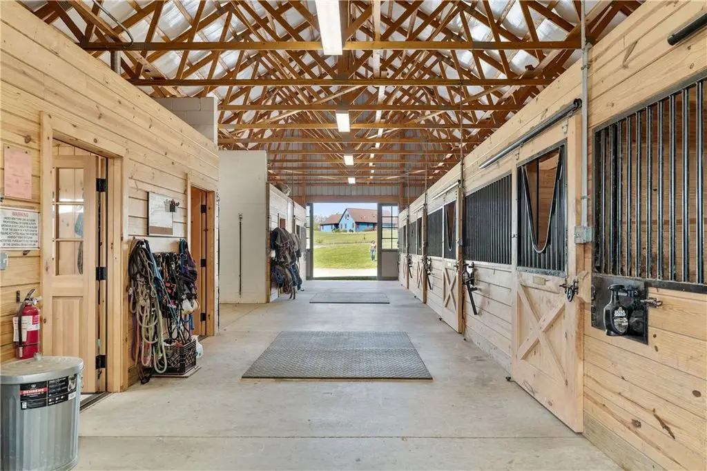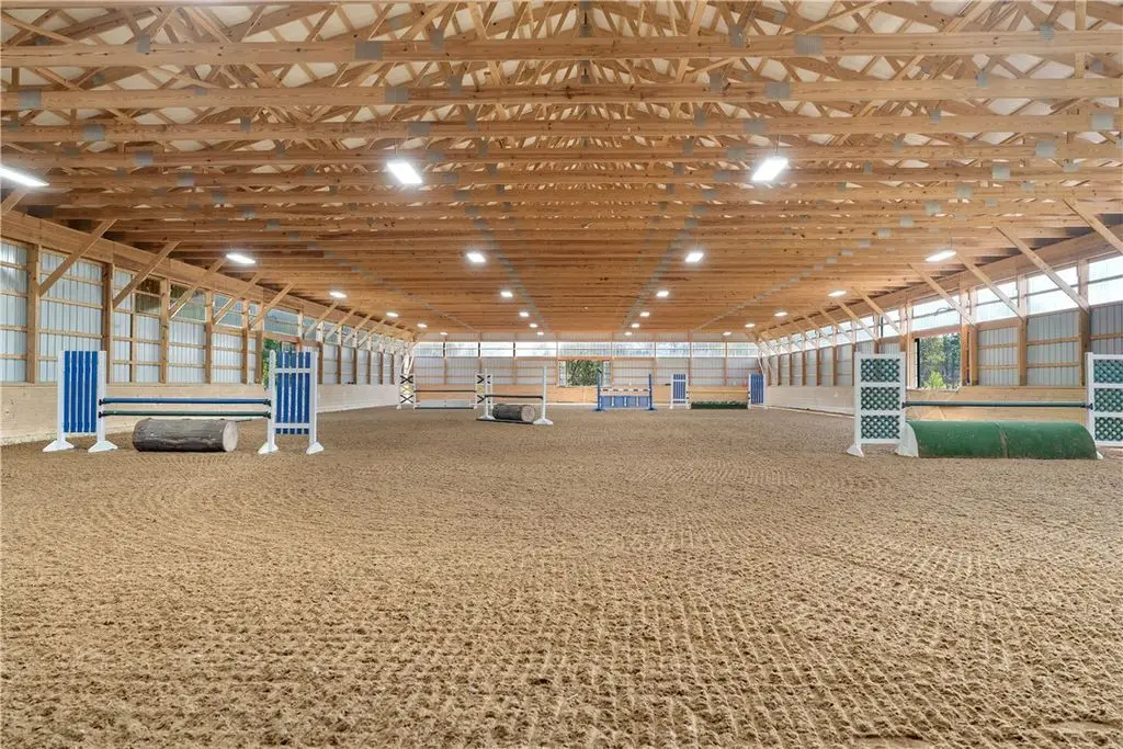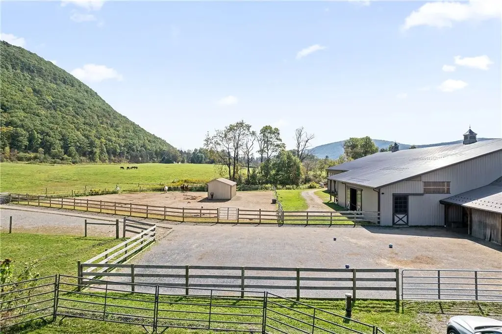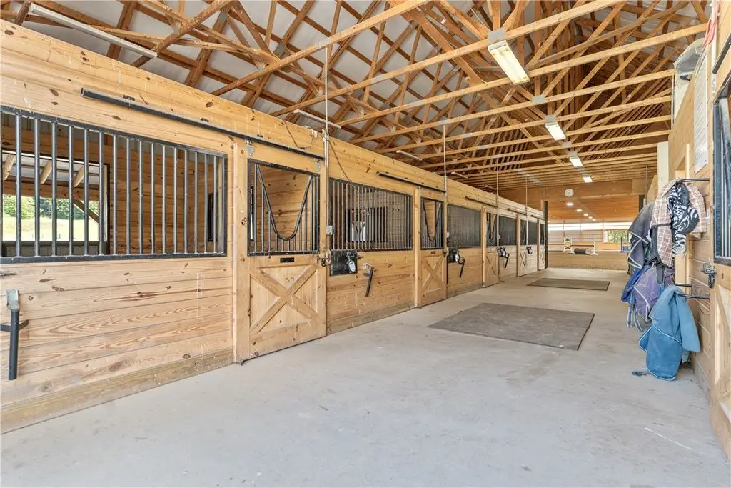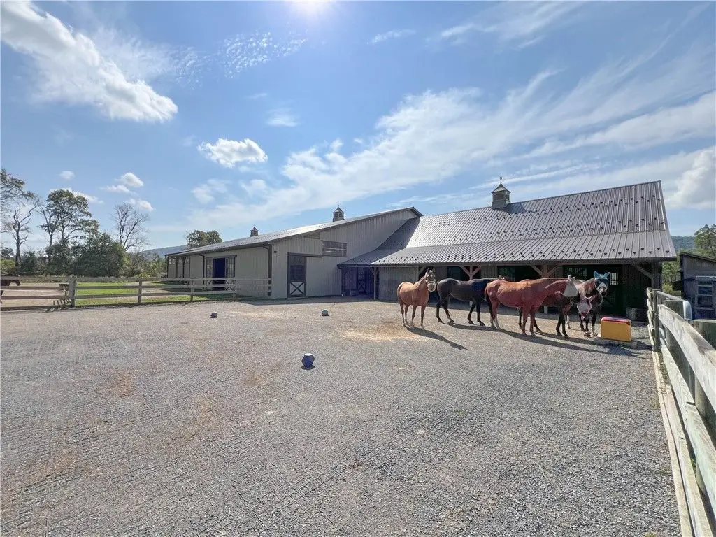 This exceptional equestrian property offers a rare combination of features. Set on 30 acres only 15 minutes from Cornell University in the Finger Lakes region, this facility's amenities are top of the line! The barn features 6 stalls, all with 12x12' mats, outlets and automatic waterers, a wash stall, heated bathroom, feed room, and heated tack room with observation area. 5 stalls have Dutch doors to the run-in shed and dry lot paddock that leads to a 20-acre pasture. The 80 x 160 indoor arena is perfect for year-round equestrian needs and the professionally built turf riding field with cross country jumps offers even more riding space. An additional paddock with run-in and large storage area off the arena round out this elite facility. Relax and watch your horses through the wall of windows in your 2020, 3-bedroom home with an open floor plan, 9-foot ceilings, lots of light, a perfect primary suite and plenty more space in the basement to expand or use for gym/rec activities. Geothermal heat for the home and solar for the house and stable result in very low utilities. Currently an income producing boutique boarding business. Continue a business or use it all for your own horses!