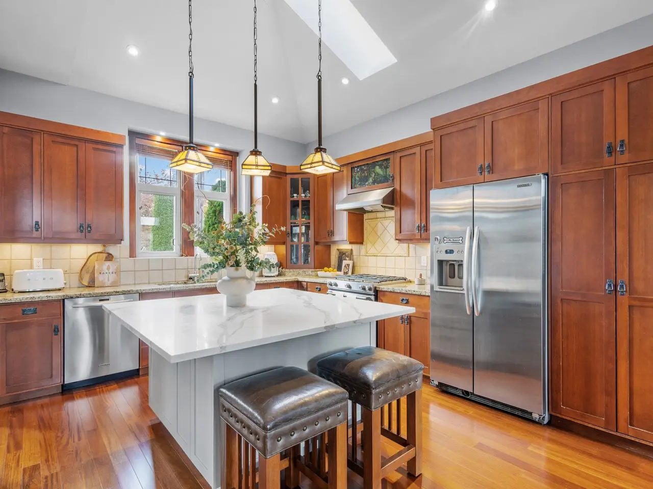 Discover a luxury Residence located in North Bby's Finest Neigbourhood THE HEIGHTS! This One-of-a-Kind Home was European Built w/ the Extensive use of Solid Cherry Wood Floors + Fir Milwork Finishing. Magnificent Foyer w/ Expansive Floor Plan offers Executive Living with a Formal Dining Room adjacent to a Chef Inspired Kitchen + Family Room perfect for Entertaining. Above feat's 2 Large Beds w/ a Jack-n-Jill Bath + Stunning Primary Bedroom adorned w/ a Massive Hotel Style Ensuite w/ a Luxurious Soaker Tub, Walk-in Closet & Fireplace! Below has a Lg 1 Bed, Bath & Den Studio Suite w/Sep Entry + Office nook & Flex Space. Step out to your Fully Fenced Yard, Private Patio, Built-in BBQ + 2-way Fireplace & Double Detached Garage w/ Lane Access! Steps to Shops, Cafes & Schools. Call to View!