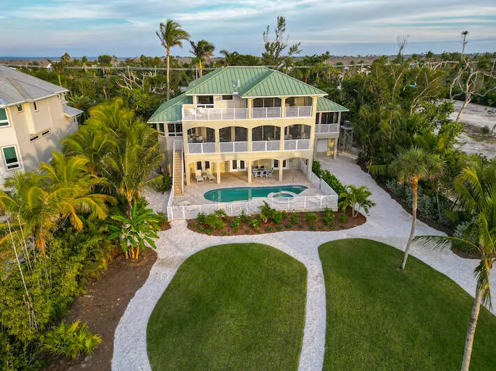 SOUTH HAVEN - Experience unparalleled tropical luxury at South Haven, a meticulously designed concrete piling home that seamlessly blends elegance and functionality. Recent enhancements include a fully remodeled kitchen, dining room, and primary bath, along with a 2023 roof replacement and premium finishes throughout. The main level features a sunlit foyer, guest accommodations, and dual guest retreats in a private wing. The redesigned kitchen boasts modern amenities and a bright dining nook, while the living room offers sweeping coastal views. Upstairs, the owner's suite captivates with Gulf of Mexico vistas, a stone-clad electric fireplace, and sophisticated woven flooring. The ground level includes a spacious garage and versatile spaces, all accessible via an elevator serving every level. Outside, Royal Palms frame the exquisitely designed pool area, complete with a sunbathing platform, covered dining, and lounging spaces. A beachside yard features a private cabana, landscaped greens, and a serene walkway to the shore. South Haven is the ultimate coastal retreat, offering exceptional craftsmanship, lush surroundings, and unforgettable sunsets.