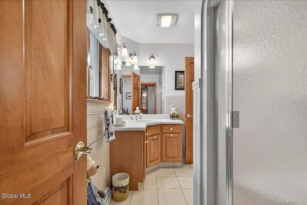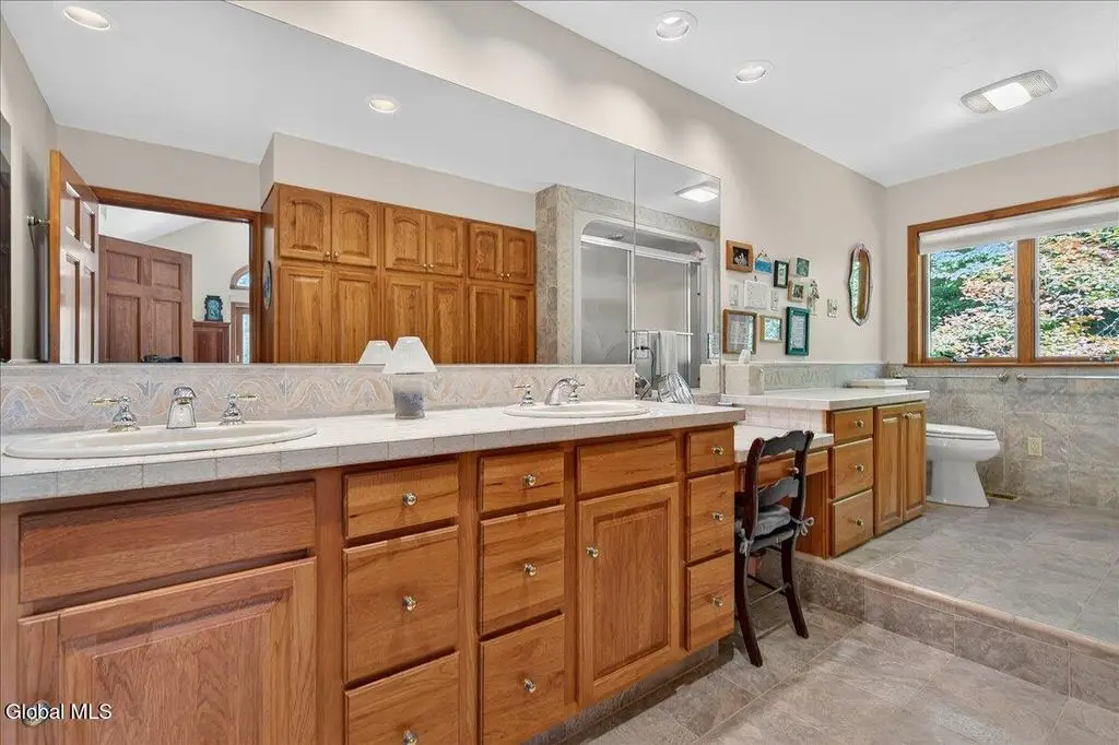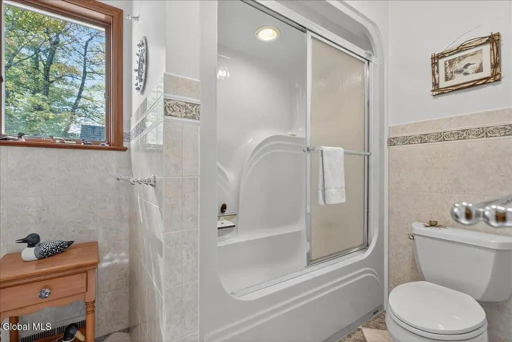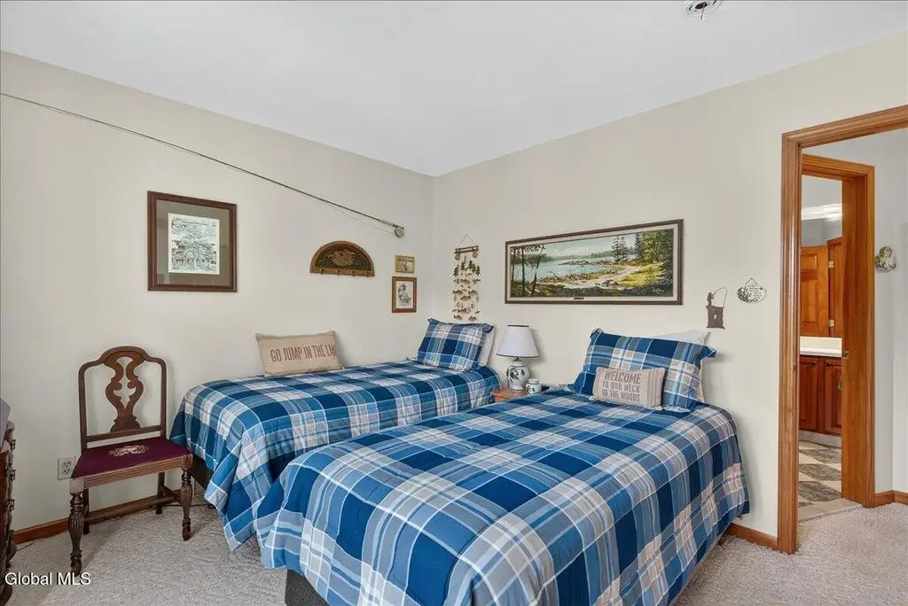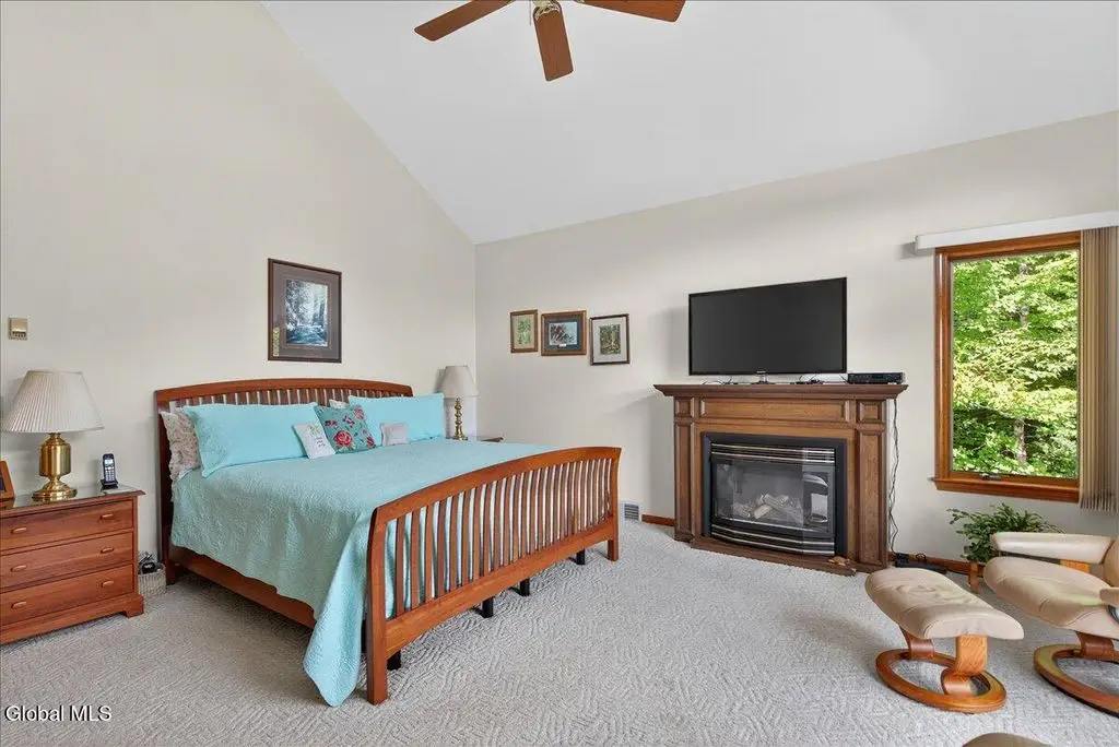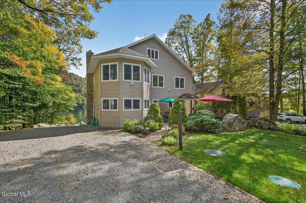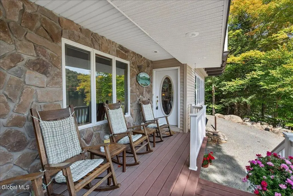 Welcome to Cozy Nook! Discover a truly unique property nestled on Green Lake, a tranquil and pristine lake framed by the breathtaking Adirondack Mountains. This remarkable lakefront home offers the perfect blend of comfort, space, and natural beauty-ideal for year-round living or a peaceful retreat. A spacious 2500+ living area with soaring 9-foot ceilings, create an open and inviting atmosphere. Open concept living room with floor to ceiling stone fireplace hand-built by a skilled stonemason, 12' x 4' Douglas Fir beams and glass doors. The heart of the home features a large kitchen designed for both functionality and style with solid Cherry cabinets, SS appliances and casement windows with a view of the lawn and woods. The formal dining room is perfect for gathering in comfort. Upstairs offers four bedrooms, each with its own charm. Primary suite boasts a stunning cathedral ceiling and a private balcony to watch the sunrise over the lake. The fourth bedroom doubles as a home office, complete with a built-in desk overlooking the back patio, lawn, and surrounding woodlands. Enjoy the convenience of three full bathrooms-two upstairs with tub/showers and one on the main floor with a walk-in shower. A spacious attic on the third floor offers potential for future expansion, while the full basement includes an overhead garage door, separate entrance, workbench, utility sink, and extensive storage. Outside, the property continues to impress. A separate two-car garage with a generous second floor that can be used for storage or converted into additional living space. Relax in private on the stone paver patio outside the kitchen. Chill around the stone fireplace and play on the large lawn area. The front deck provides sweeping views of Green Lake, A private dock with a seating area invites you to relax by the water and the canopy boat house. With its peaceful setting and stunning natural surroundings, Cozy Nook is more than a home - it's a lifestyle!