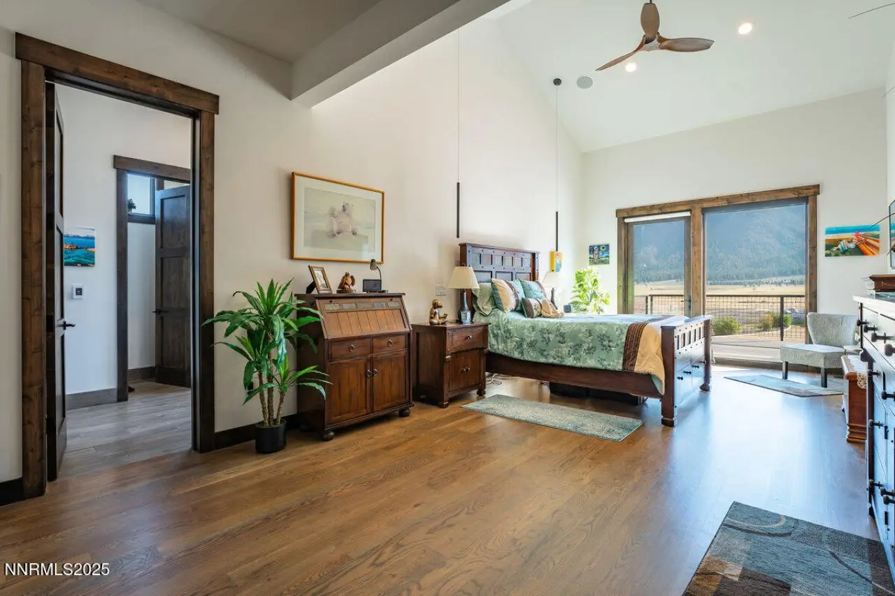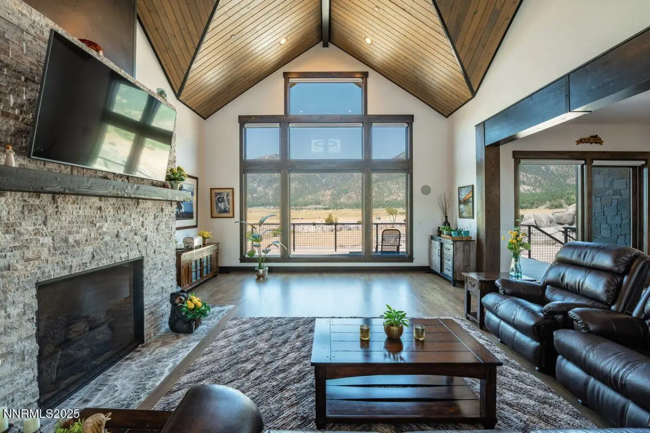 Secured behind the private gates of Coyote Ranch Estates, this newly built custom home sits on 2 acres with breathtaking views of Jacks Valley Ranch and the Sierra Nevada Mountains. This architectural masterpiece boasts a seamless blend of modern elegance and traditional design elements. Upon entry, you are greeted by a grand great room featuring solid hardwood floors, soaring vaulted ceilings, and expansive windows that frame panoramic views. A stunning hardwood ceiling and metal trim accentuate the room's grandeur, while a state-of-the-art built-in surround sound system, electric shade system, and easy access to the expansive fortress deck and paver patio enhance the home's entertainment capabilities. The chef's kitchen is a true focal point, outfitted with top-of-the-line commercial-grade KitchenAid dual-fuel range, cooktop, 48-inch refrigerator, and built-in microwave. The solid Adler wood cabinetry complements the striking quartzite countertops, and the Kohler undermount sink adds both style and function. The main-level master suite offers a serene retreat with mesmerizing views, a luxurious custom bathroom with a large standalone steam-shower system, a freestanding bathtub, heated floors, and power mirrors. Upstairs features an additional ensuite bedroom and family room with half bath, Brazilian Tiger Wood flooring, a full bar with built-in refrigerator, and another stunning hardwood ceiling complete the upper level. This home also features an oversized three-car garage with electric vehicle charging capabilities, as well as beautifully landscaped grounds with ornamental trees, shrubs, and grasses. Granite rock boulder walls and an elegant water feature further enhance the property's appeal. Coyote Ranch Estates is a boutique community of just 16, two acre homesites, offering privacy, security, and convenience-minutes from the historic town of Genoa, Genoa Lakes and Ranch golf courses, Minden-Tahoe Private Airport, the areas super stores and a short drive to Lake Tahoe. This is more than a home-it's a lifestyle.