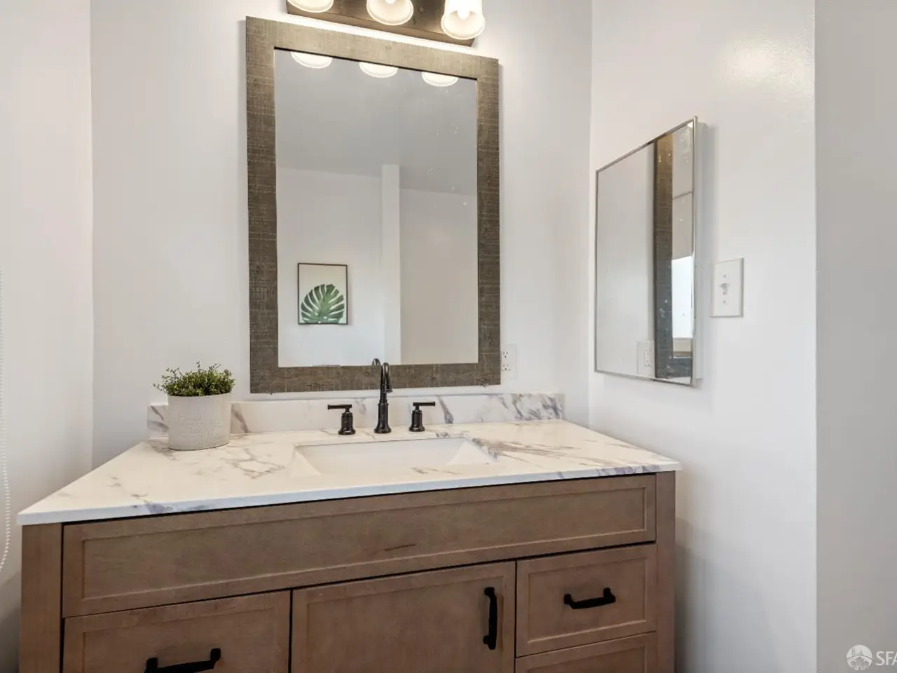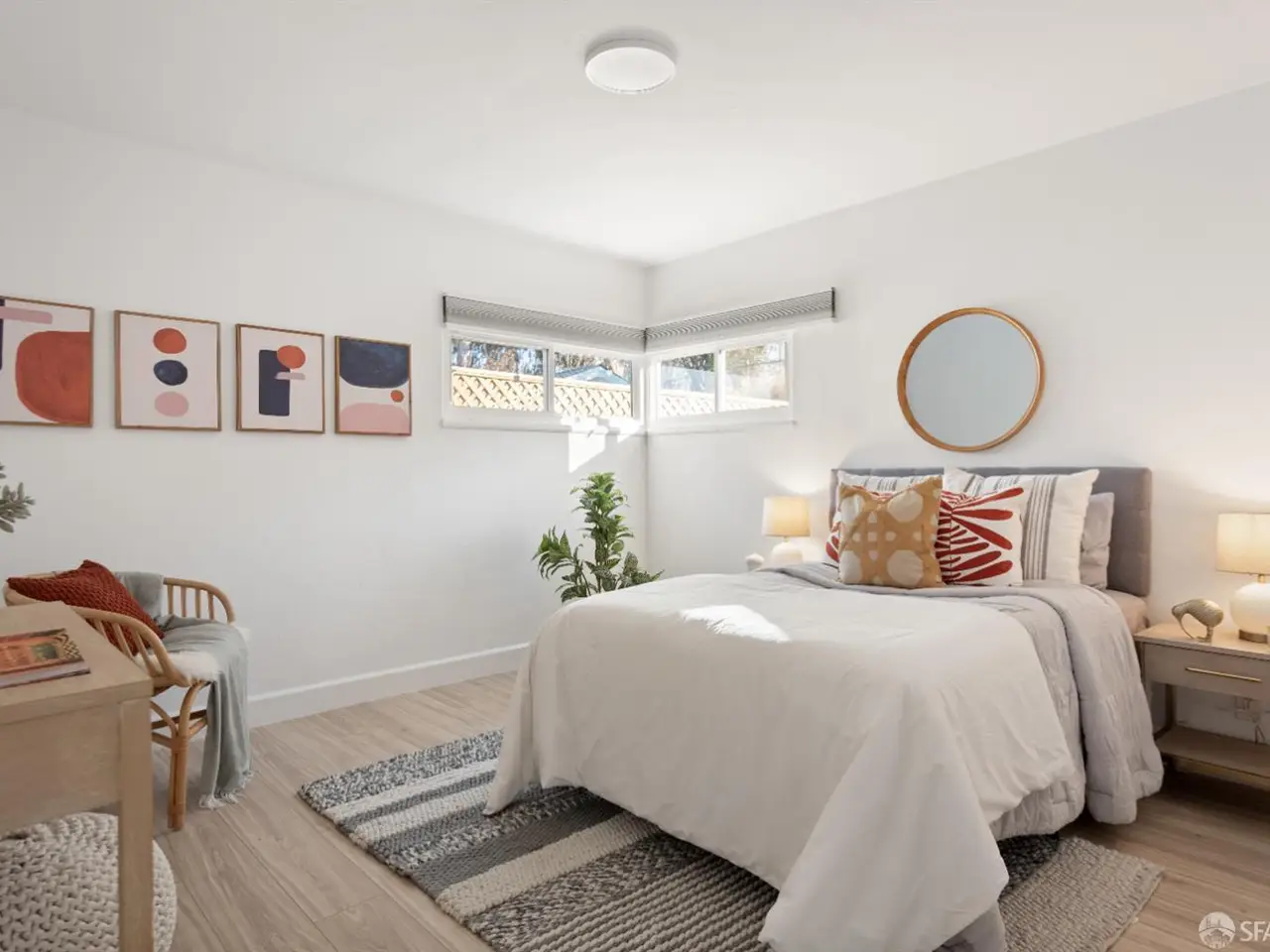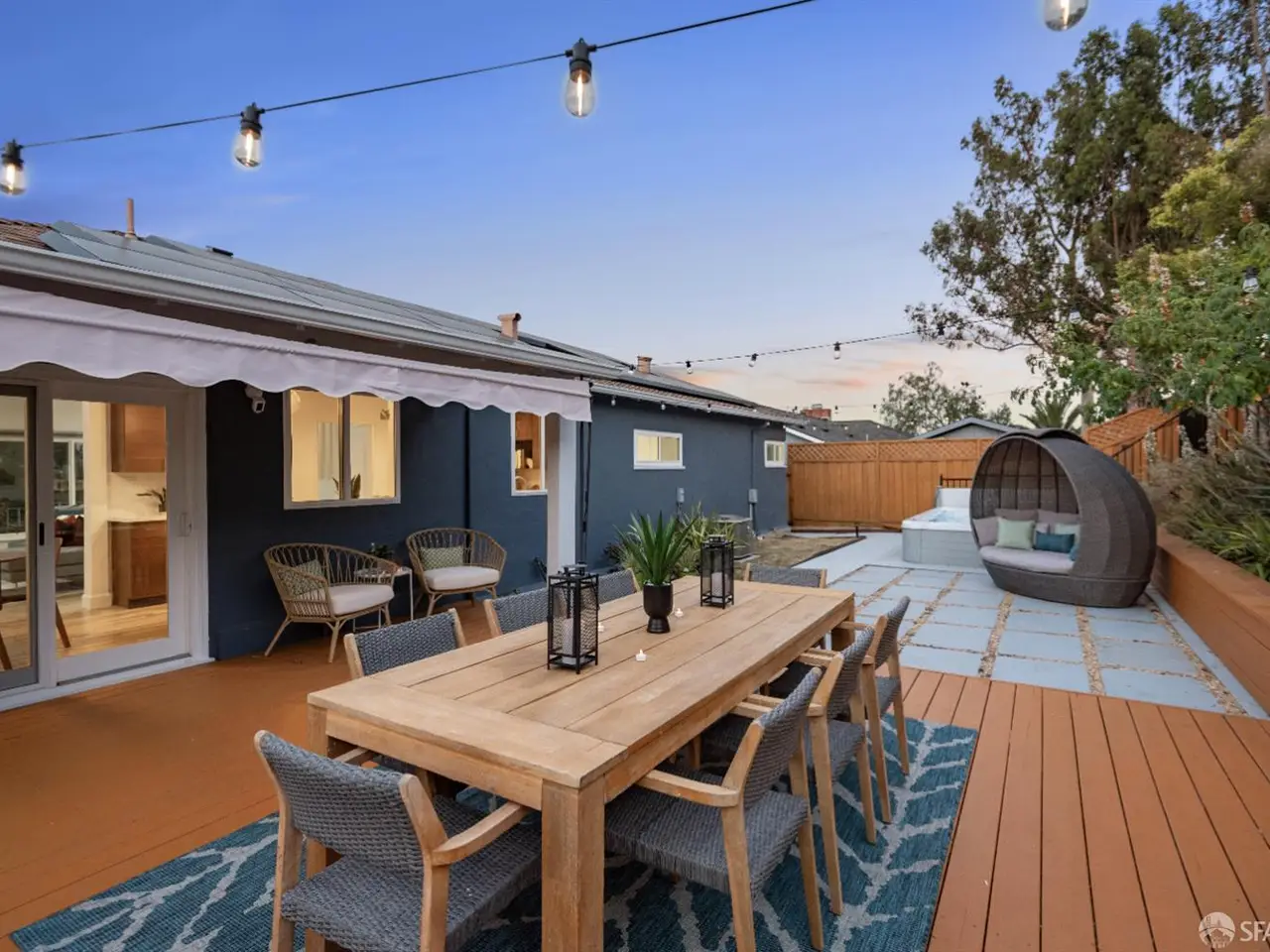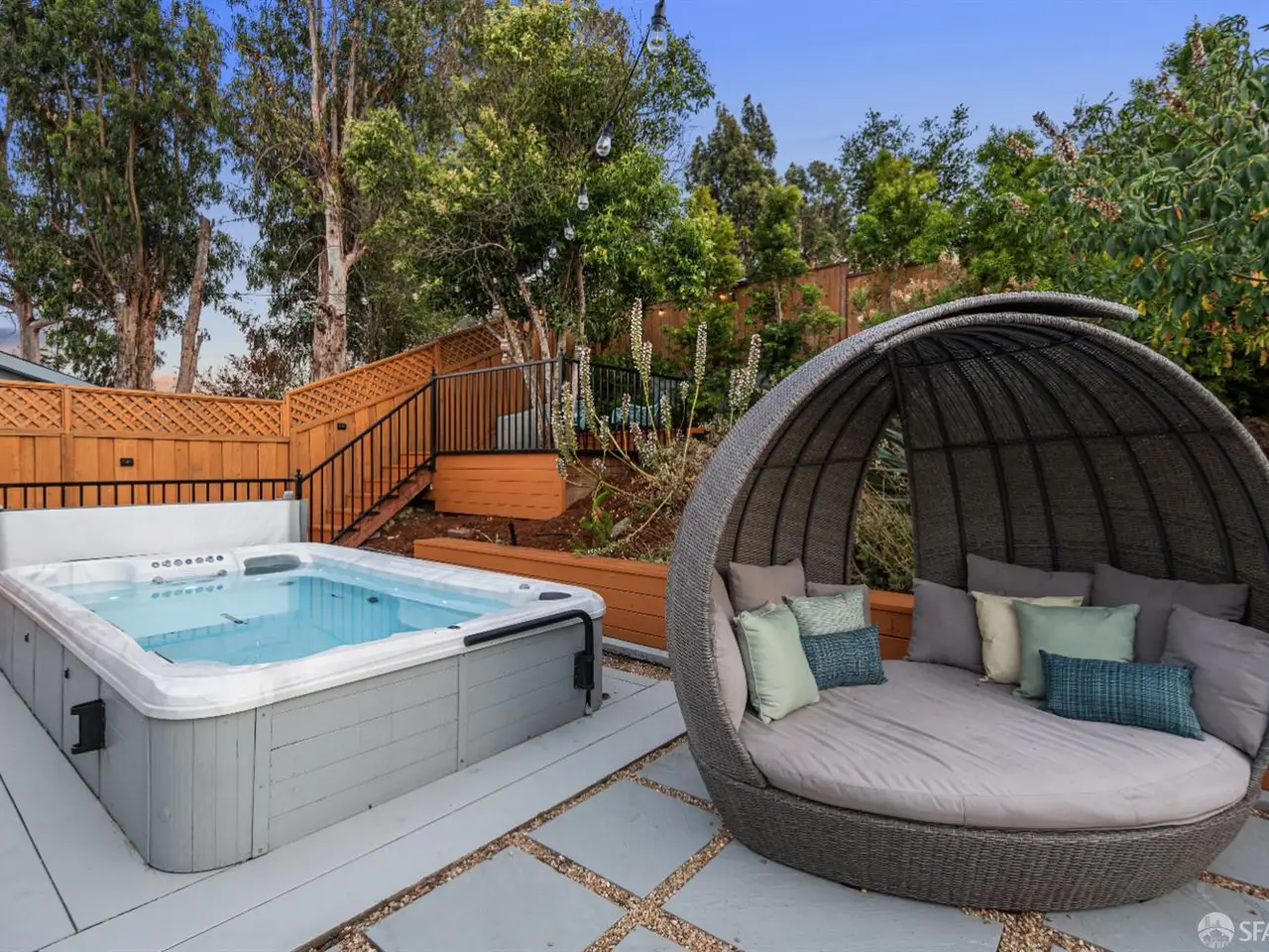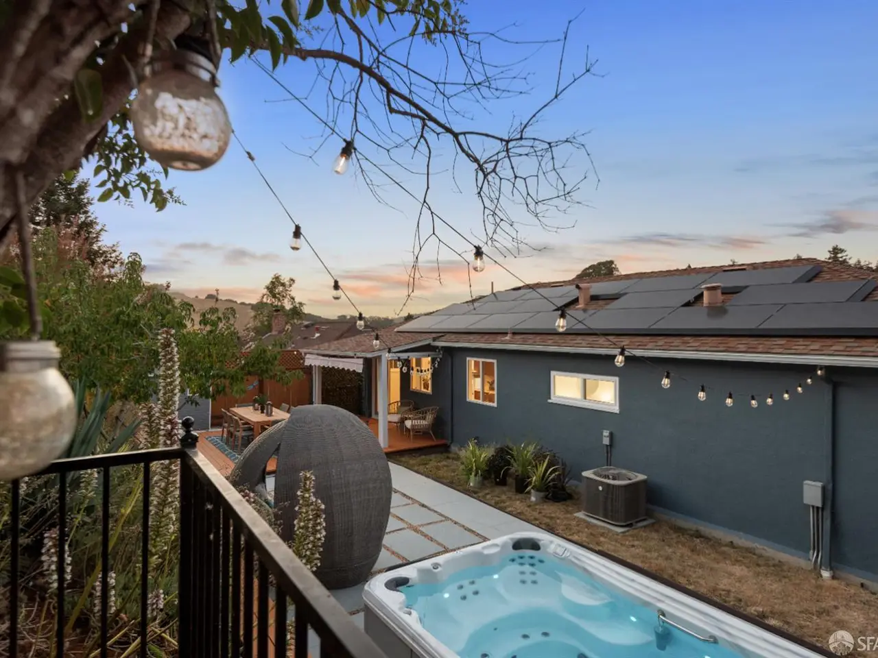 Thoughtfully renovated mid-century modern home featuring 3 bedrooms plus a bonus room, 2 bathrooms, and a private heated pool/spa combo nestled at the end of a cul-de-sac in beautiful Castro Valley. With 1,699 square feet (per public record), this home blends comfort, style, and functionality. The main level offers new vinyl flooring, a bright open living/dining area, and a large picture window with hillside views. The updated kitchen includes updated cabinetry, quartz countertops, built-in oven, and an induction cooktop. Bathrooms feature new vanities and sinks. Downstairs provides a spacious family room, second updated bath, basement storage, and garage access, including a Tesla charger. Outdoors, enjoy fresh front landscaping and a graded, established backyard with seating areas, bird-feeder, large shed, and heated spa/pool with jets. Home is energy-efficient with solar panels and two Tesla power wall battery backups. Additional upgrades: new appliances, baseboards, lighting, and fresh interior/exterior paint. Close to schools, BART, shopping, and parks.