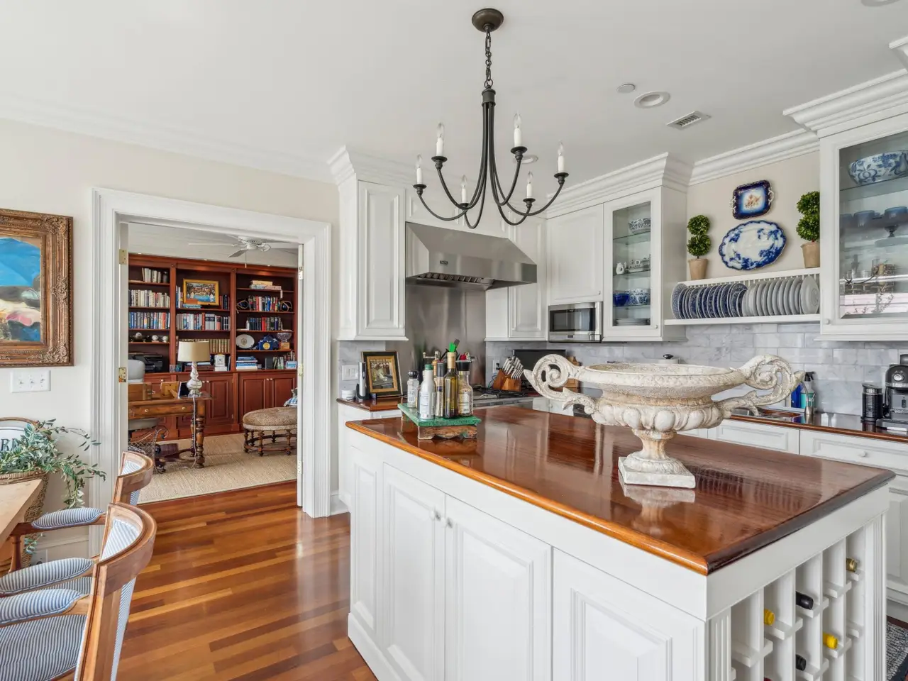 Rare, elegant penthouse-level apartment offering southern views of the Charleston Harbor from the living/dining room and terrace, with historic steeple views from the primary suite. This spacious residence offers the very best apartment floor plan in the city. Luxurious trim and mouldings throughout, this fine apartment lives like a grand home. Well-proportioned formal space with separate formal living room, and dining room divided by a mahogany paneled wet bar and storage. The side hall gallery connects the formal and informal spaces with abundant storage. The well-appointed kitchen offers a separate breakfast area with views of the harbor and beautiful sunrises. Adjacent to the kitchen is a library with mahogany built-ins and another fireplace perfect for evenings or desk working. The bedroom wing offers a comfortable guest bedroom with en suite bath. The luxurious primary suite features another fireplace with abundant light throughout. This suite is unique with two separate baths and two walk-in closets, all en suite. With its prime location, walkable to the very best restaurants and shopping, along with two garage spaces below, this luxurious residence is hands above any in the city.