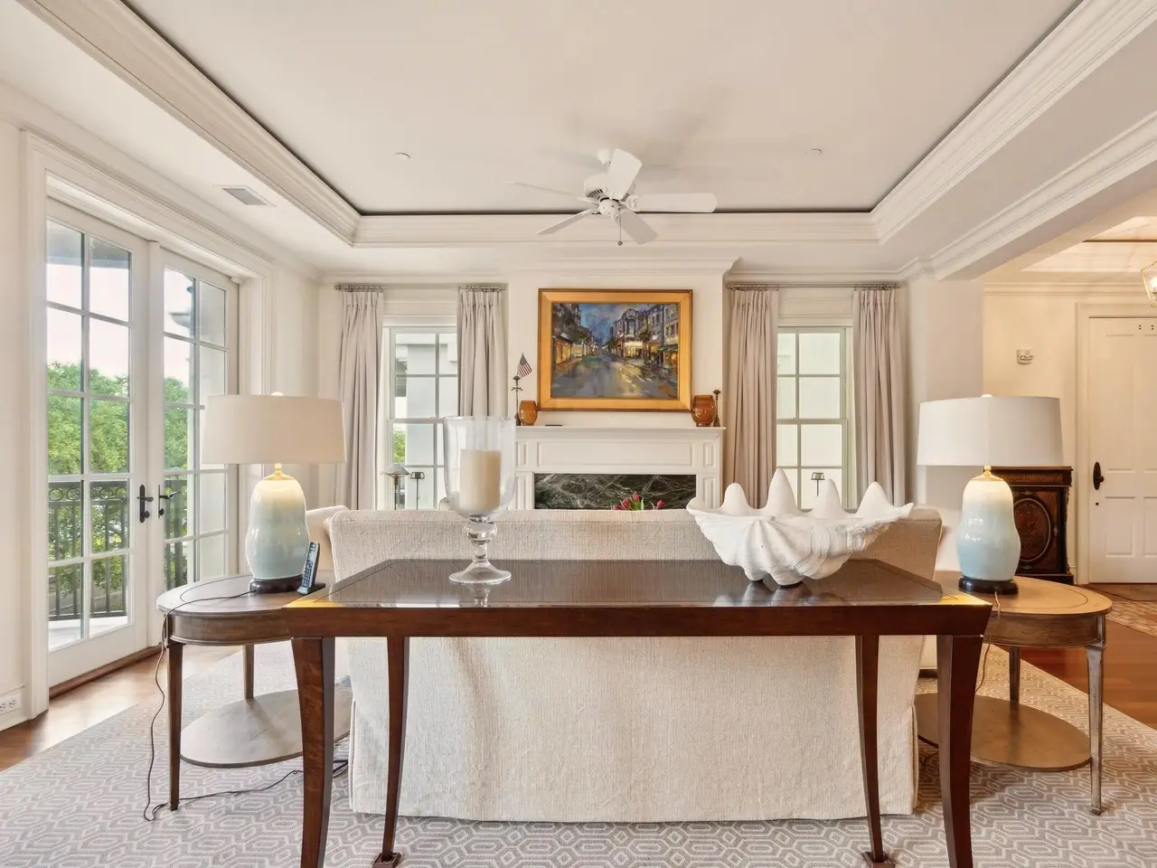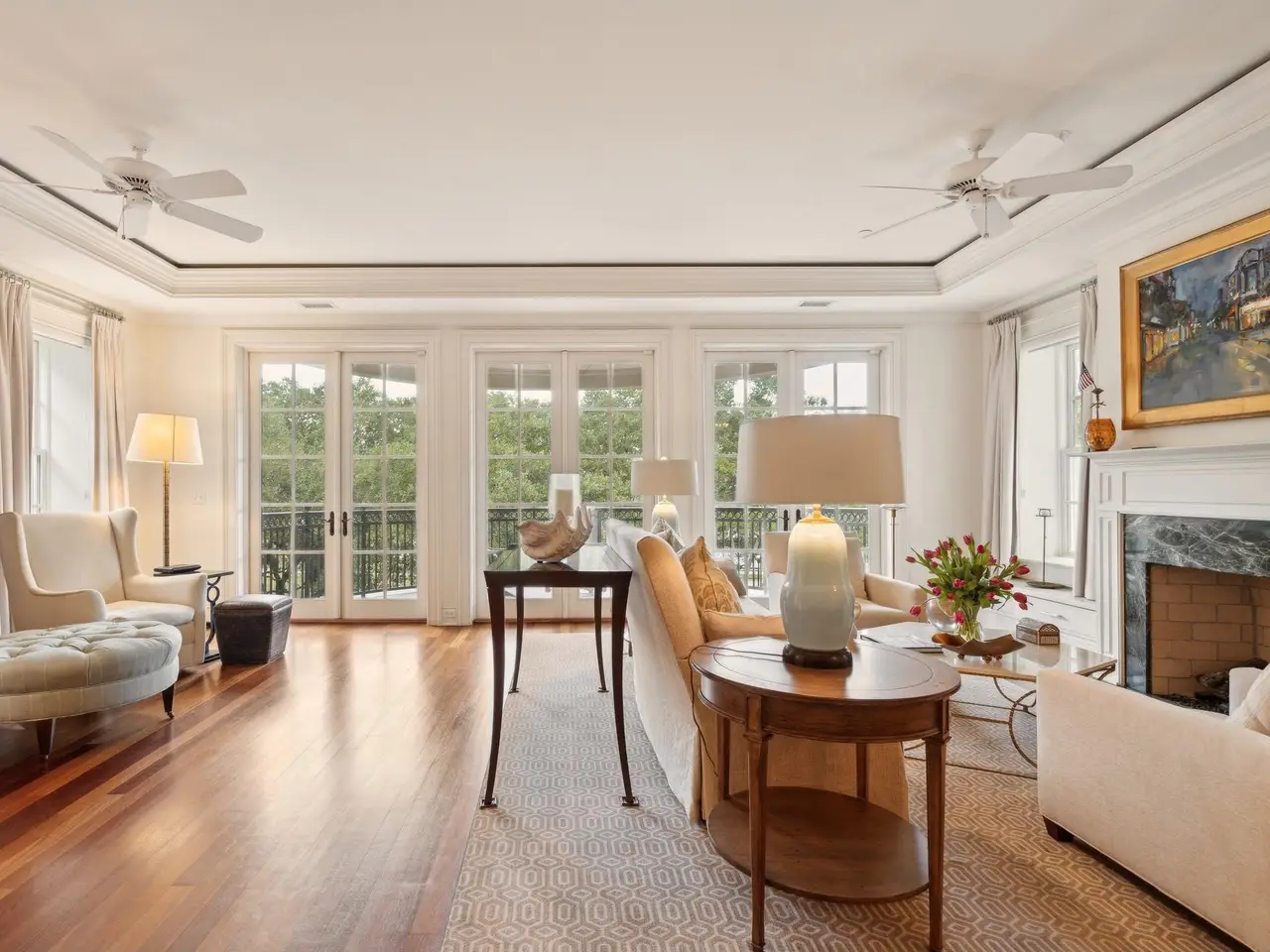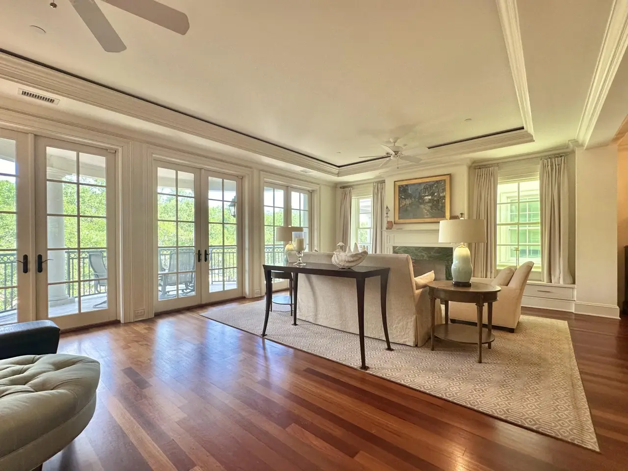 Factors Walk: the best there is in location, style, and maintenance-free luxury. Designed by Goff D'antonio Architects with historic Charleston as inspiration, this Classical Revival building has become a waterfront landmark. Distinguished by triple tiered columned porches overlooking the park, the Palladian style is continued in limestone-trimmed true stucco construction on a piano noble base. Apartment 3A is the largest of only 7 residences and runs the full depth of the building from the front piazza to a solarium at the rear. Parkside entry for guests with stone steps and gas lanterns. A coded elevator is accessed from secured garage parking, or from the gated garden entry. Grand rooms with floor to ceiling windows. Spectacular kitchen with fine cabinetry, three fireplaces, mahogany paneled elevator, piazza with columns and stone flooring, hurricane proof windows and doors, primary bedroom with fireplace and sitting room/office, building and residence security systems. Currently set up as a two bedroom, the library can easily be converted back to third bedroom.