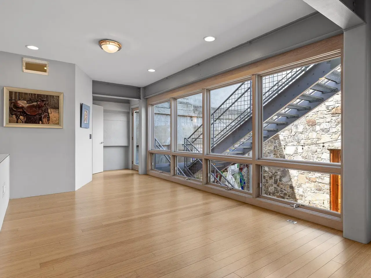 Facing Williams Street, the three-story facade has an industrial feel with a limestone and zinc exterior and a dramatic series of 10-foot doors opening into the vaulted gallery. The second level is a great room with a wall of windows and full bath. The residence is on the top floor and has an open living space with floor-to-ceiling windows highlighting the mountains.