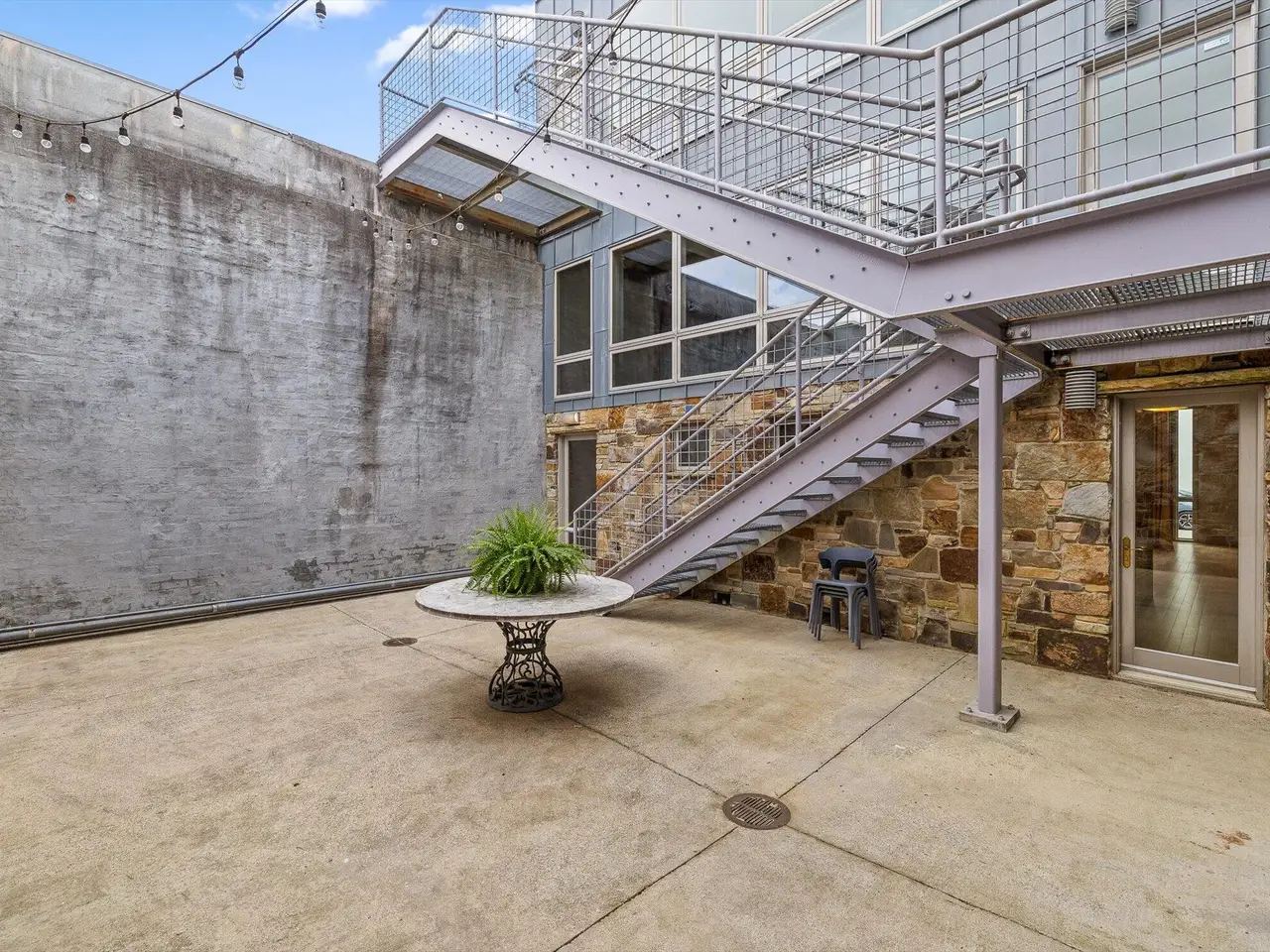 An intimate, European-inspired courtyard connects the front building with the rear studio. This courtyard features beautiful stonework as well as a mosaic mural covering the entire south wall. These mosaics, and others interspersed throughout the property, are originals created by the owners. This central space is perfect for quiet reflection or big parties (but the adjoining catering kitchen encourages entertaining)