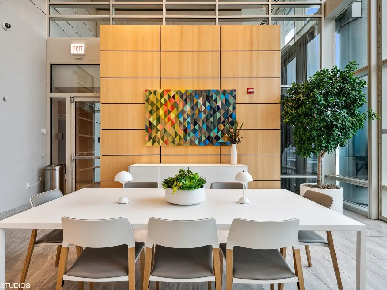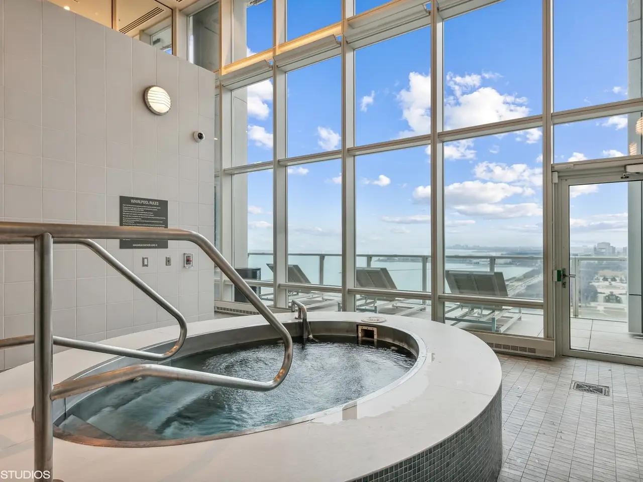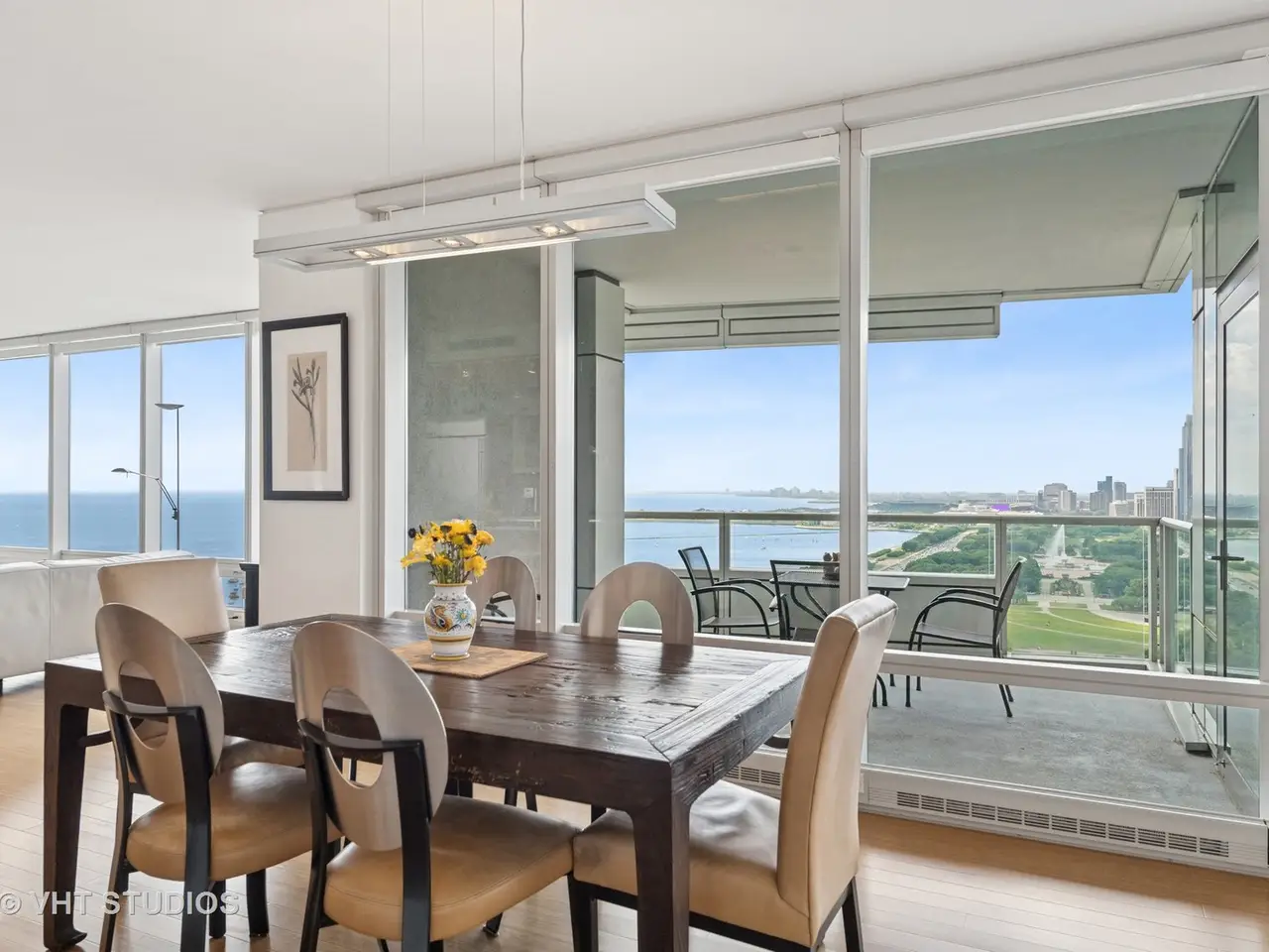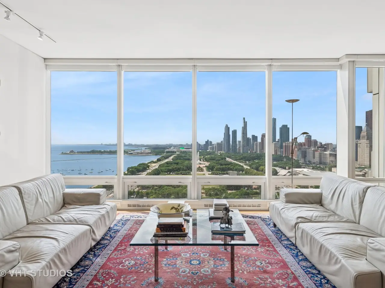 Floor to ceiling windows offering panoramic views of Lake Michigan, Museum Campus, and cityscape