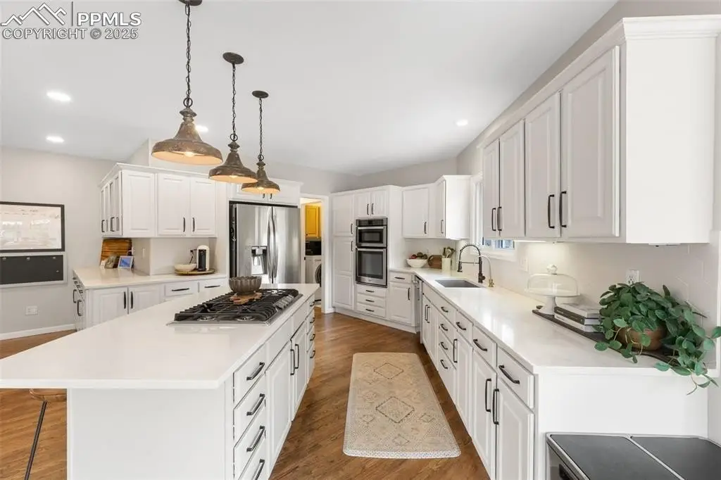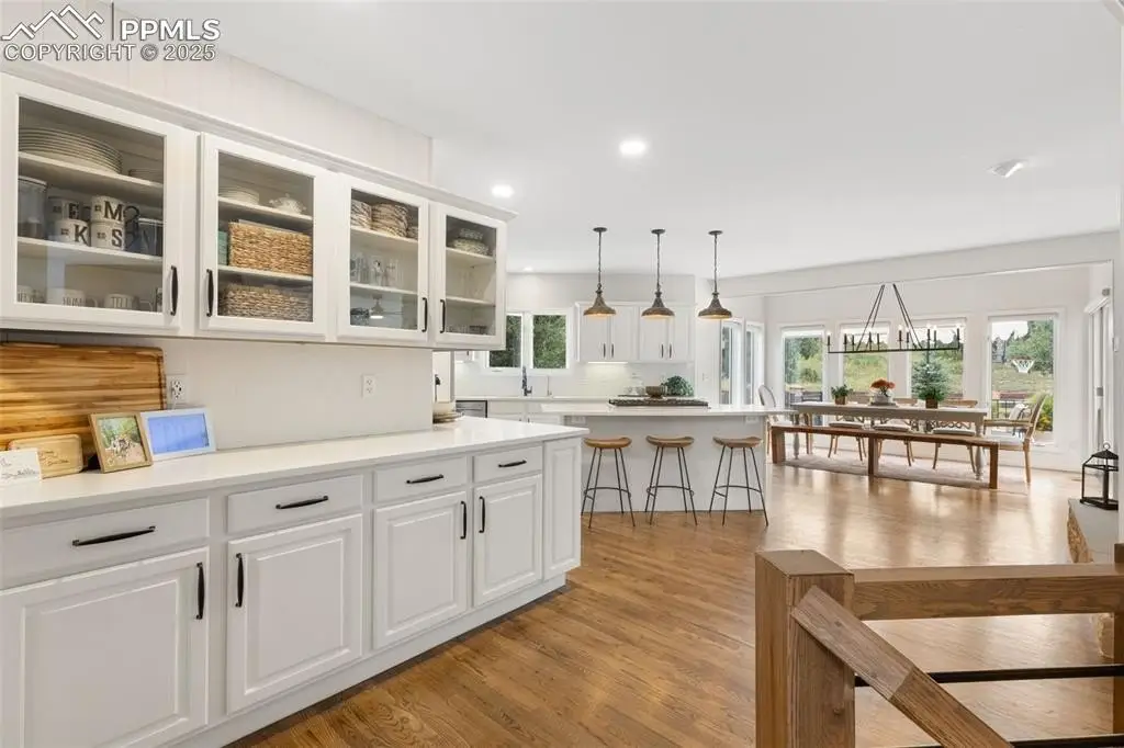 Stunning home in Rockledge at Peregrine boasting timeless style and designer finishes throughout. From the moment you enter, hardwood floors and an open floor plan set the stage for this inviting residence. The great room impresses with a dual sided stone fireplace and a wall of windows overlooking the backyard. A butler’s pantry leads to the renovated kitchen featuring quartz counters, a sprawling center island, gas cooktop, stainless appliances, and abundant cabinetry. The adjoining bayed dining nook is perfect for family meals. The floor plan offers flexible spaces to fit your lifestyle – formal dining room, office and living room. A half bathroom and remodeled laundry room complete the main level. Upstairs, the spacious primary suite offers a private sitting area, 5-piece bath, and walk-in closet. The upper level boasts three additional bedrooms—one with its own en-suite bathroom, and two connected by a Jack-and-Jill bathroom. The newly finished basement provides even more living space with a large family room, two bedrooms, and a full bathroom. Step outside to an expansive deck overlooking the park-like backyard with a sport court—perfect for entertaining, play, and relaxation. Walk to award winning Woodmen Roberts Elementary, neighborhood park or access acres of hiking trails in Blodgett Open Space. Situated in the foothills of Peregrine, you will enjoy mountain views, mature trees, and wildlife yet you are minutes from I-25 with easy access to downtown Co Springs, USAFA, shopping and dining. This home offers extensive hardwood flooring, new carpet, updated lighting, beautiful indoor and outdoor living spaces, invisible fence for dogs and much more. There is nothing left to do but move in and enjoy the amazing amenities of this home.