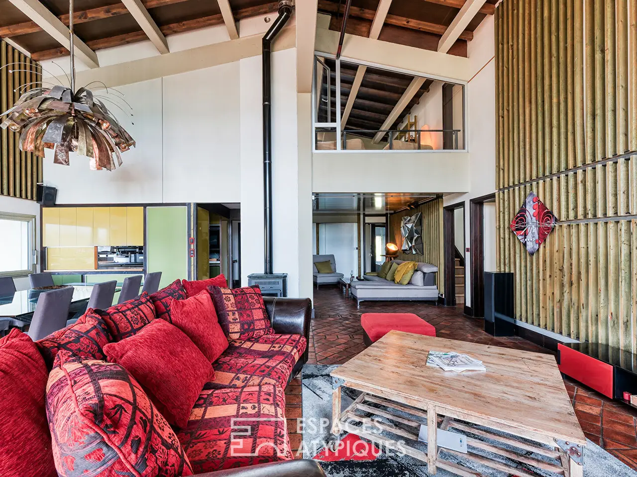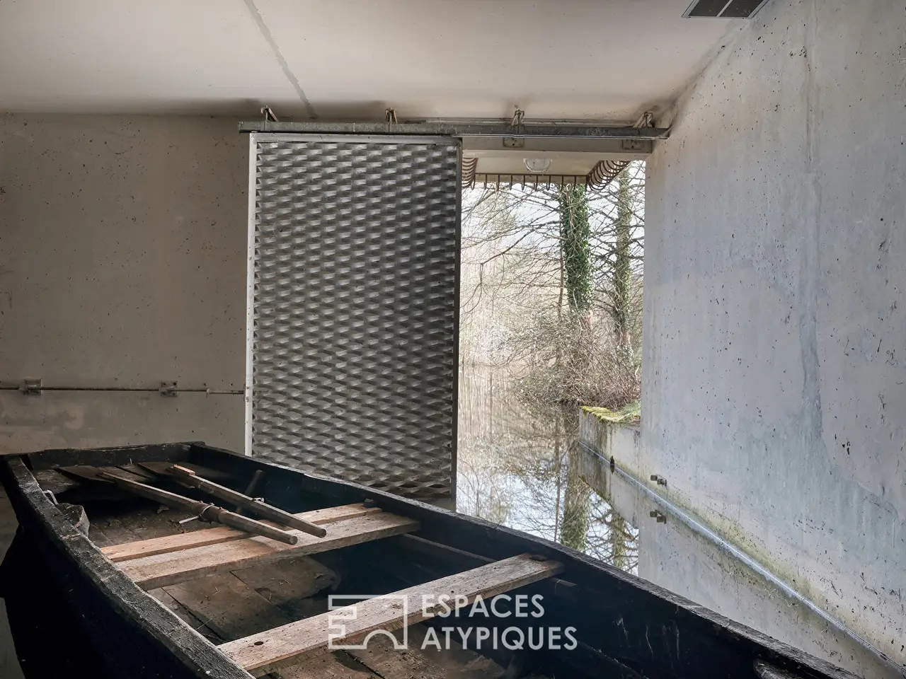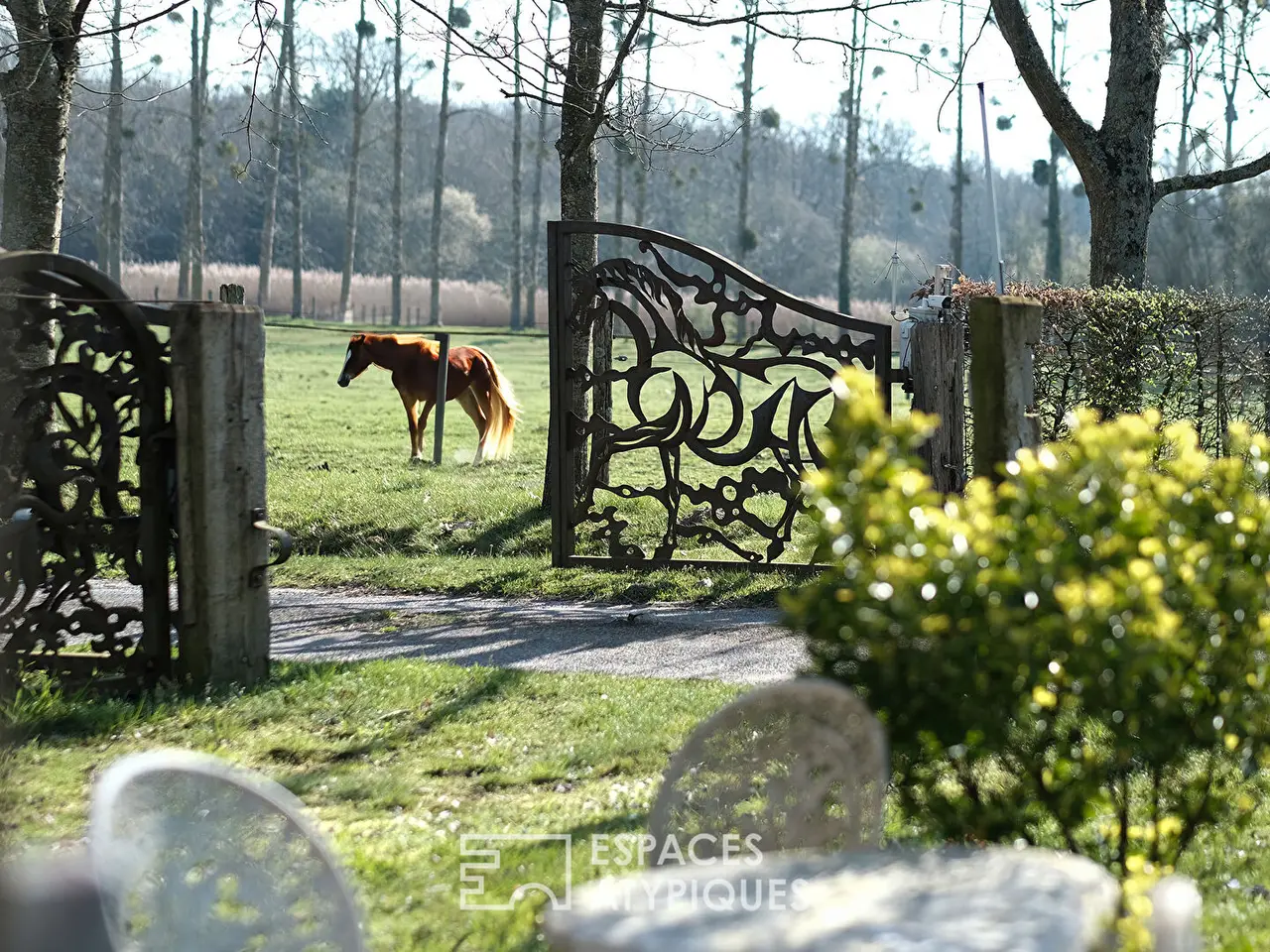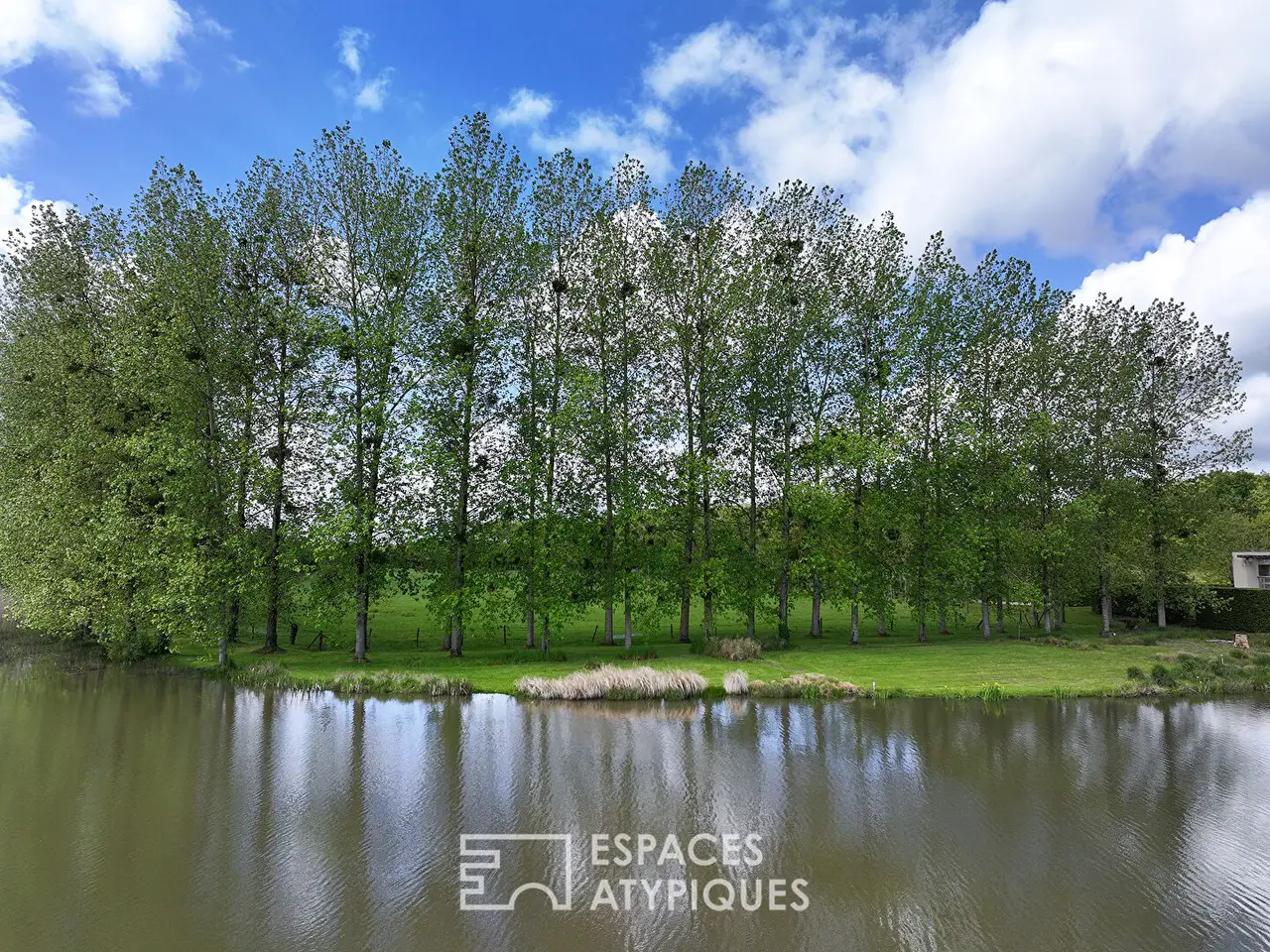 In the heart of the Orleans national forest, 120km from the center of Paris, here is the opportunity to settle in a unique place, the latest project by a resolutely innovative architect. Unique in every way. Unique in its design and architecture. Unique for its location in an incredible green setting. Blend into the landscape, become one with it. This is the guideline of this architectural project. Take a long tree-lined path and not know at first glance where the house starts and the garden ends. To do this, the roof was greened and the walls were adorned with plants thanks to the installation of a chestnut trellis. It is by crossing the threshold of the front door that the singularity of this building is revealed little by little. First with this half-level game which starts from the entrance. The upper half-level leads to the heart of the house, a breathtaking living room. By its volume and its dizzying height, by its specific treatment of the walls and ceiling which bring a dynamic, by its entirely glazed south gable offering a striking panoramic view of the sparkling pond, where the dancing reflections of the sun create a symphony of dazzling colors. In summer, the roof overhang and a mobile metal shutter which will gently deploy will keep the interior cool. This living space, although open, offers different spaces, a cozy corner near a first fireplace, the main living room and the dining area in the center then access to the winter garden, adjustable to enlarge the living room, designed like a glass box to enjoy the softness of the winter sun. Adjoining the living room, the kitchen is a successful mix of a family kitchen and a professional kitchen, borrowing certain codes, particularly in the design of the furniture. Practicality is not forgotten by a set of niches which allows direct access to the entrance and makes everyday life easier. On the same level, the four suites have been designed like hotel rooms, each with their own fireplace, with a unique design and each with a different view of the surrounding nature, a true invitation to contemplation and serenity. Discreet, the helical staircase is the spine of the house, connecting each level including the laundry area in the basement and then the basement. The first floor was designed as a single board but on which the game of half-levels is found, which gives it both a feeling of space and the possibility of creating several atmospheres. The range of possibilities is vast, office, play area, library, sleeping area, the imagination is limitless. At the basement level, in addition to the technical rooms, a boat garage invites you to explore the peaceful waters of the pond. But this architect-designed house is not limited to its walls and interior spaces. Gardens with different inspirations punctuate the property, offering havens of tranquility where every corner reveals a new treasure of beauty. An XXL swimming pool nestled in the greenery and its pool house will offer a refreshing oasis for hot summer days. Under the swimming pool, a covered garage and workshop area of ??almost 135 m2 could delight fans of classic vehicles. Multiple annexes (85m2 carport, guard house at the entrance to the property, etc.) as well as numerous equestrian facilities offer an ideal complement to this area. Together, these elements create a symphony of charm and wonder, making this house a unique architectural work, with a fascinating history, in the heart of nature, where emotion blends harmoniously with ingenuity. All amenities in the neighboring town a few minutes by car. Access to Paris via the A6 Les Aubrais station 35 minutes away (direction Paris Austerlitz) ENERGY CLASS: C CLIMATE CLASS: B