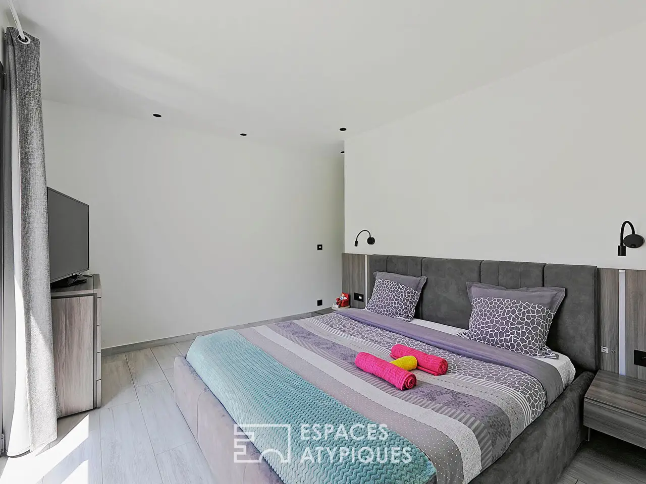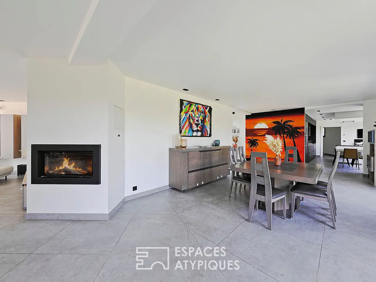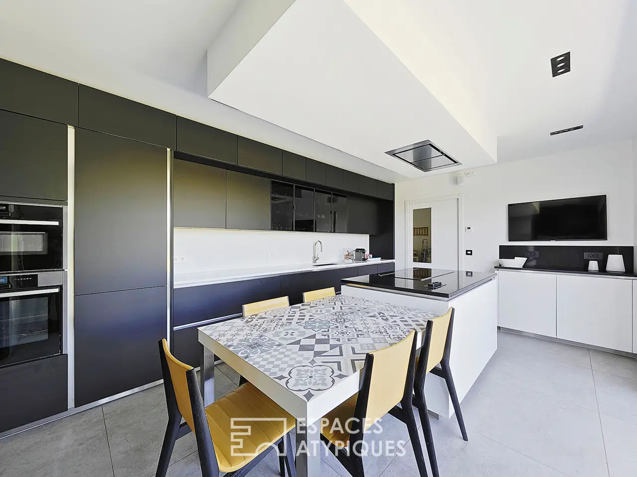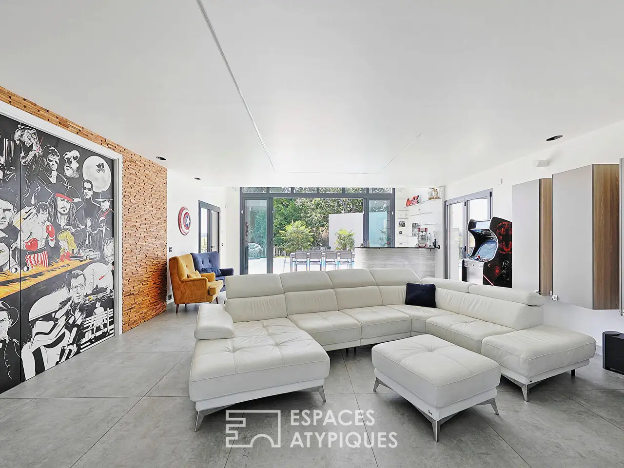 Maison d'architecte avec piscine et jardin paysagerIn a hamlet halfway between Crecy-la-Chapelle and La Ferte-sous-Jouarre in a preserved and green environment, this contemporary architect-designed house from 2018 develops a living space of 442sqm in total on two levels, on a landscaped plot of almost 2800sqm. Designed to combine volume, light and high-end comfort, it has five suites, a heated salt-water swimming pool, a jacuzzi, a 50sqm garage with a fast-charging electric terminal, and an unobstructed view of the countryside. From the entrance, the clean lines, the chosen materials, the brightness and the generosity of the volumes set the tone. The ground floor houses a master suite with a double dressing room and shower room, an office space, a dining room, a separate fitted kitchen with a scullery and pantry, bathrooms, and a living room bathed in light through a bay window opening onto the terrace and the swimming pool. A bar area and a home cinema with multiple screens enhance the conviviality of the place. Upstairs, the glass-floored landing leads to three suites with a dressing room and shower room, a fourth suite with a spa bathroom, a mezzanine living room and a gym/games room. The carefully designed interior layout allows for smooth and functional circulation. The outdoor spaces offer a real relaxing break: a 5×11 m heated swimming pool, a 5-seater jacuzzi, a continuous terrace, a fitted summer kitchen, a shower room and bathrooms for exiting the pool or spa, as well as a landscaped garden structured around various species, olive trees, palm trees, cherry trees and colorful hedges. The equipped well provides watering and supplies the sanitary facilities. One hour from Paris, this property benefits from a bucolic setting while remaining close to amenities, schools and transport links. Solar panels, underfloor heating by insert, reversible heat pumps, double aluminum glazing, home automation and optimal energy performance: a rare property, with an atypical character, ideal for a large family and with strong rental potential, currently operated as an Airbnb. ENERGY CLASS: A / CLIMATE CLASS: A Amount of annual energy expenditure for standard use established from energy prices indexed for the years 2021, 2022, 2023 (subscription included) between EUR965 and EUR1305 per year. Contact: Elvire de la MARTINIERE - 06 03 05 05 96 RSAC: 800 930 232 MEAUXREF. SM1158Additional information* 11 rooms* 5 bedrooms* Outdoor space : 2748 SQM* Parking : 5 parking spaces* Property tax : 3 797 €Energy Performance CertificatePrimary energy consumptiona : 41 kWh/m2.yearHigh performance housing*41kWh/m2.year1*kg CO2/m2.yearA*B*C*D*E*F*GExtremely poor housing performance* Of which greenhouse gas emissionsa : 1 kg CO2/m2.yearLow CO2 emissions*1kg CO2/m2.yearA*B*C*D*E*F*GVery high CO2 emissionsEstimated average annual energy costs for standard use, indexed to specific years 2021, 2022, 2023 : between 965 € and 1305 € Subscription IncludedAgency feesThe fees include VAT and are payable by the vendorMediatorMediation Franchise-Consommateurswww.mediation-franchise.com29 Boulevard de Courcelles 75008 ParisInformation on the risks to which this property is exposed is available on the Geohazards website : www.georisques.gouv.fr