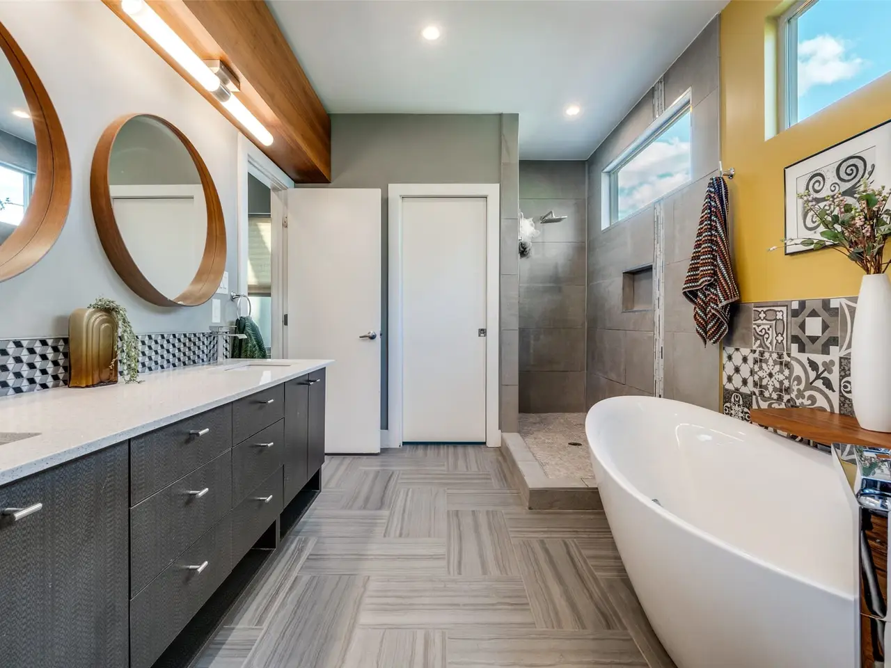 This modern showcase was completely rebuilt from the foundation up in 2018 by the owner builder. Open and modern floorplan has high ceilings and designer touches throughout the home, including a custom designed front door, modern staircase, see-through fireplace in the dining room, custom cabinets in the kitchen, custom finishes in all bathrooms and wood floors throughout. There's a covered front porch, an oversized, covered and picturesque deck in the rear and an open patio upstairs with a view! 2 bedrooms down and 3 bedrooms, including the primary, upstairs. There is an additional home office downstairs that is quiet and private. Two living areas allow everyone to have their own space! The home has two tankless water heaters and two HVAC systems, as well as solar panels on the roof which keep energy costs to a minimum.