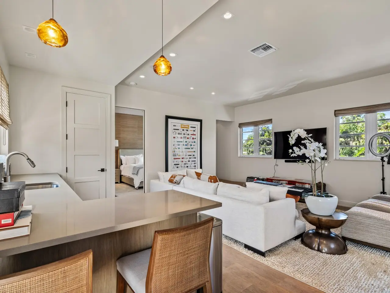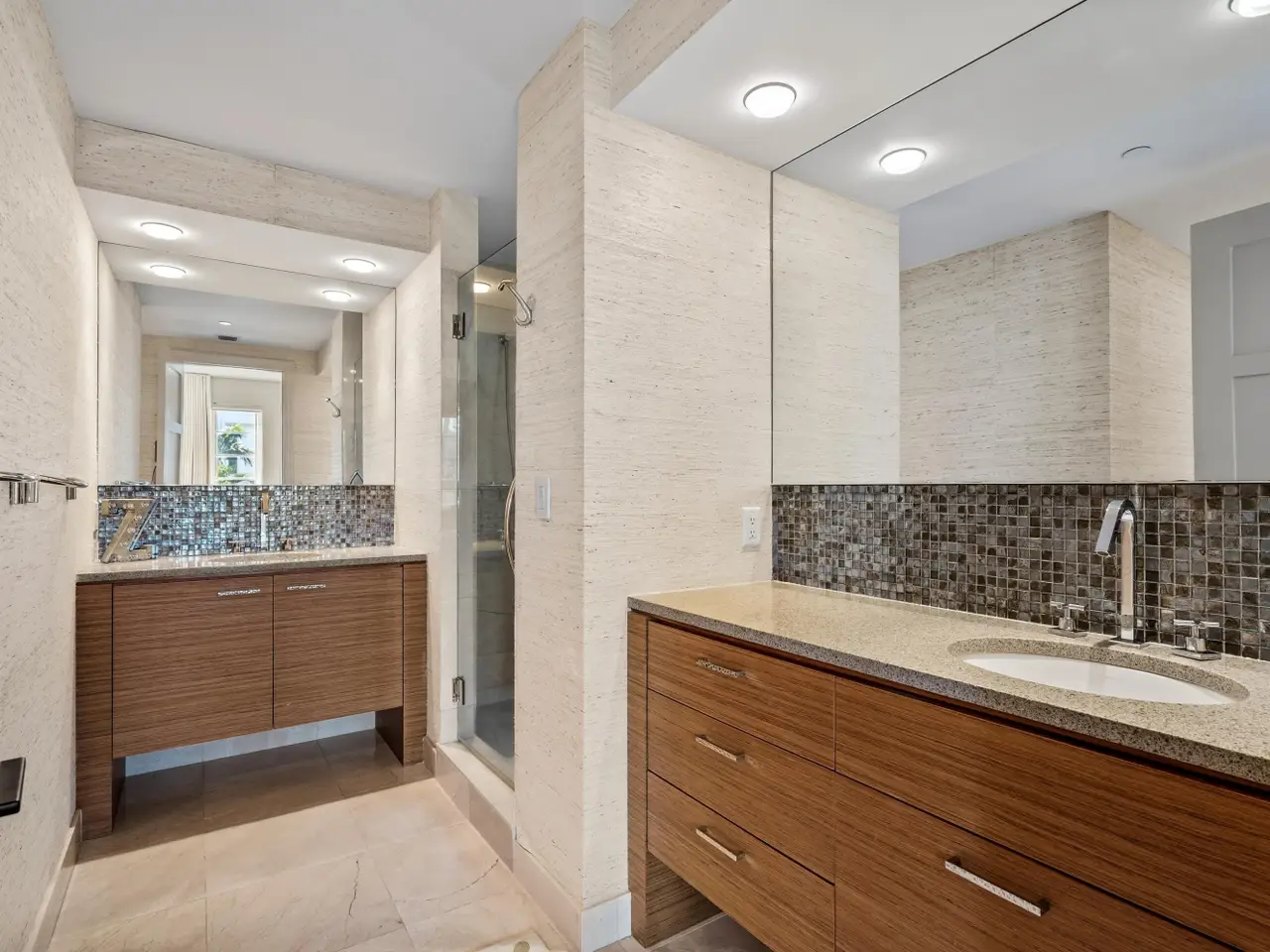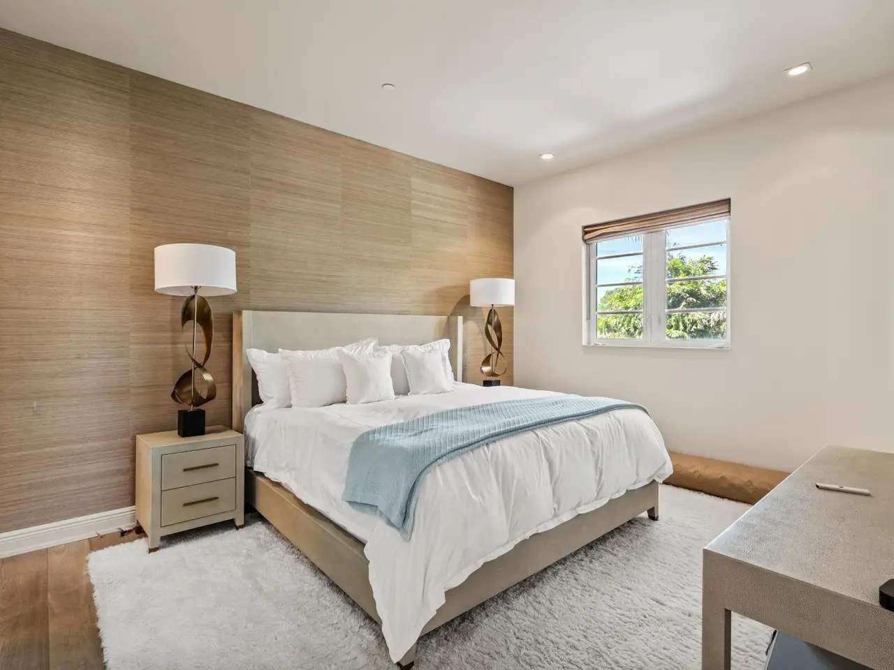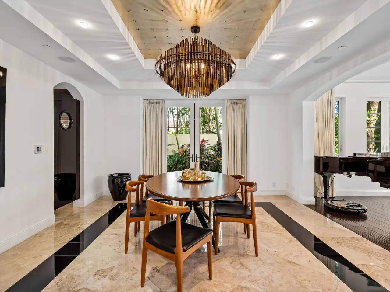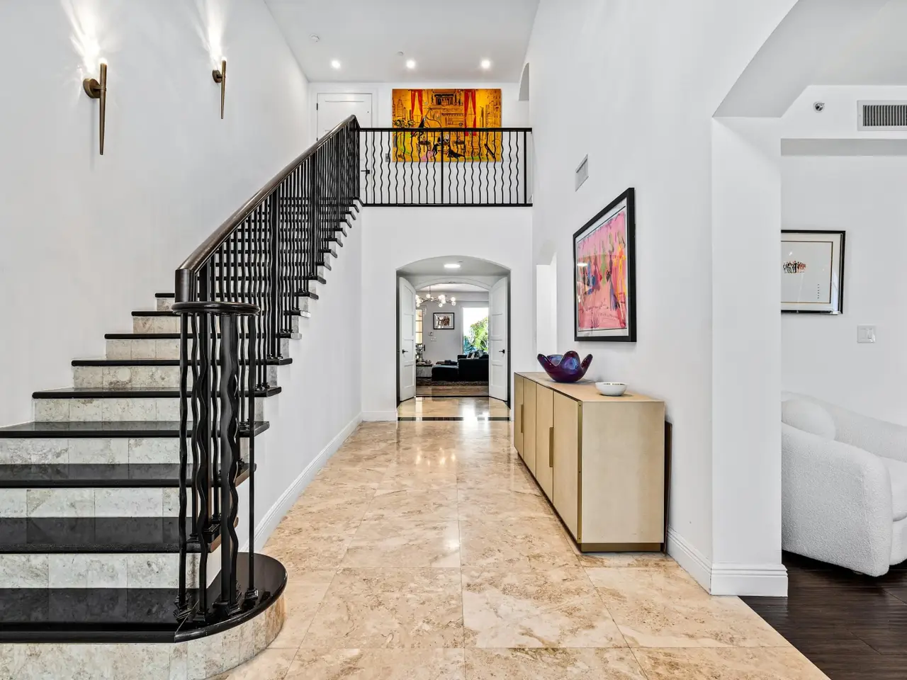 Palm Trail, Delray Beach, Florida. On tree-lined Palm Trail, across from the Intracoastal Waterway's shore, this is one of just six courtyard townhomes in an exclusive enclave offering resort-style living close to the beach, minutes from famous Atlantic Avenue's bistros and boutiques. Going beyond every expectation, this luxury townhome is an exquisite showplace by Leighton Design Group. Casual elegance is expressed with sophisticated modern ease in select finishes and bespoke elements that come together in a calm neutral palette with a textural look and touches of subtle glamour. Creating an estate-like environment in the Mediterranean-inspired architectural design, this light-filled end-position townhome opens to loggias around the private, tropically landscaped courtyard.