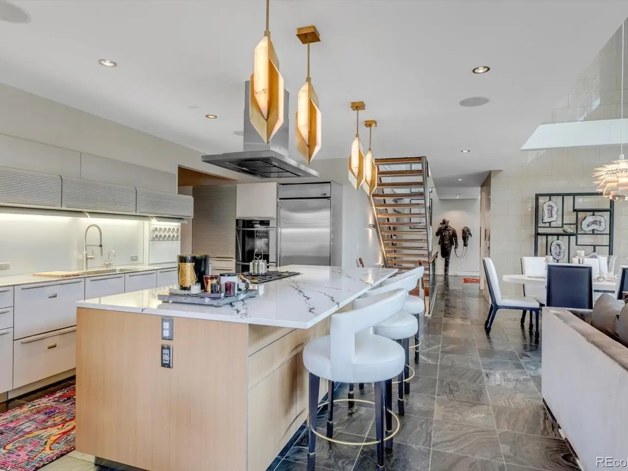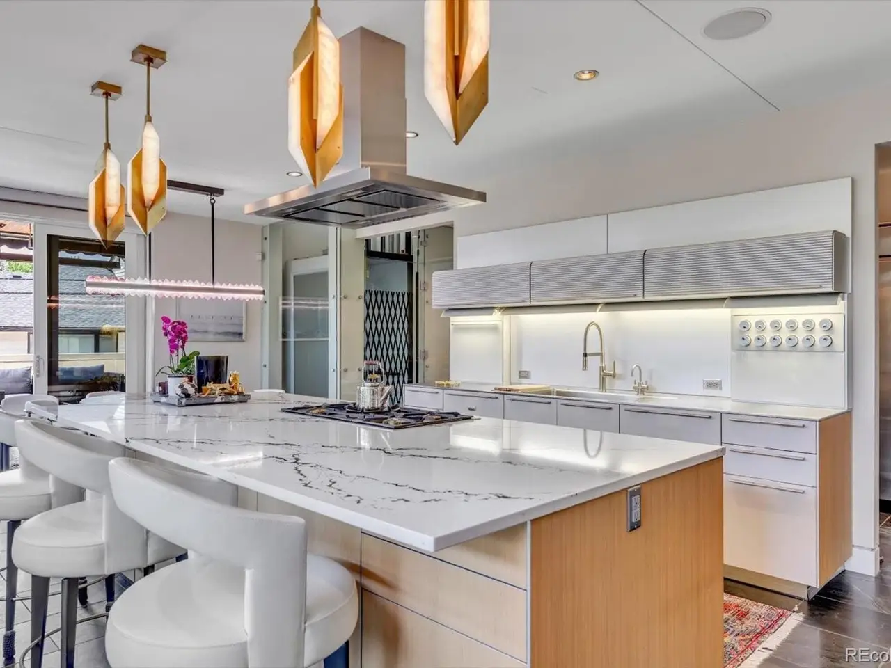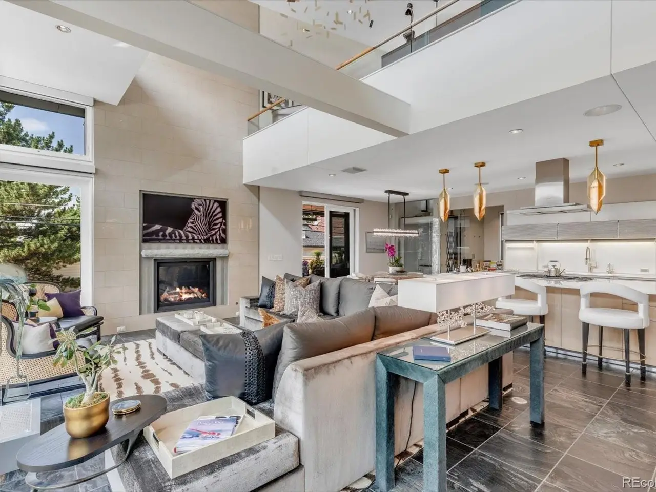This modern Cherry Creek masterpiece is a true work of art. Sleek, sophisticated and contemporary styling pairs with extraordinary design and exceptional craftsmanship. The home showcases a dramatic entrance, soaring 20-foot ceilings that flows to the great room with a three-story sunny south facing curtain wall. This open-concept layout seamlessly connects the great room anchored by a striking fireplace, honed slate flooring and exquisite finishes. At the heart of the home is a state-of-the-art Bulthaup kitchen, featuring a spacious center island, custom cabinetry, adjoining pantry, kitchen planning desk and room for casual dining. The west facing terrace, has heaters, automatic sunshade, built-in grill and ample space for outdoor dining and seating. Additionally on the main level are two guest bedrooms with en-suite baths, guest powder room and stylish home office with cozy fireplace and museum style glass display shelving. A modern style glass elevator offers access to all three levels. The upper-level luxurious primary retreat includes a sitting area, private covered balcony with mountain views and glass fire tube fireplace. The spa-inspired 7-piece bath with enclosed toilet & bidet, infra-red sauna, jetted tub, steam shower, sink island, custom walk-in closet, and dedicated laundry. The RARE walk-out lower level offers flexible living with glass wall sun-filled recreation rooms with side yard access, gym/4th bedroom with lock off closet & glass wall and a game room/5th bedroom with armoire storage. There is a three-quarter bath, second laundry room, ample storage & utility room. The two-car garage also accesses this level. Nice extras include a backup Generac Generator & exterior snow melt system. Located just blocks from the vibrant heart of Cherry Creek, this one-of-a-kind property is an iconic expression of modern Denver luxurydesigned for comfort, style, and spectacular living.