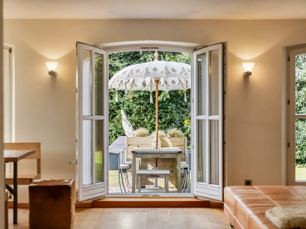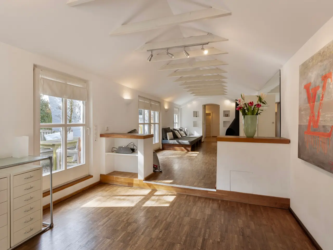 This charming country villa with a view of the Rhine is a truly unique property that is normally difficult to find in Düsseldorf, and not just because of its proximity to the Rhine. This enchanting property on a plot of around 1,730 m² and secluded from view consists of a main house and an extension and is a real gem that offers you peace, comfort and individuality on approx. 215 m² of living space. Built in 1949/50 as a director's villa and extended by an annexe in 1960, the property has combined stylish ambience and individual living quality since its extensive core renovation in 1997. The owners have preserved classic elements from the construction period with great sensitivity, optimized the floor plans and thus preserved the property's incomparable charm. The wooden lattice windows with round arches, the refurbished wooden floorboards and the window blinds are just a few examples. The view of the Rhine and the adjacent fields are constant companions and offer a feeling of space and freedom. Incidentally, the development plan provides for a buildable area of approx. 690 m² with two full storeys, which offers many options ranging from an extension of the house to a completely new development of the property. As soon as you walk through the entrance gate, the spacious and well-kept garden immediately catches the eye, at the end of which, accessible via the cobblestone driveway, lies your new home. Parallel to the extension and in front of the entrance to the house, the quaint courtyard terrace awaits you, which you also use to enter the entrance to the house. From here, you have a smooth transition via the hallway into the living/dining area with its open kitchen, which offers a view of the rear garden and the second terrace area through the floor-to-ceiling windows. Another little oasis surrounded by greenery. In addition to the staircase to the upper floor, you can access the extension from here. A large storage room, a hallway with practical built-in units and another beautiful living area with a fireplace follow next. A bedroom with a small dressing room and a bathroom complete this area of the house, which can also be used as a granny apartment. Back in the entrance area, the guest WC and utility room complete the floor plan on this level. On the upper floor of the main house are the two bedrooms and a bathroom en suite off the master bedroom. The exclusive location not far from the Rhine is particularly noticeable here, as you can enjoy a fantastic view of the fields and the Rhine. The paved area in front of the extension offers space for several cars and a further room accessible from the outside also provides useful storage space. The development plan here offers the possibility of building on a plot of approx. 690 m² with two full storeys plus a staggered storey, thus creating around 1,210 m² of floor space in a direct Rhine location with corresponding views. A corresponding extension to the existing building is also easily possible here. You are welcome to make an appointment to see this rare opportunity for yourself. We look forward to seeing you!