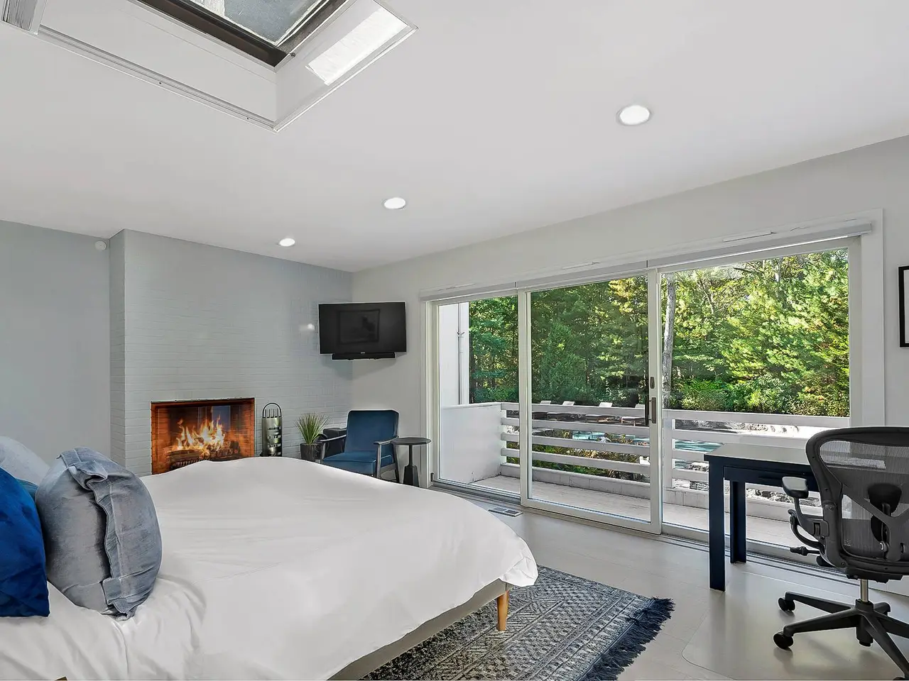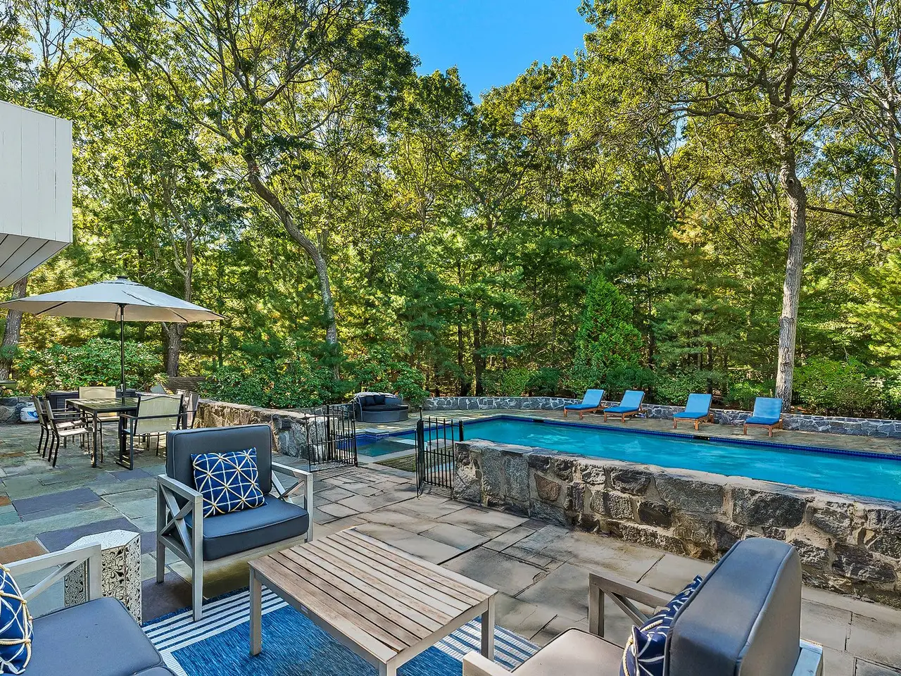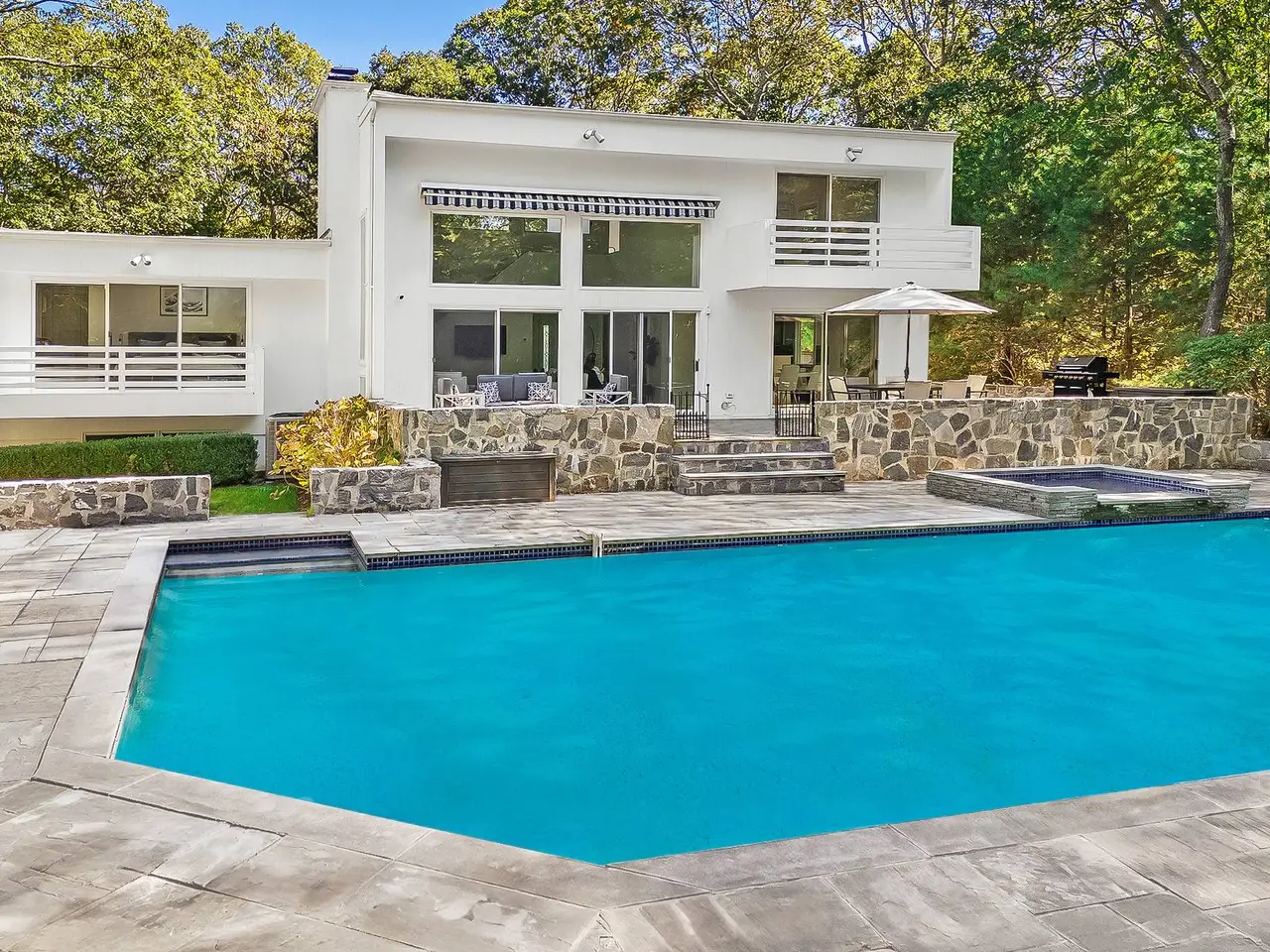 This gated modern contemporary residence, designed by renowned architect Myron Shulman, is a rare Hamptons offering that combines modern elegance with timeless sophistication. A sun-filled entryway opens to an expansive great room with soaring double-height ceilings and glass sliders, creating a seamless connection between indoor and outdoor living. Ideal for entertaining, the open layout flows effortlessly to the landscaped grounds and the 25' x 50' heated saltwater Gunite pool. The first-floor primary suite offers ample space with an ensuite bath and a private deck overlooking the lush, mature gardens. A versatile guest suite or office with a full bath also serves the main level. Upstairs, two well-appointed bedrooms-one with a private balcony-share a refined bathroom. The finished lower level provides additional living space and a private gym, completing this exceptional home. Located just moments from Sammy's Beach and several other private bay beaches, as well as East Hampton Village, this property encompasses the Hampton's lifestyle-private, tranquil, easily accessible to fun outdoor activities, high-end village shopping, and fine dining.