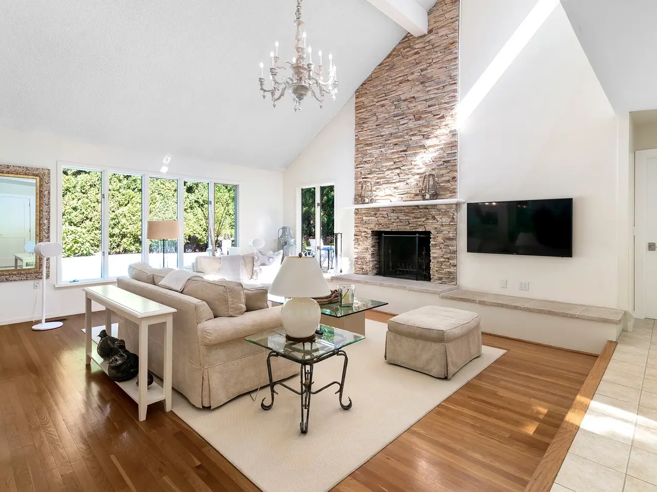 Located in East Hampton, less than three and a half (approximate) miles to the Atlantic Ocean at Main Beach, this three bedroom and two and a half bath Hamptons contemporary home embodies casual sophistication and a truly modern beach lifestyle. Situated in a convenient East Hampton village fringe location, the home features a vaulted living room and a breathtaking two-story stone fireplace, creating a warm and inviting atmosphere. The open-concept design seamlessly connects the living area to the dining room and kitchen, creating a perfect setting for entertaining. Lined with glass sliders, the great room offers panoramic views of the pool area and the ability to effortlessly transition between indoor and outdoor spaces. The first-floor primary en suite bedroom has a double height ceiling and a cozy fireplace, setting the tone for ultimate relaxation. Recently renovated, the new bath exudes modern opulence with a spa-like open shower. On the second level, two additional bedrooms along with a full bath provide ample space and privacy for guests. One of these bedrooms offers a terrace overlooking the pool area, offering a tranquil spot to unwind while enjoying the beautiful surroundings. The expansive deck provides the perfect space for outdoor dining, sunbathing, or simply enjoying the heated pool and unique blend of luxury, comfort, and privacy.